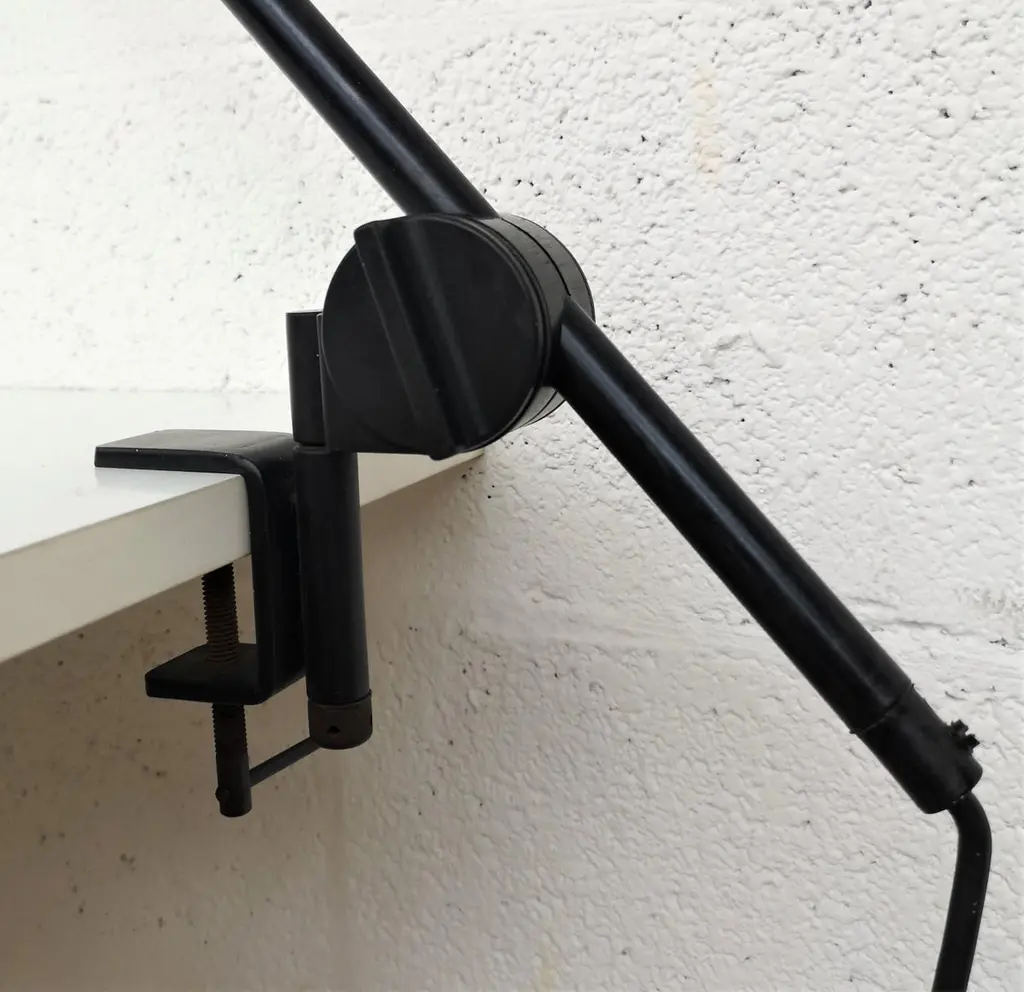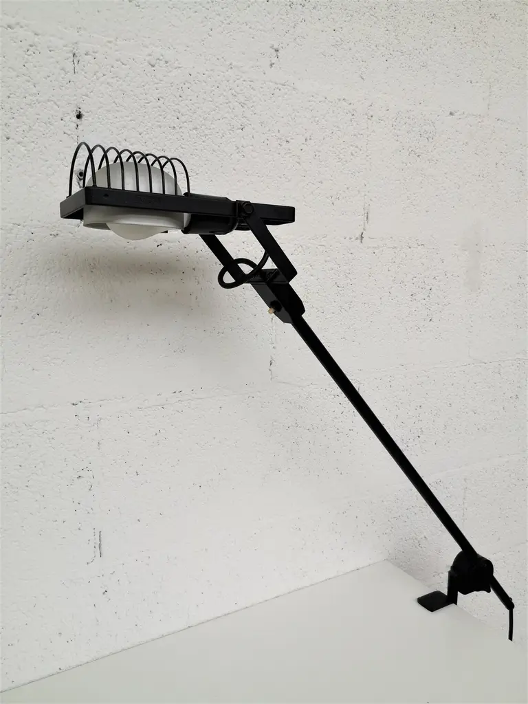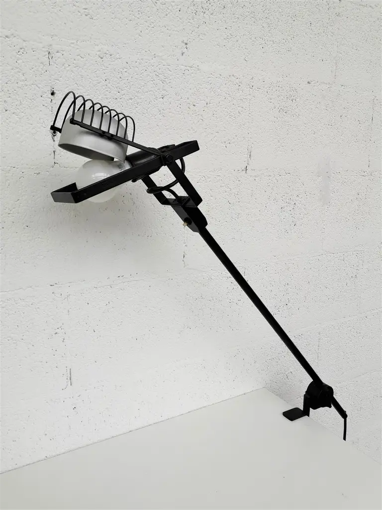 Very rare Table lamp Sintesi Morsetto designed by Ernesto Gismondi and produced by Artemide 1970s.This is the arm version with clamp for fixing.Painted metal structure, aluminum diffuserFounded in 1960s, Artemide is one of the most known illumination brands in the world. Known for its "The Human Light" philosophy.Artemide is one of the most known illumination brands in the world. Known for its "The Human Light" philosophy, Artemide boasts high skills in light design and innovation, with products originating from research and high-quality manufacturing.The company filed lots of patents on inventions in time for the development of innovative technological, mechanical, and opto-electrical solutions (10 patents filed in 2016 alone). Artemide has contributed to the history of the international design with products like Eclisse (1967, from Vico Magistretti), Tolomeo (1989, from Michele De Lucchi and Giancarlo Fassina), Pipe (2004, from Herzog & De Meuron) and the IN-EI Collection (2014, Issey Miyake), all showed at the Compasso D'oro Awards.