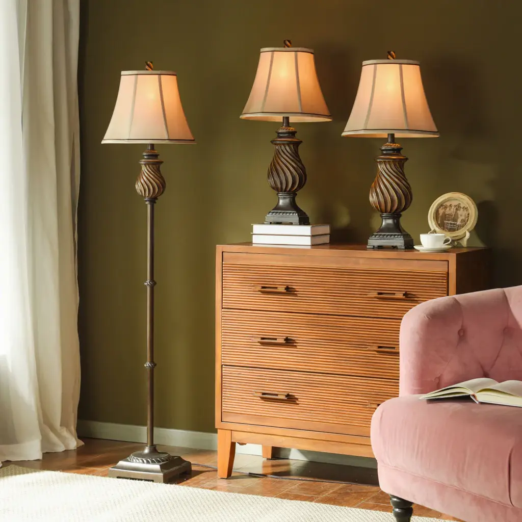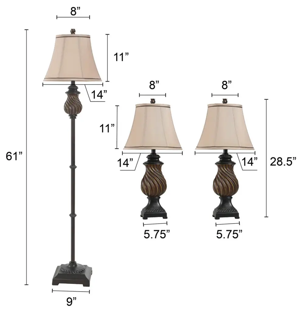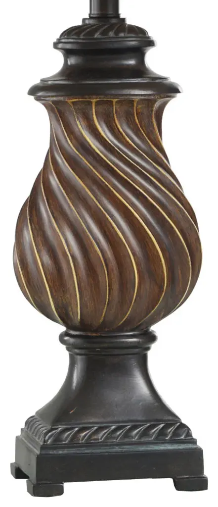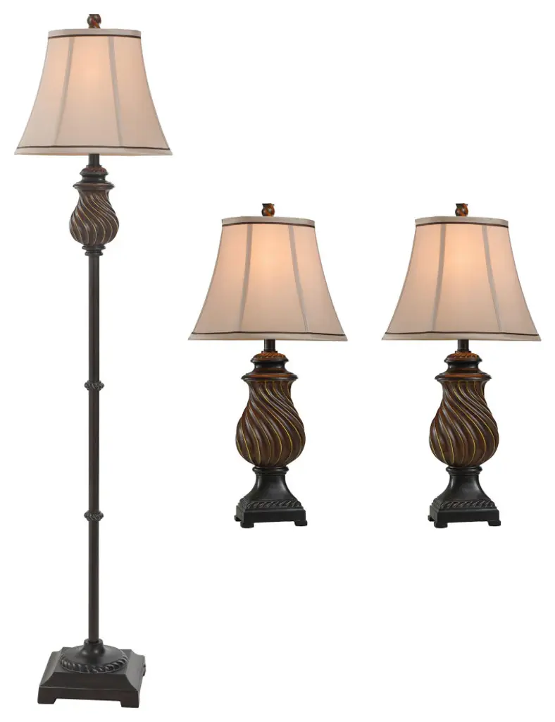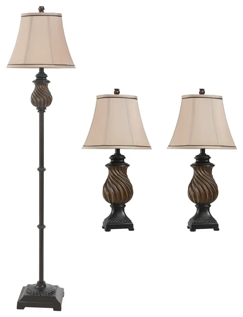 Accent your decor with this lovely Table Lamp.Features: Finish: ToffeeShade Finish: Natural LinenMaterial: PolyShade Material: FabricVoltage: 120VWattage: 60Safety Rating: Dry Location - This item is rated for dry locations, meaning it can be used in an indoor area that is not normally subject to dampness. May include a location subject to temporary dampness provided ventilation is adequate to prevent any accumulation of moisture such as the bathroomBulb(s) Included: NoBulb Type: IncandescentNumber of Bulbs: 3Due to lighting and monitor differences, actual colors and finishes may vary slightly from what appears online.