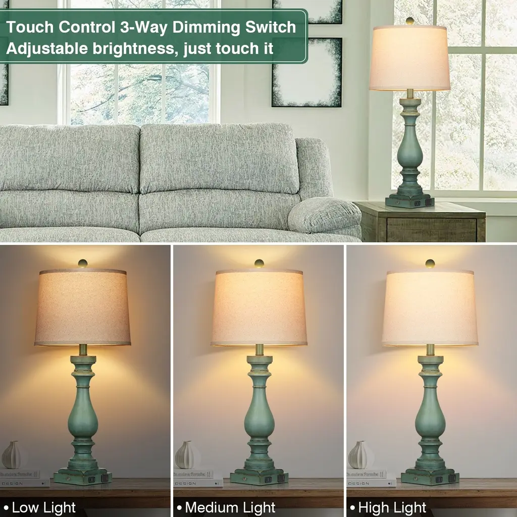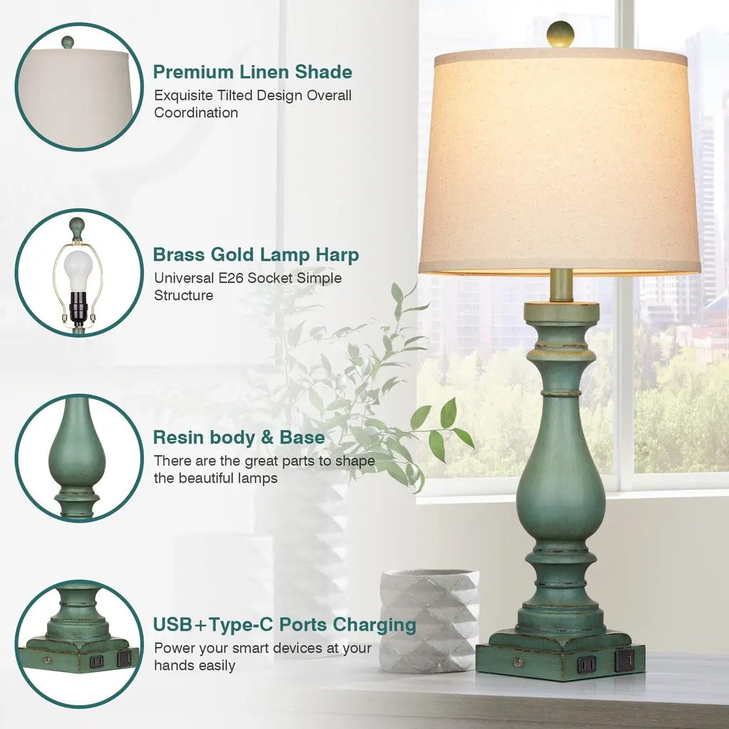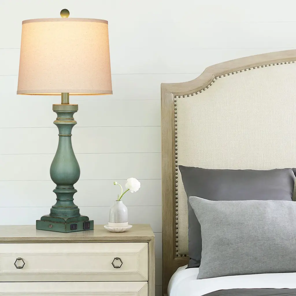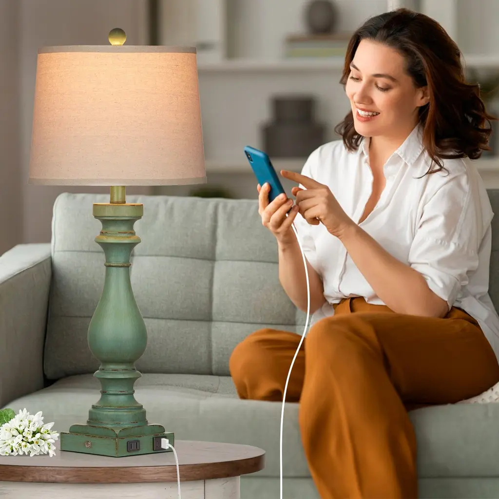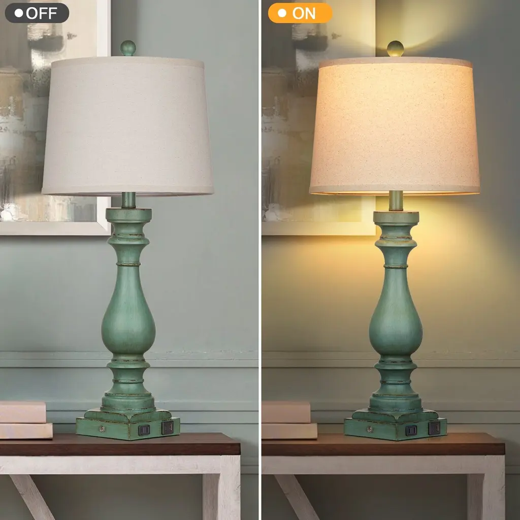 The type of green resin table lamps are higher than the traditional ones. It is up to 28.5 inches. It comes with a tilted shade. The shade is knockdown design. It easy to replace, care and assemble. Its high lamp body can enhance the visuals of the lighting. It includes 2 LED bulbs. Any bulb is featured with 800 Lumens, 2700K warm light and E26 base. Standard E26 holder is convenient for you to replace it with various LED bulbs by your real needs without extra demands. Its switch is placed on the lamp base. Switch supports 3-Way dimming, you can get more lighting fun with it according to the different touching times to control it. Furthermore, it equipped with more modern technologies for smart devices such as universal USB and type-C charging ports. Especially, it also has an AC outlet. Those can power your devices more convenient than before even you forget your adapter.Overview of features: