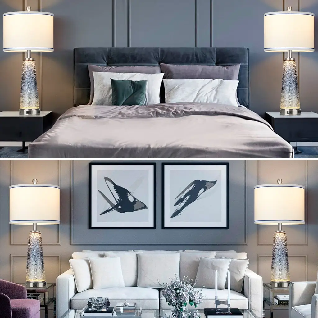 Glass table lamps with nightlight 2in1. The top light and the nightlight are controlled by the different switch. The top light switch is a ON/OFF rotary switch. The nightlight switch is a 2-Way touch switch.The shade is made of linen and is knockdown design. It's easy to clean and maintain.The LED bulbs are included. They are compatible for standard E26 lamp holder. You can replace it with various bubls(within 60W) what you like during use.The lamp body is covered by the glass. When you turn it OFF, the lamp body is light blue. It'll will show you more special colored visual experience when you turn it ON.The lamp base comes with more features, such as the touch switch for nightlight, the charging ports(USB + type-C) and an AC outlet.They can power your smart devices conveniently at your hand even you forget your adapter. Additionaly, the lamp base has a non-slip mat. It's silent when you move it.Overview of features:- Set of 2 glass table lamps with nightlight design 2in1(with non-slip mat)- Lamp body with crafted concave convex texture,enhance visual experience- Standard E26 compatible lamp holder, Easy to install and replace it with various LED bulbs- Drum style warm tone knockdown fabric shade, easy to clean and maintain- Universal charging ports(USB, type-C) and an AC outlet, power smart devices charging conveniently at your hand- Lamp shade dimension - 12'' x 12'' x 9''(L x W x H)- Lamp dimensions 12'' x 12'' x 26'' (L x W x H)