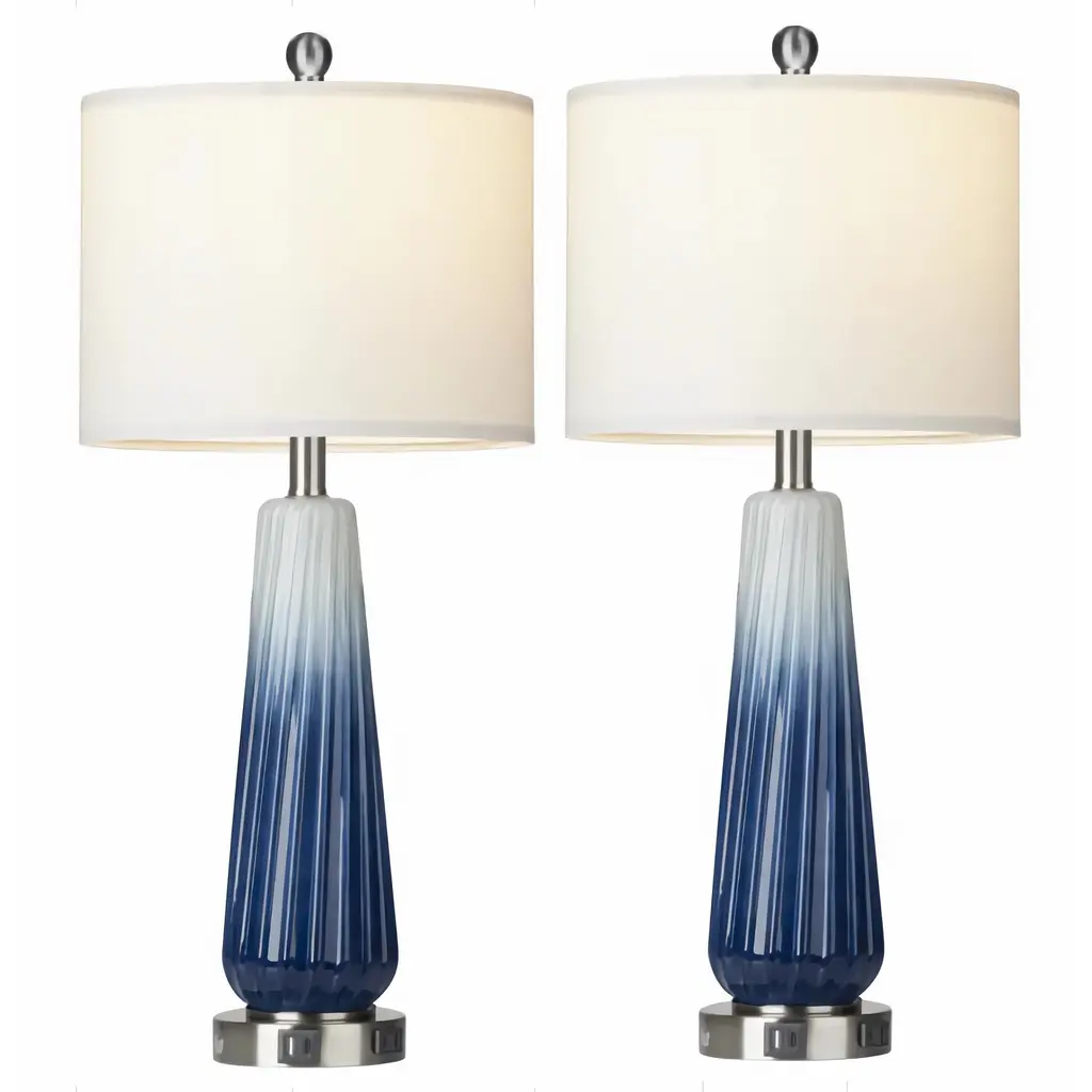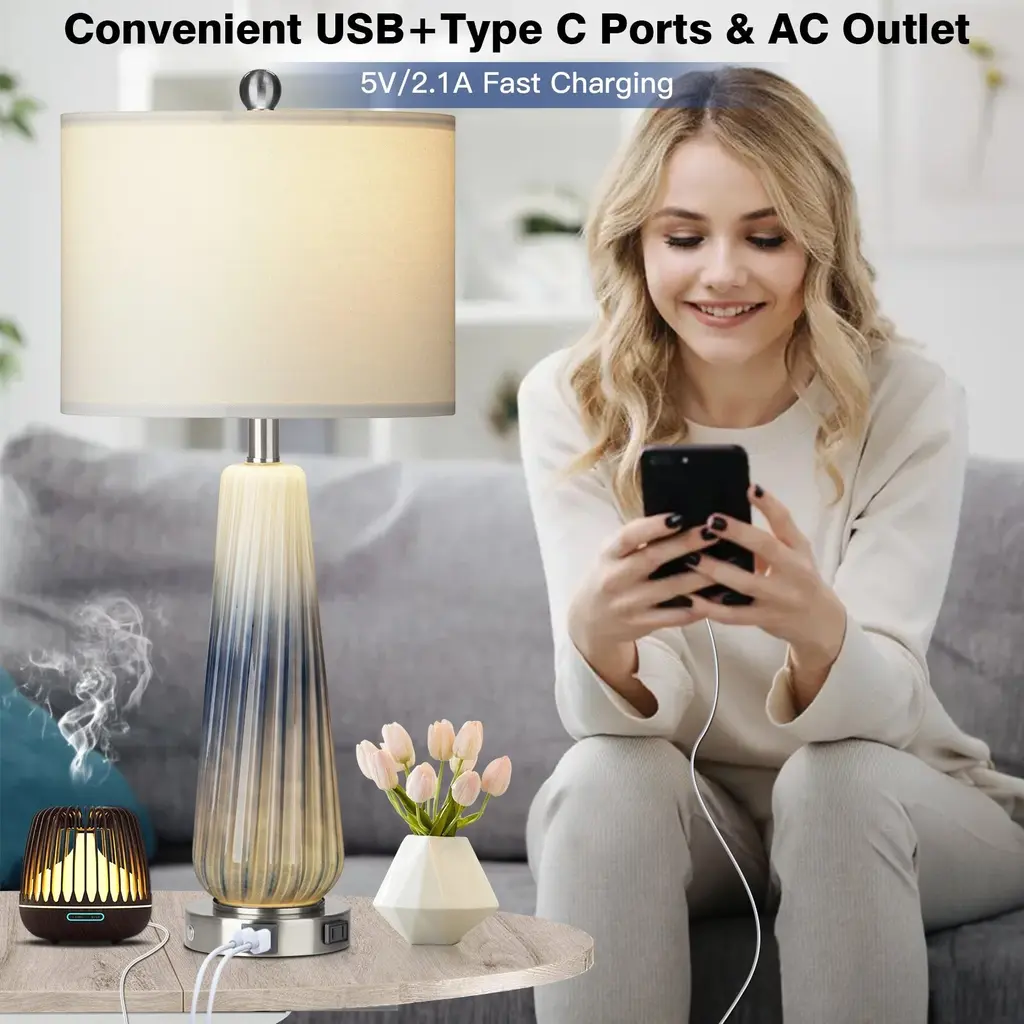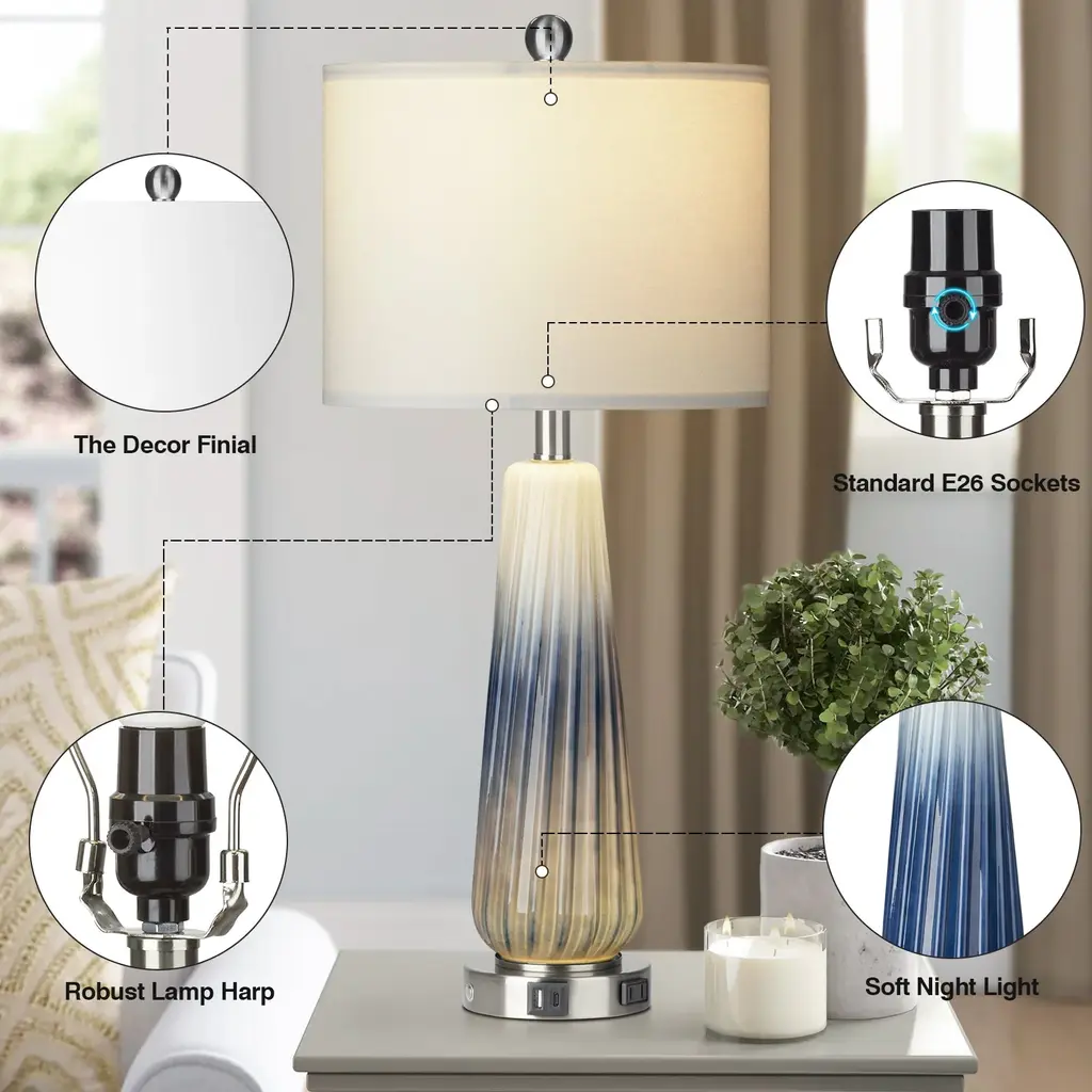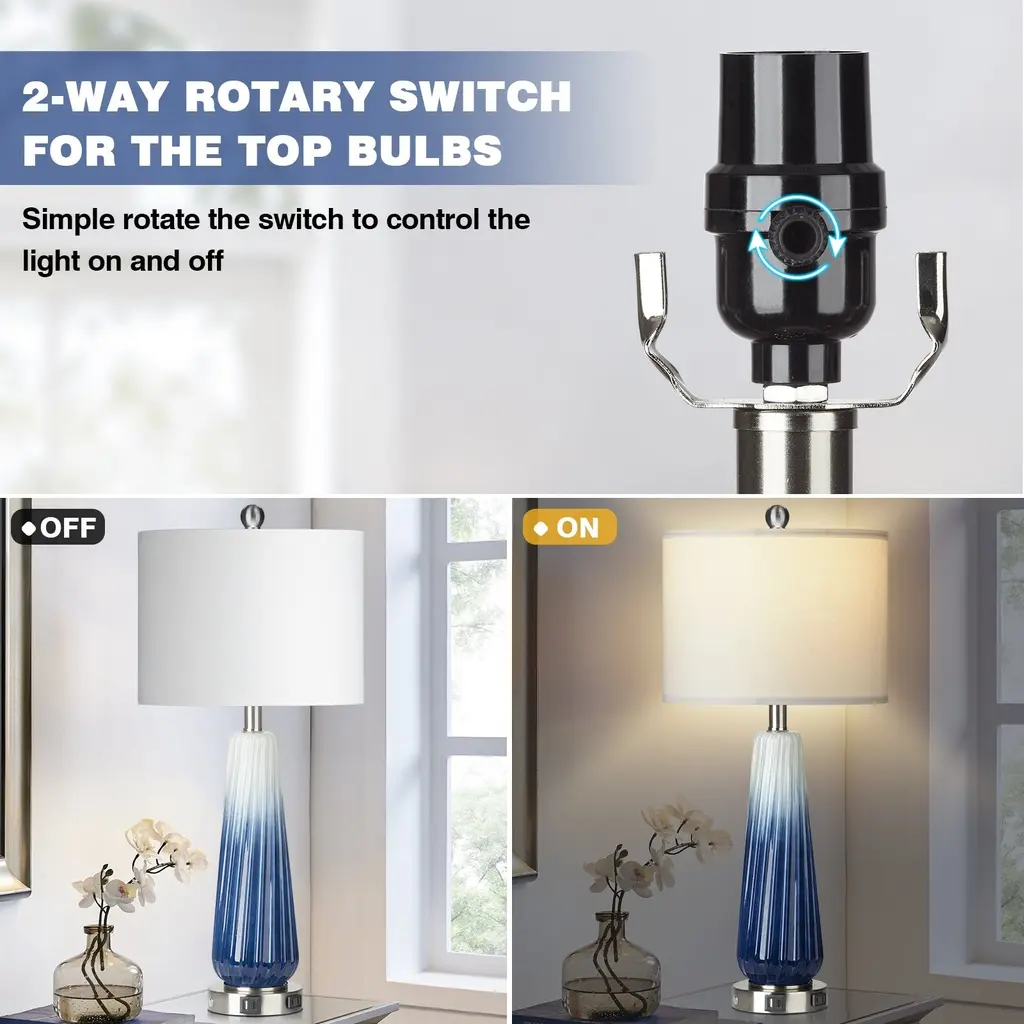 Set of 2 blue table lamps nightlight 2in1.The table lamp has two main parts, one is top light,the other is nightlight. And both of them are controlled with different types of switch. The top light switch is rotary ON/OFF switch. The nightlight switch is 2-Way touch switch. And they're won't be affected by each other. The LED bulbs are included(800 Lumen, 2700K). The lamp holder is compatible with E26 standard. You can easily to replace it. About the lamp body, it is covered by glass with ripple style.Turn it OFF, you will see the verdure lamp body. But when you turn it ON, the comfortable and natural blue will fill your eyes. Additionaly, the lamp base comes with extra universal charging ports(USB, Type-C) and AC outlet. Then can power your smart devices at your hands even you forget your adapters.Overview of features:- Set of 2 blue glass table lamps nightlight 2in1(with non-slip mat)- Glass lamp body with ripple style, enhance visual experience- The lamp body covered a nightlight.-The lamp body visual effect is blue when turn nightlight OFF-The lamp body visual effect is brown when turn nightlight OFF-The lampshade visual effect is white when turn top light OFF-The lampshade visual effect is beige when turn top light ON- Standard E26 compatible lamp holder, Easy to install and replace it with various LED bulbs- Drum style white tone knockdown linen shade, easy to clean and maintain- Universal charging ports(USB, type-C) and an AC outlet, conveniently power smart devices charging at your hand- Lamp shade dimension - 12'' x 12'' x 9''(L x W x H)- Lamp dimensions 12'' x 12'' x 27'' (L x W x H)
