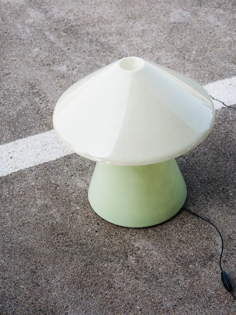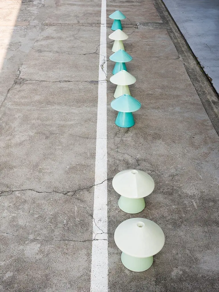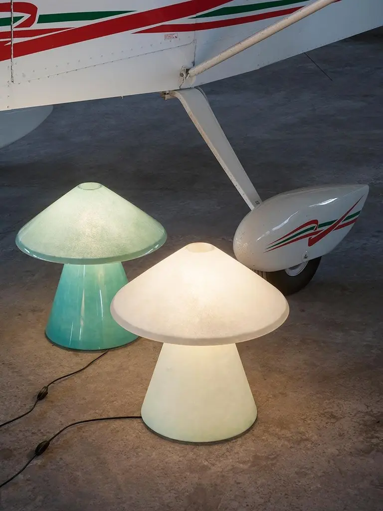 Shiny or matt figerglass lamp.As envisioned by the great master, Umberto Riva, the A.D.A. lamp takes shape, as often occurs, from other forms. Then, little-by-little, during the design and engineering stages, it is transformed and, in some regards, simplified, until it achieves its final look, reminiscent of the archetype of a table lamp. Uncomplicated, the lamp’s anatomy is formed by two truncated cones joined by a plate. Its strength derives from the material: tinted fiberglass which, illuminated from within, is translucent and offers a glimpse of the fibers from which it is made, lending texture to the light. The name A.D.A. draws a parallel between the shape of the object and the sound of the word. Made up of two A’s, Ada is the shortest symmetrical feminine name, just as the lamp’s two conical structures are a geometrical play on the same letter.