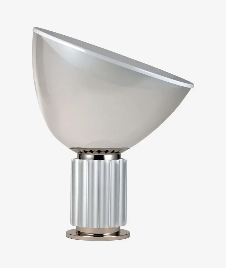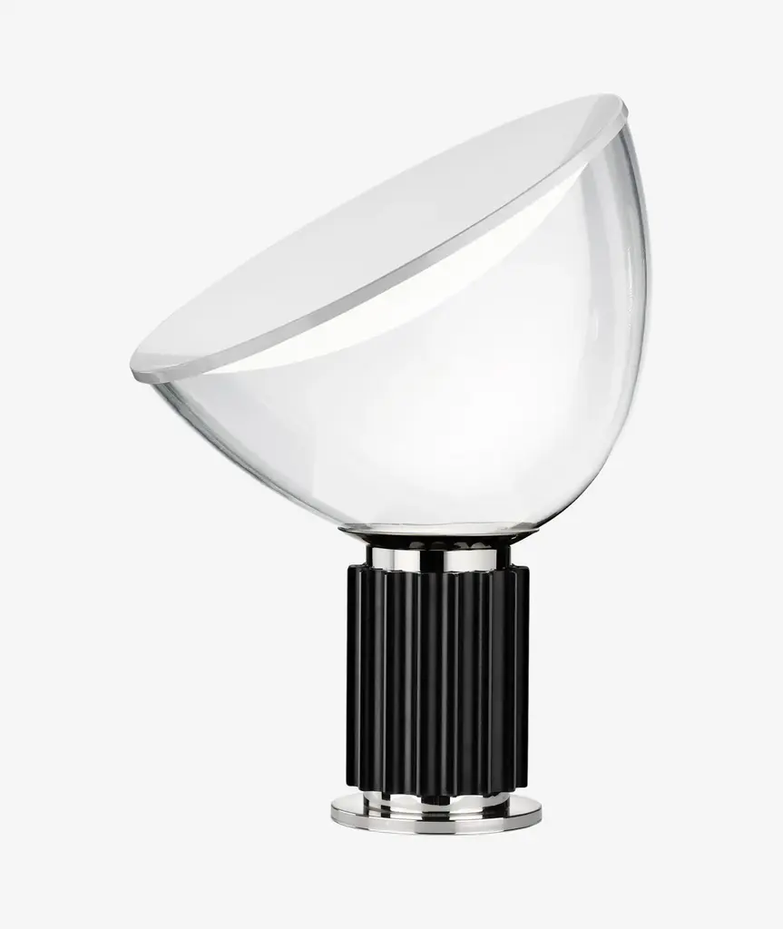 The Castiglioni brothers often created designs that challenged our perspective, and the Taccia, which gives the illusion of an upside-down hanging lamp, is an inspired example of that. This smaller version is approximately half the size of the original design created in 1962. It has a painted aluminum reflector that is gloss white on the inside and matte white on the outside. The diffuser is transparent blown glass and can change direction. The body is available in matte black or naturally anodized extruded aluminum. The base is nickel-plated ABS and PC (polycarbonate). It features an electric cable that measures 190-centimeters and includes a dimmer switch on the cord. Light adjustment can be customized between 10-100%. The plug-in power supply includes interchangeable plugs. Inspiration behind the design: Using a minimalist approach, Achille and Pier Giacomo Castiglioni used perspective to change the way we see everyday objects.