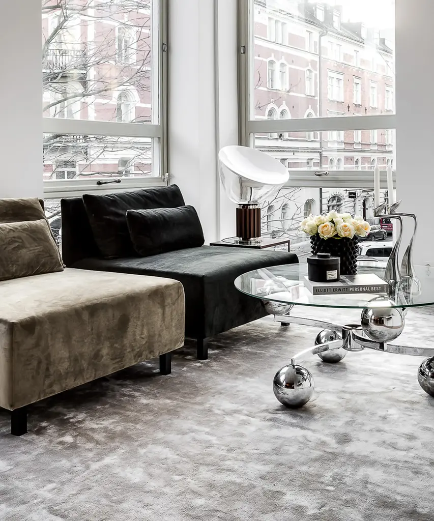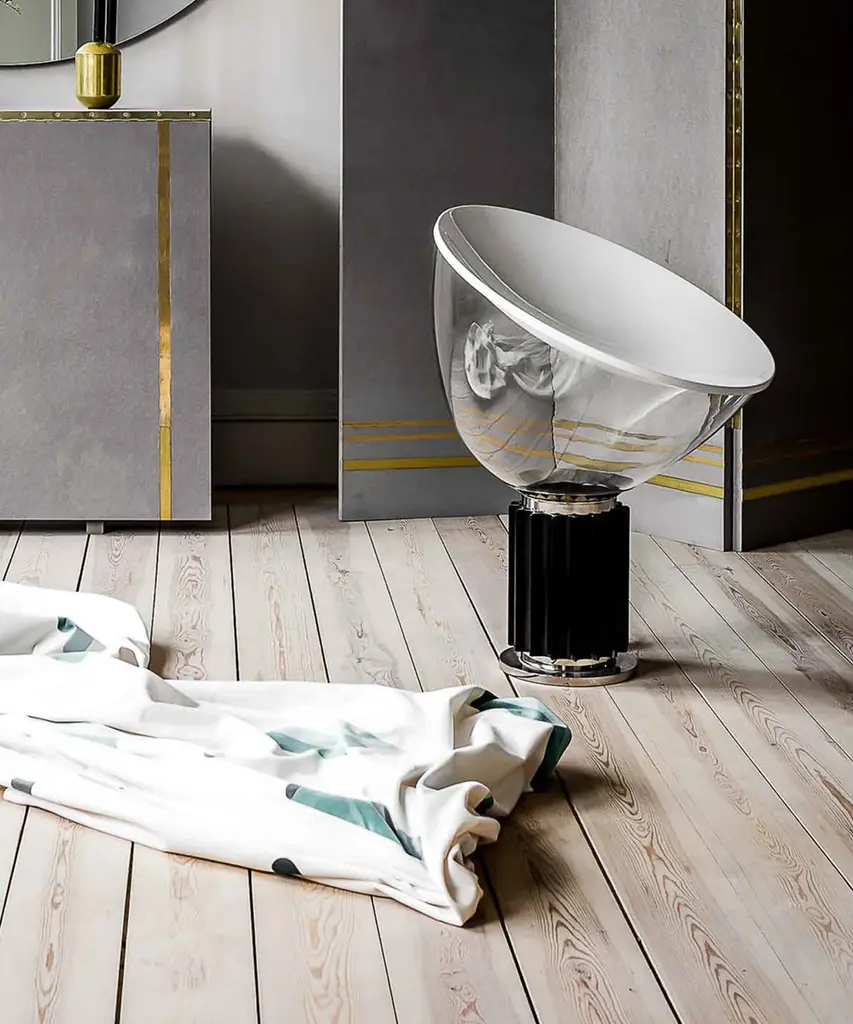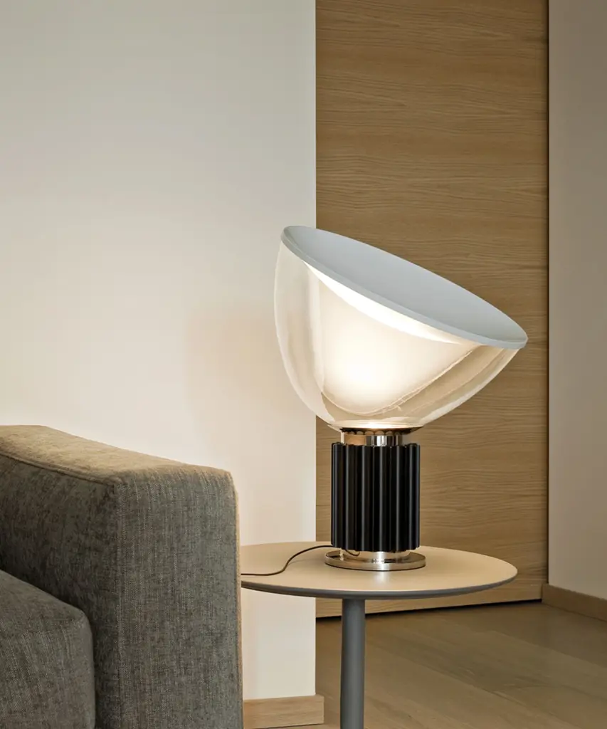The Castiglioni brothers often created designs that challenged our perspective, and the Taccia, which gives the illusion of an upside-down hanging lamp, is an inspired example of that. This smaller version is approximately half the size of the original design created in 1962. It has a painted aluminum reflector that is gloss white on the inside and matte white on the outside. The diffuser is transparent blown glass and can change direction. The body is available in matte black or naturally anodized extruded aluminum. The base is nickel-plated ABS and PC (polycarbonate). It features an electric cable that measures 190 centimeters and includes a dimmer switch on the cord. Light adjustment can be customized between 10-100%. The plug-in power supply includes interchangeable plugs. Inspiration behind the design: Using a minimalist approach, Achille and Pier Giacomo Castiglioni used perspective to change the way we see everyday objects. This authentic design is produced in Italy exclusively by Flos.