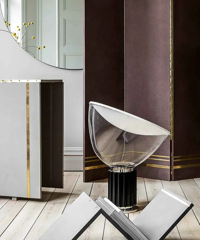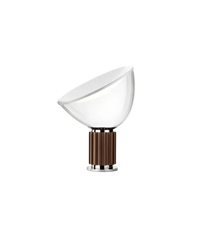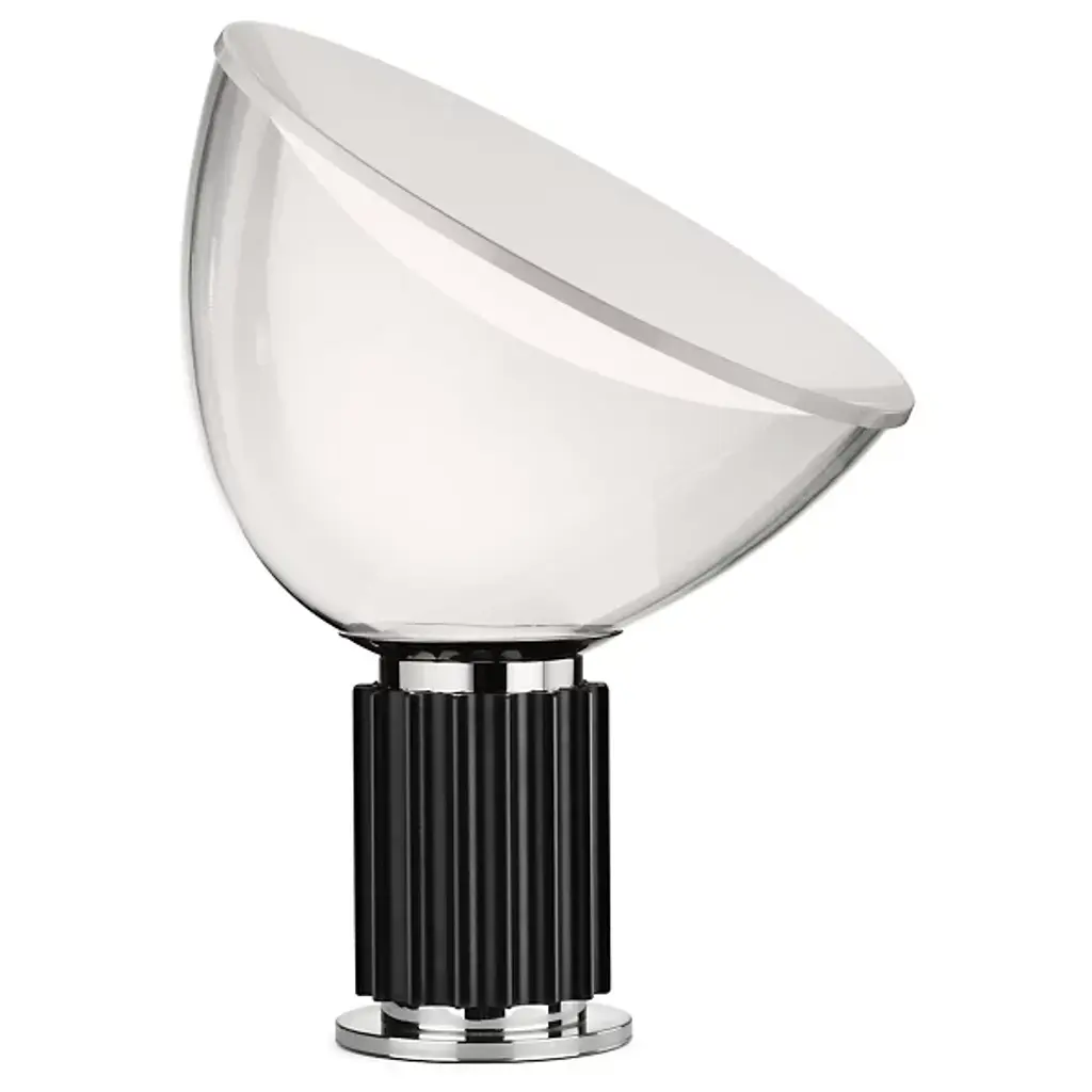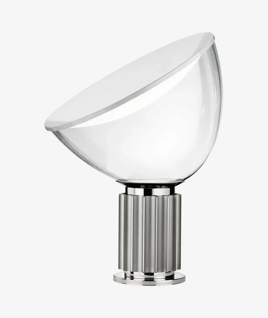 The Castiglioni brothers often created designs that challenged our perspective, and the Taccia, which gives the illusion of an upside-down hanging lamp, is an inspired example of that. This smaller version is approximately half the size of the original design created in 1962. It has a painted aluminum reflector that is gloss white on the inside and matte white on the outside. The diffuser is transparent blown glass and can change direction. The body is available in matte black or naturally anodized extruded aluminum. The base is nickel-plated ABS and PC (polycarbonate). It features an electric cable that measures 190 centimeters and includes a dimmer switch on the cord. Light adjustment can be customized between 10-100%. The plug-in power supply includes interchangeable plugs. Inspiration behind the design: Using a minimalist approach, Achille and Pier Giacomo Castiglioni used perspective to change the way we see everyday objects. This authentic design is produced in Italy exclusively by Flos.