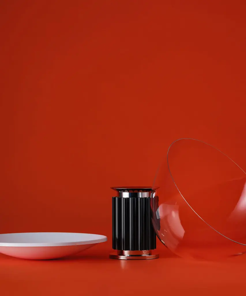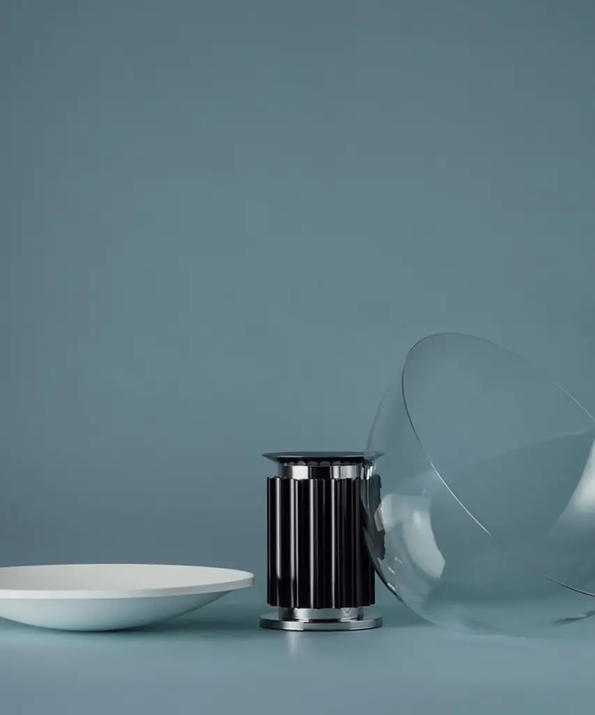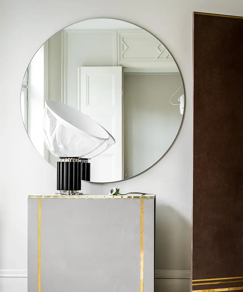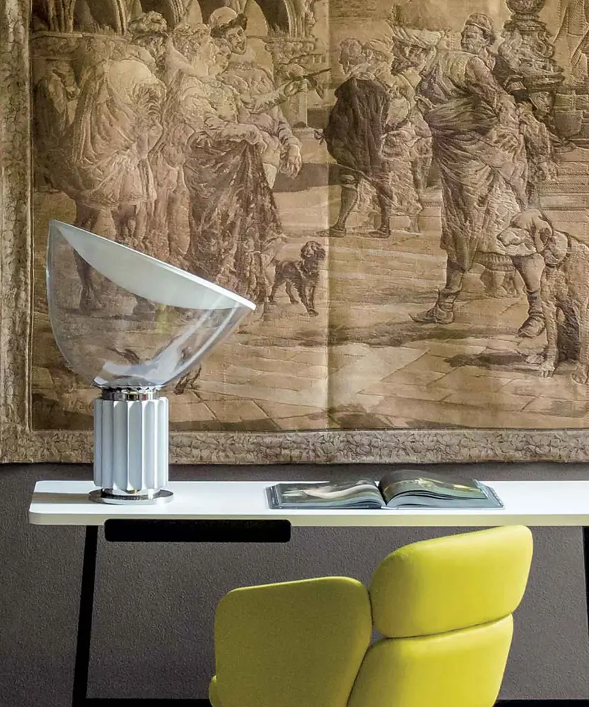 The Castiglioni brothers often created designs that challenged our perspective, and the Taccia, which gives the illusion of an upside-down hanging lamp, is an inspired example of that. This smaller version is approximately half the size of the original design created in 1962. It has a painted aluminum reflector that is gloss white on the inside and matte white on the outside. The diffuser is transparent blown glass and can change direction. The body is available in matte black or naturally anodized extruded aluminum. The base is nickel-plated ABS and PC (polycarbonate). It features an electric cable that measures 190 centimeters and includes a dimmer switch on the cord. Light adjustment can be customized between 10-100%. The plug-in power supply includes interchangeable plugs. Inspiration behind the design: Using a minimalist approach, Achille and Pier Giacomo Castiglioni used perspective to change the way we see everyday objects. This authentic design is produced in Italy exclusively by Flos.
