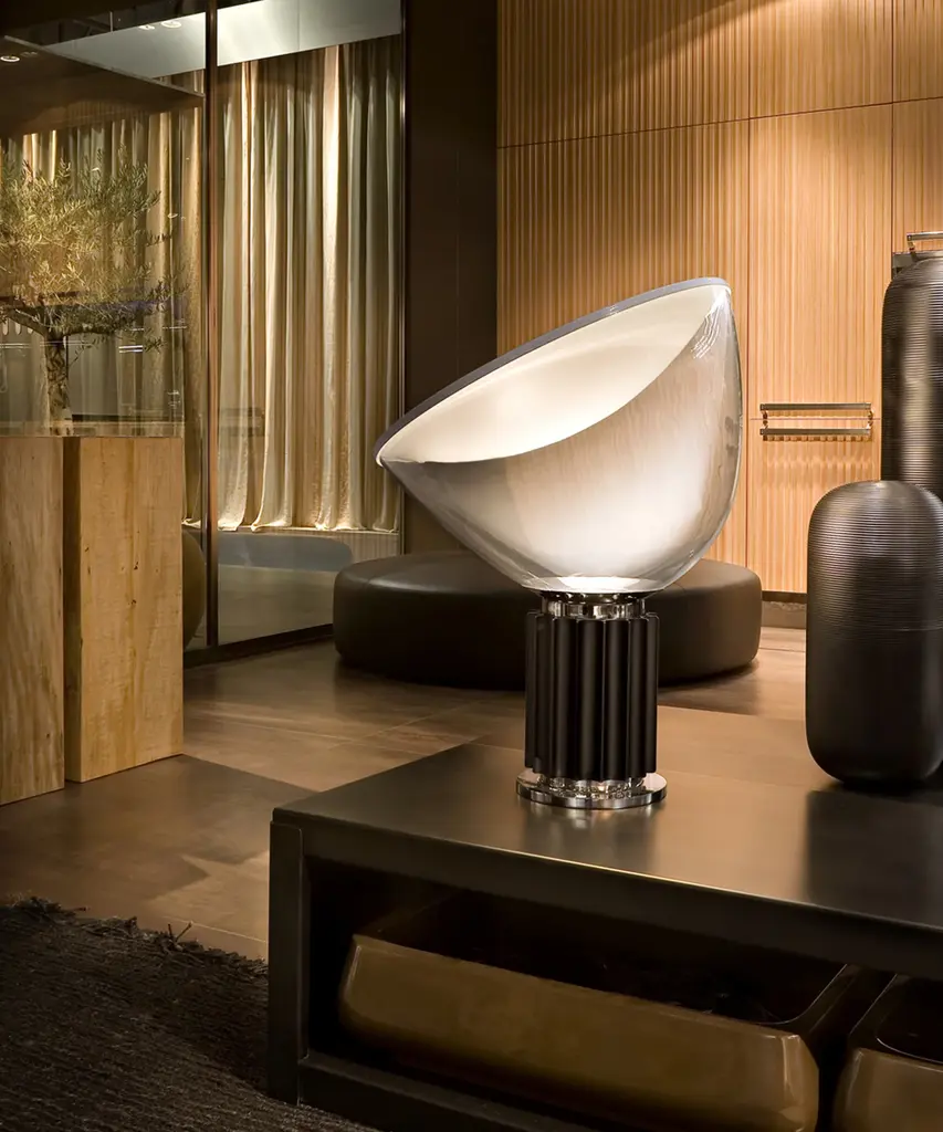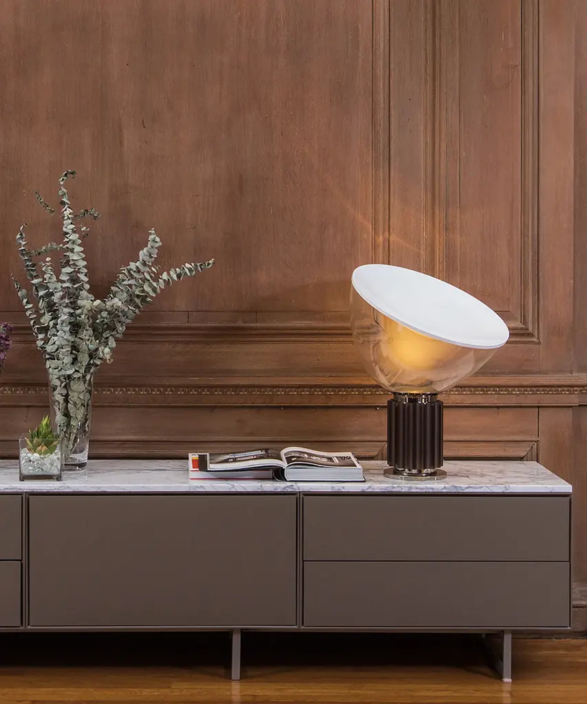 The Castiglioni brothers often created designs that challenged our perspective, and the Taccia, which gives the illusion of an upside-down hanging lamp, is an inspired example of that. This smaller version is approximately half the size of the original design created in 1962. It has a painted aluminum reflector that is gloss white on the inside and matte white on the outside. The diffuser is transparent blown glass and can change direction. The body is available in matte black or naturally anodized extruded aluminum. The base is nickel-plated ABS and PC (polycarbonate). It features an electric cable that measures 190 centimeters and includes a dimmer switch on the cord. Light adjustment can be customized between 10-100%. The plug-in power supply includes interchangeable plugs. Inspiration behind the design: Using a minimalist approach, Achille and Pier Giacomo Castiglioni used perspective to change the way we see everyday objects. This authentic design is produced in Italy exclusively by Flos.
