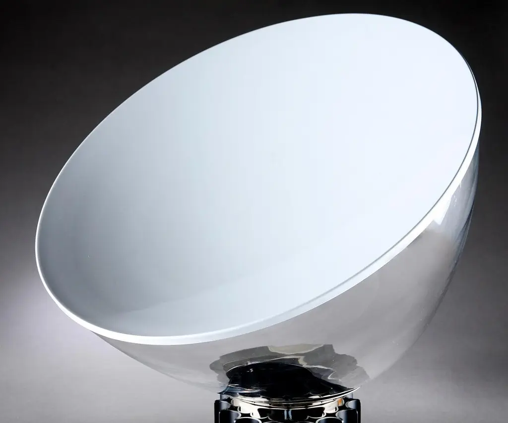 Achille Castiglioni and Pier Giacomo Castiglioni for Flos. Table lamp model Taccia, loose adjustable glass screen, aluminum base. Designed 1962. Manufactured by Flos with label from here. H. ca. 65 Ø 50 cm. Minor traces of wear.