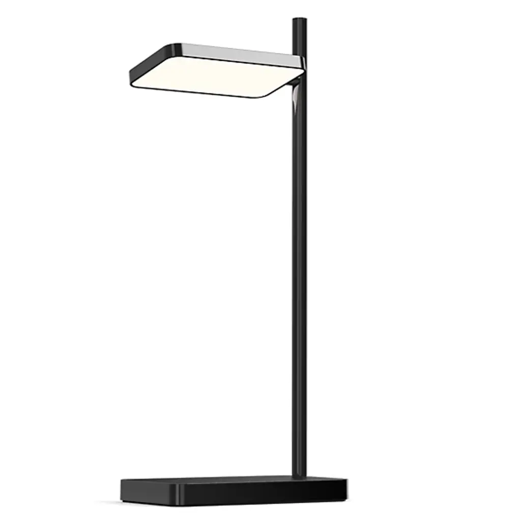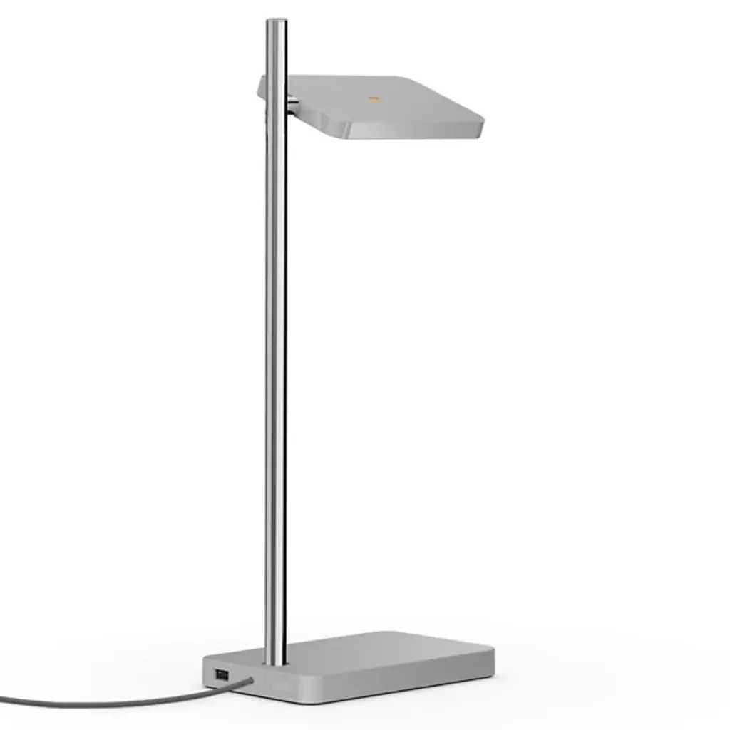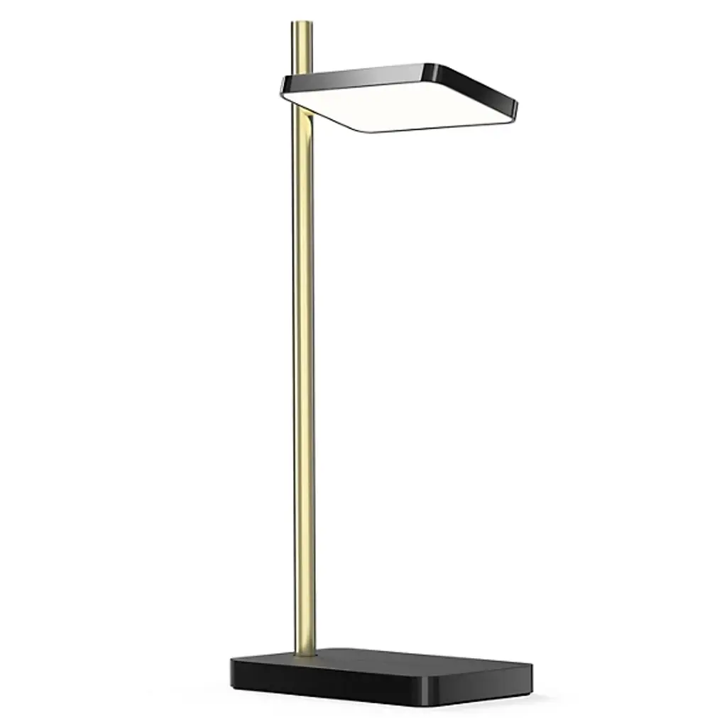 Minimalist design packed from edge to edge with modern functionality. Charge your devices wirelessly and light up your table surface evenly with the highly adjustable Talia LED Charging Table Lamp from Pablo Designs. The piece is designed by Pablo Pardo, Pablo Studio, and Carmine Deganello, a group of thinkers that create with the user in mind with every step of their highly refined process. Deganello's expertise in materiality gives shape with metal to Pablo and his studio's minimalist visual language. This piece pleases the eyes with the mirrored quality of its rectangular metal base and head. The base offers wireless induction charging and a USB plug for an extra device. Its head tilts 180-degrees and packs a glare-free edge-to-edge LED module. Providing a clean silhouette, its slender post adds movement with its 360-degree rotating capabilities. Tap on its optical switch to receive a crisp spread of task lighting.