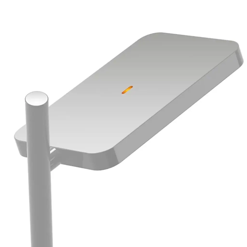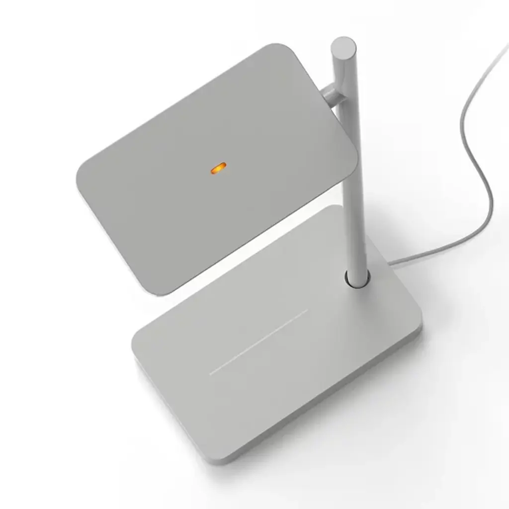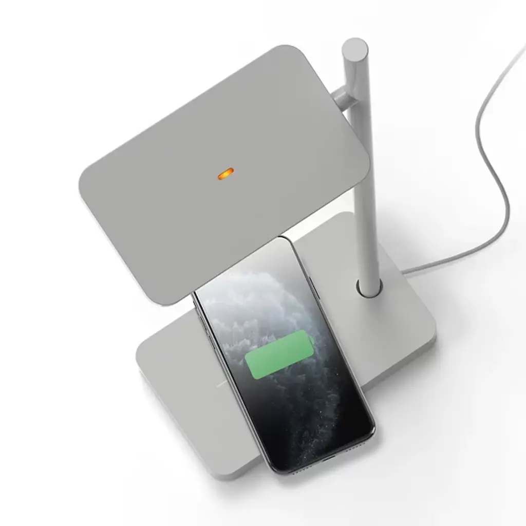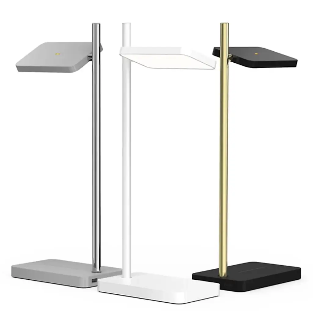 Minimalist design packed from edge to edge with modern functionality. Charge your devices wirelessly and light up your table surface evenly with the highly adjustable Talia LED Charging Table Lamp from Pablo Designs. The piece is designed by Pablo Pardo, Pablo Studio, and Carmine Deganello, a group of thinkers that create with the user in mind with every step of their highly refined process. Deganello's expertise in materiality gives shape with metal to Pablo and his studio's minimalist visual language. This piece pleases the eyes with the mirrored quality of its rectangular metal base and head. The base offers wireless induction charging and a USB plug for an extra device. Its head tilts 180-degrees and packs a glare-free edge-to-edge LED module. Providing a clean silhouette, its slender post adds movement with its 360-degree rotating capabilities. Tap on its optical switch to receive a crisp spread of task lighting.