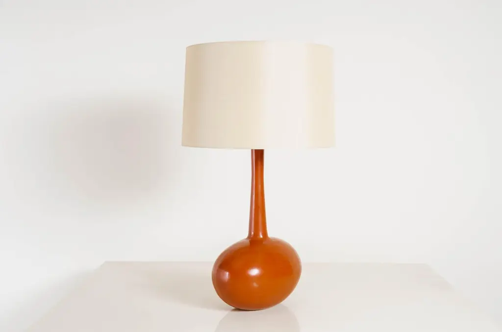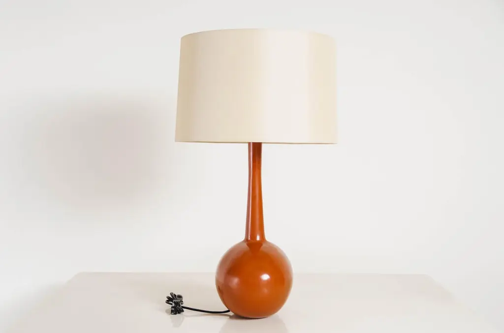 Tall cocoon table lampMila lacquerHand repousseLimited editionMeasures: Natural silk pongee shade (19" diameter x 12" height)Lacquer is a technique that dates back to the Shang dynasty, circa 1600-1100 B.C. These pieces are made with at least 60 coats of organic lacquer. Each layer of lacquer is applied with a curing period of 24 hours in between so that it can dry.