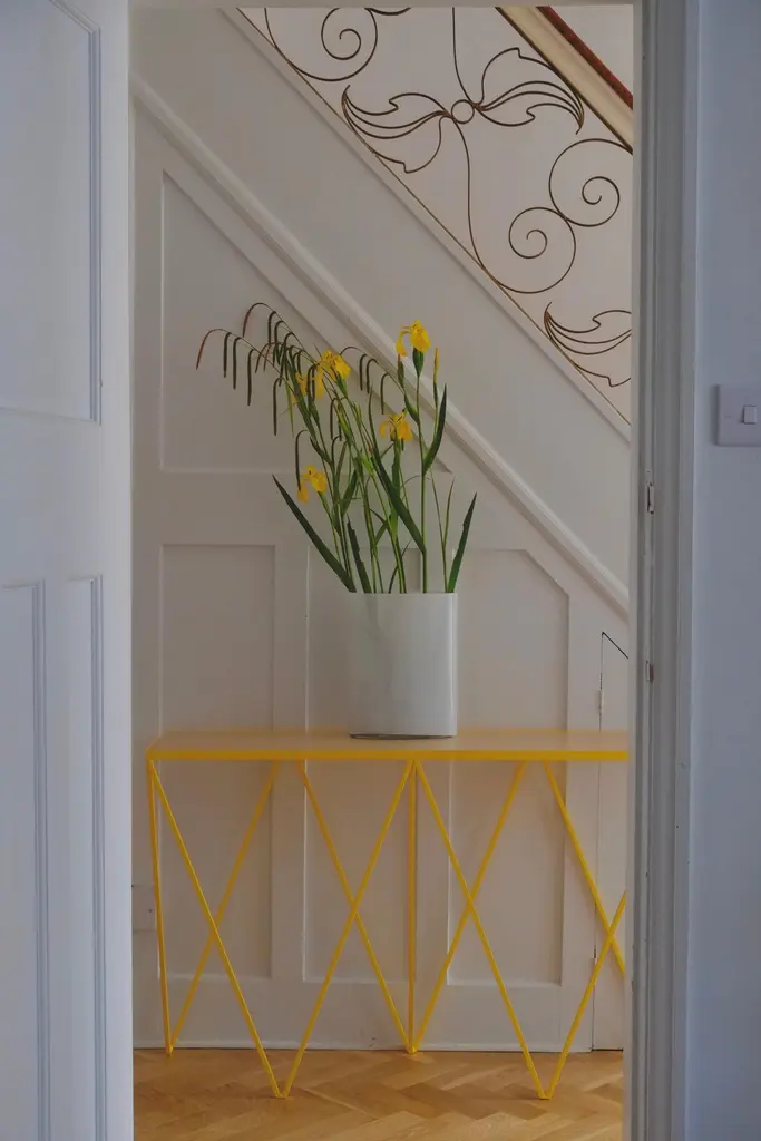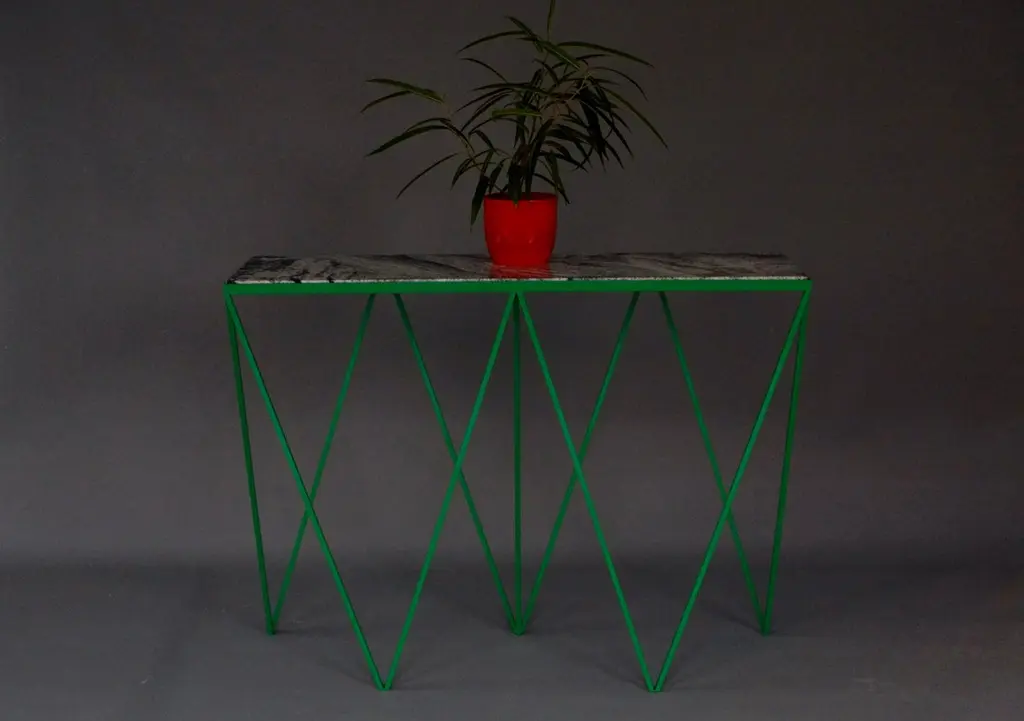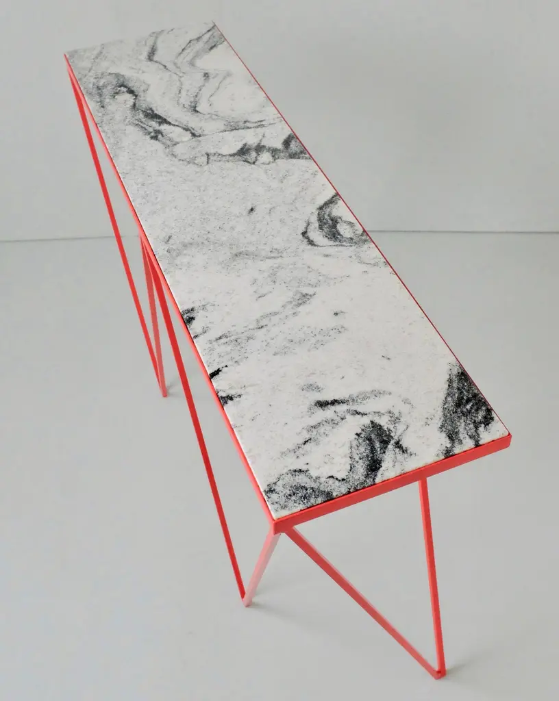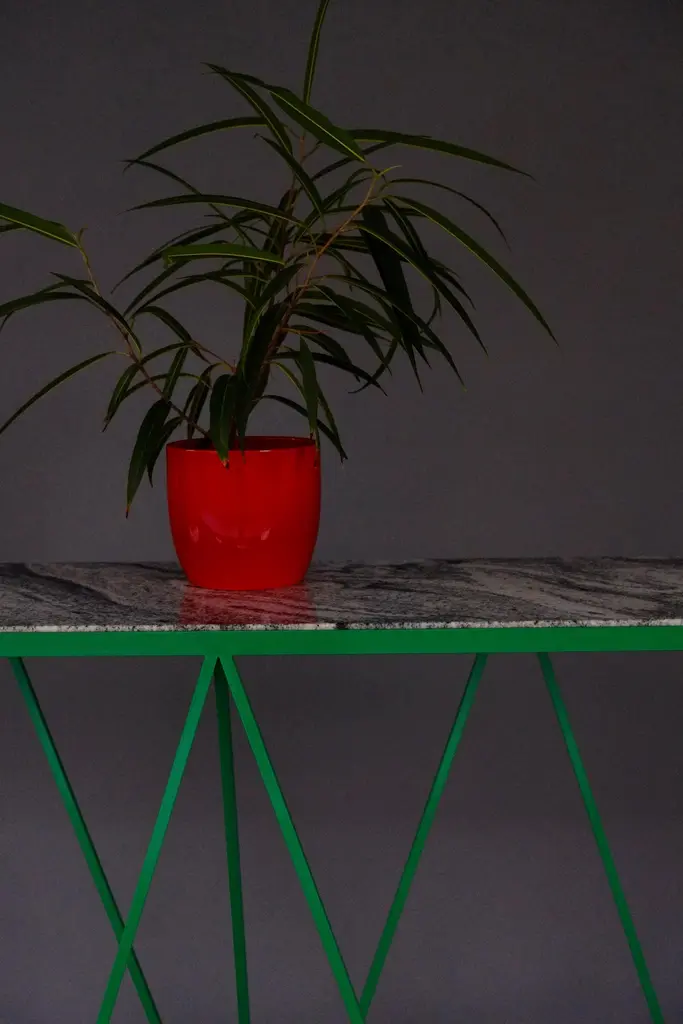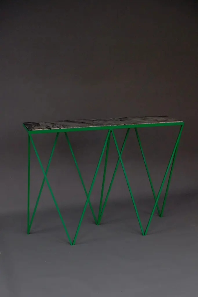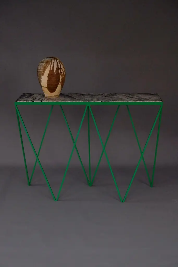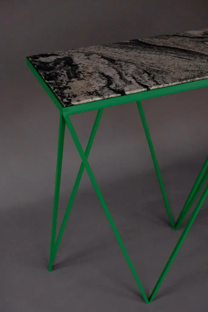 The Giraffe console table is a modern statement piece. The powder-coated steel console table looks stunning behind the sofa or in the hallway with a bunch of flowers or as a lamp table in any room. The beauty of the Giraffe console table is that it works both against period details and modern surroundings due to its elegant proportions. The Giraffe console table is made with a steel frame and a solid granite top. The geometric leg design ensures that the table is sturdy and stable maintaining an elegant aesthetic. The console is available in fifteen powder-coated colours with a wide choice of granite top finishes. Please get in touch if you have any specific stones you'd like us to source.The Giraffe console hold the Design Guild Mark for outstanding design and quality.Colour samples available to order from our storefront - LU2894331610202 All &New products are manufactured in Britain in small batches and hand-finished. We believe in local manufacturing. Our furniture is hand made to a high standard. The result is a collection of modern British furniture that celebrates those little imperfections that make objects beautiful and unique.Measures: 110cm wide, 30cm deep, 83cm high.Mirka & Jo&New - Modern British FurnitureZig-zag-legs/ Registered design. Community design registration number: 002391813-0001.