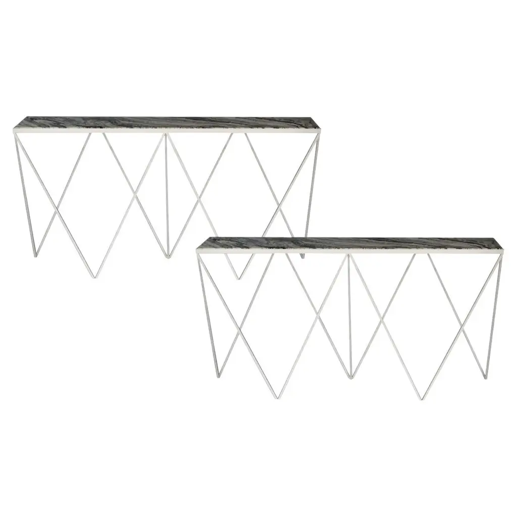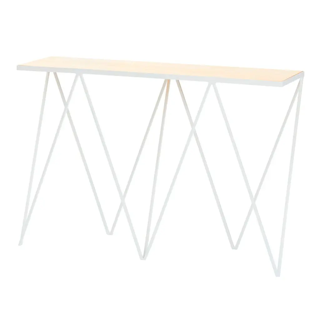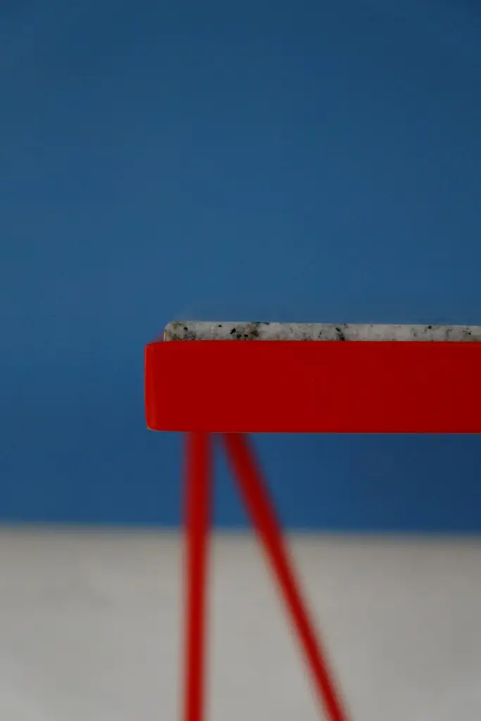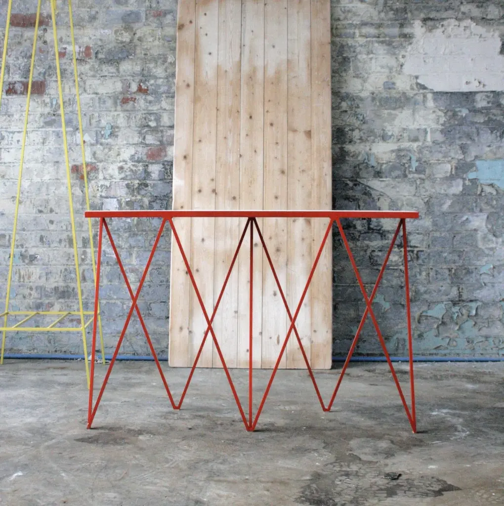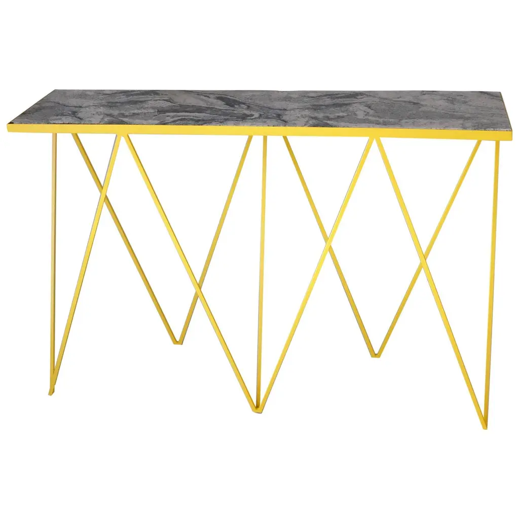 The Giraffe console table is a modern statement piece. The powder-coated steel console table looks stunning behind the sofa or in the hallway with a bunch of flowers or as a lamp table in any room. The beauty of the Giraffe console table is that it works both against period details and modern surroundings due to its elegant proportions. The Giraffe console table is made with a steel frame and a solid granite top. The geometric leg design ensures that the table is sturdy and stable maintaining an elegant aesthetic. The console is available in fifteen powder-coated colours with a wide choice of granite top finishes. Please get in touch if you have any specific stones you'd like us to source.The Giraffe console hold the Design Guild Mark for outstanding design and quality.Colour samples available to order from our storefront - LU2894331610202 All &New products are manufactured in Britain in small batches and hand-finished. We believe in local manufacturing. Our furniture is hand made to a high standard. The result is a collection of modern British furniture that celebrates those little imperfections that make objects beautiful and unique.Measures: 110cm wide, 30cm deep, 83cm high.Mirka & Jo&New - Modern British FurnitureZig-zag-legs/ Registered design. Community design registration number: 002391813-0001.