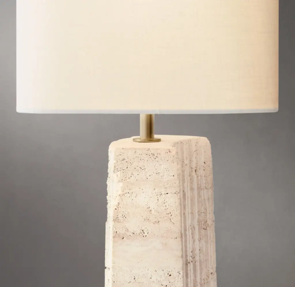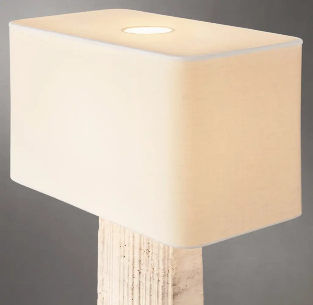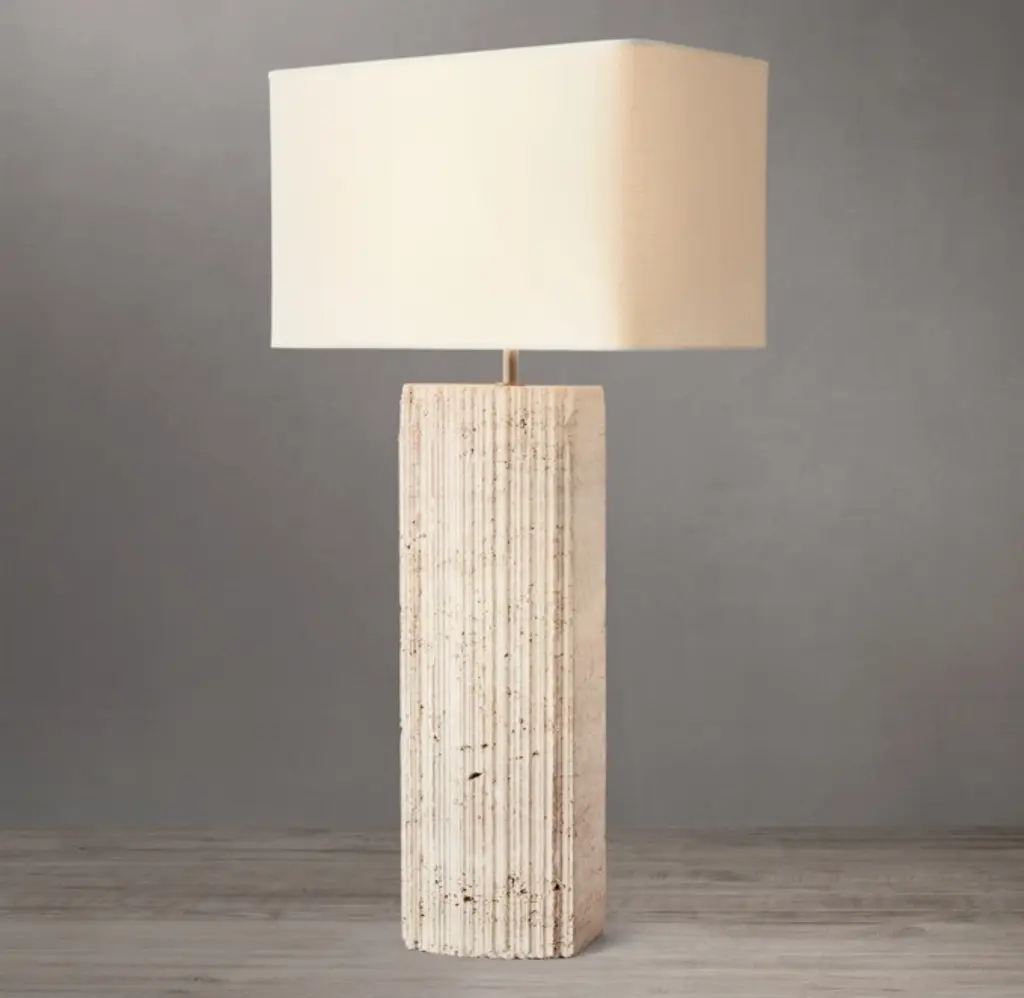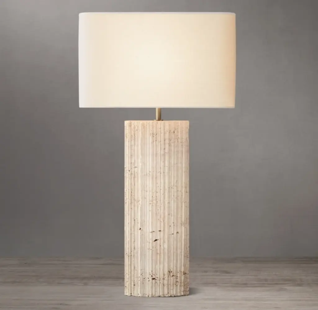 The Tallado Travertine Collection celebrates elemental design using natural materials and pure geometric forms. The lamp base is carved from Italian travertine, with linear grooves that accentuate the organic patterning and textural quality of the stone. Subtle ridges and furrows create a nuanced play of light and shadow. SHOP THE ENTIRE COLLECTION