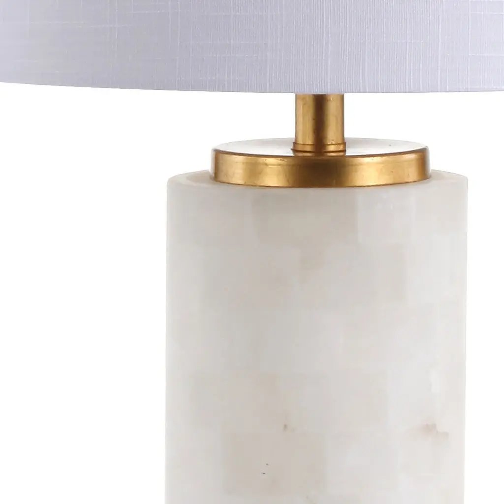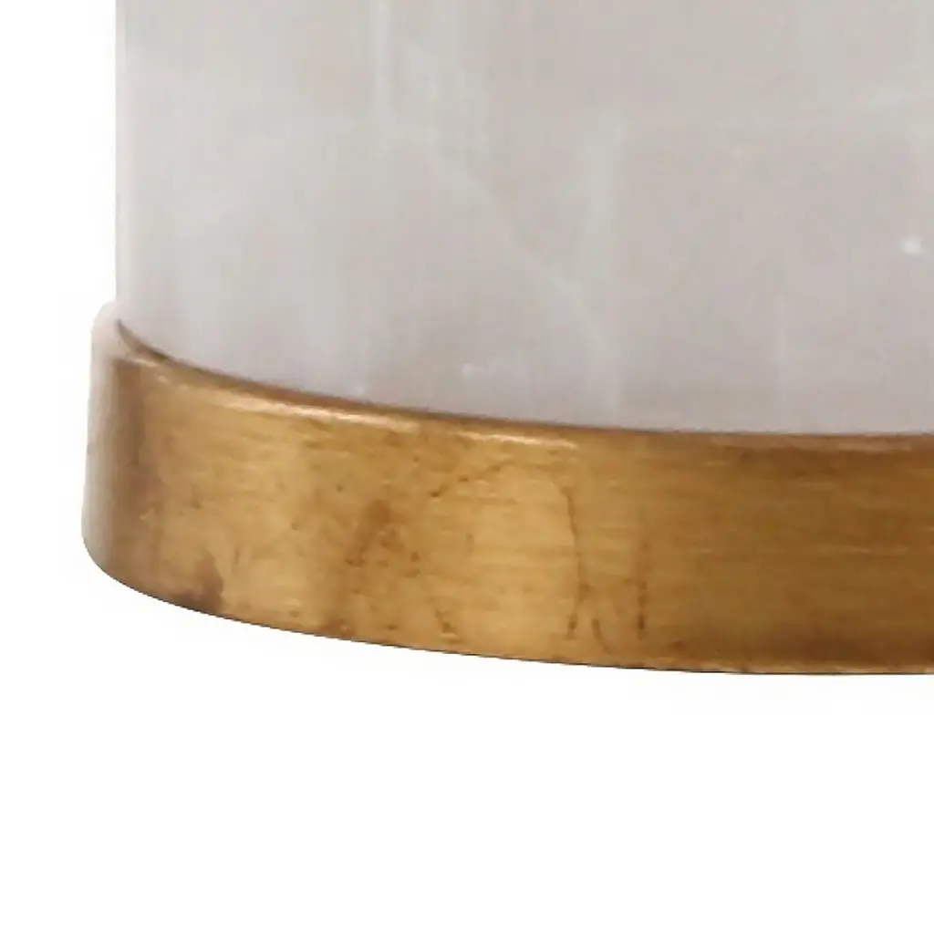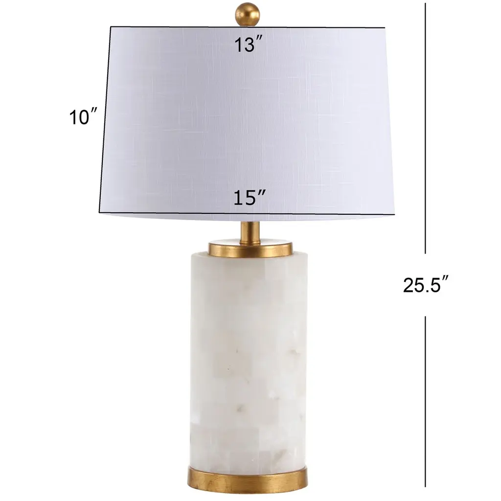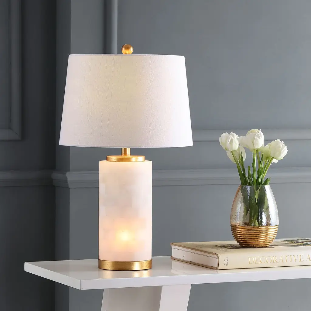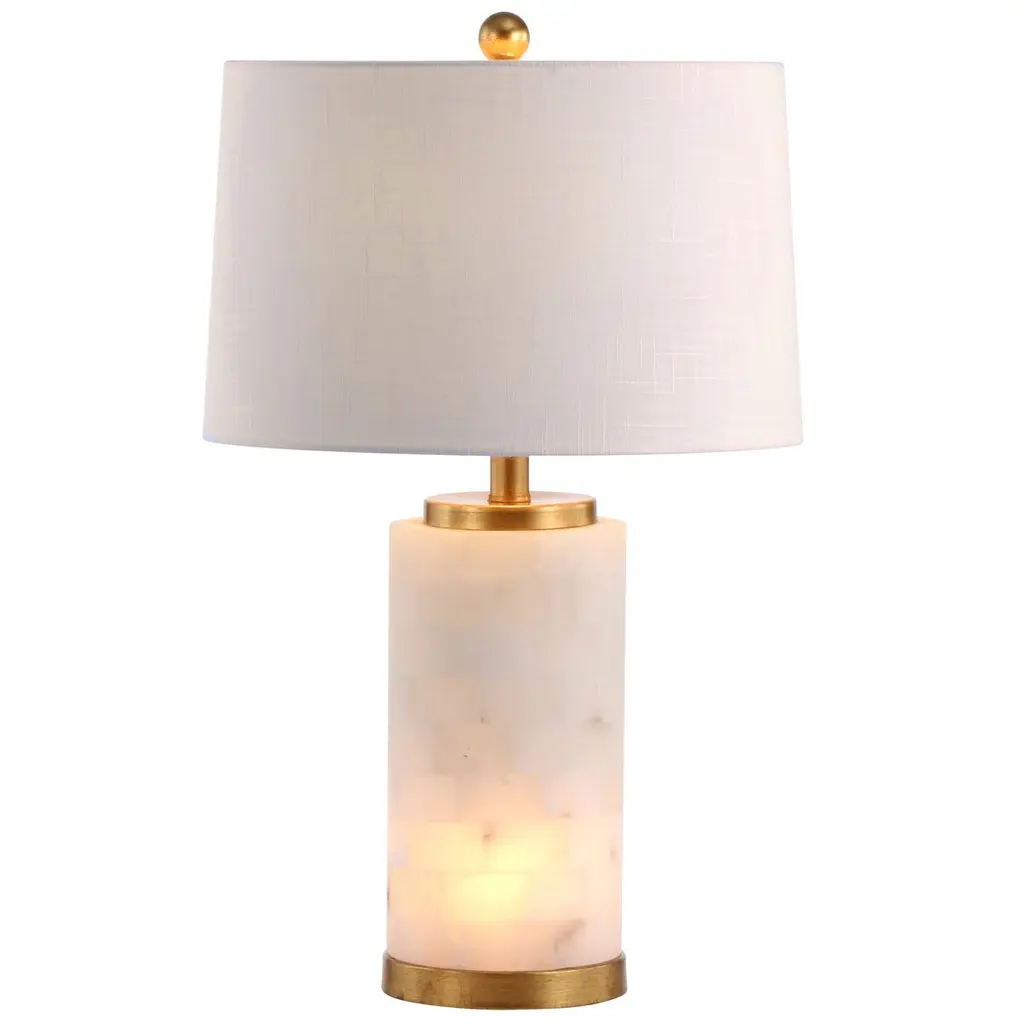 Alabaster is luminous on its own, but with this lamp it gains added luster from a low-watt LED bulb embedded within. That's in addition to the bulb concealed by the linen shade. Gold-leaf accents heighten the drama.