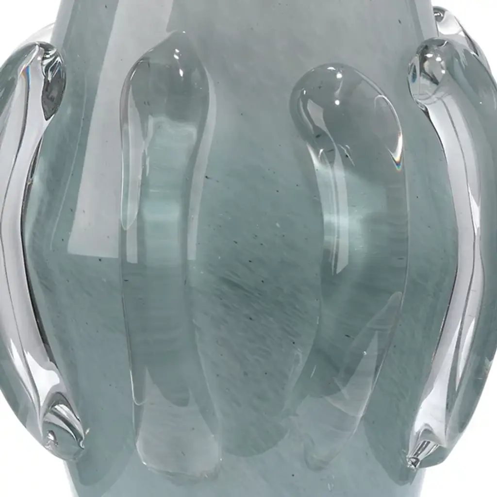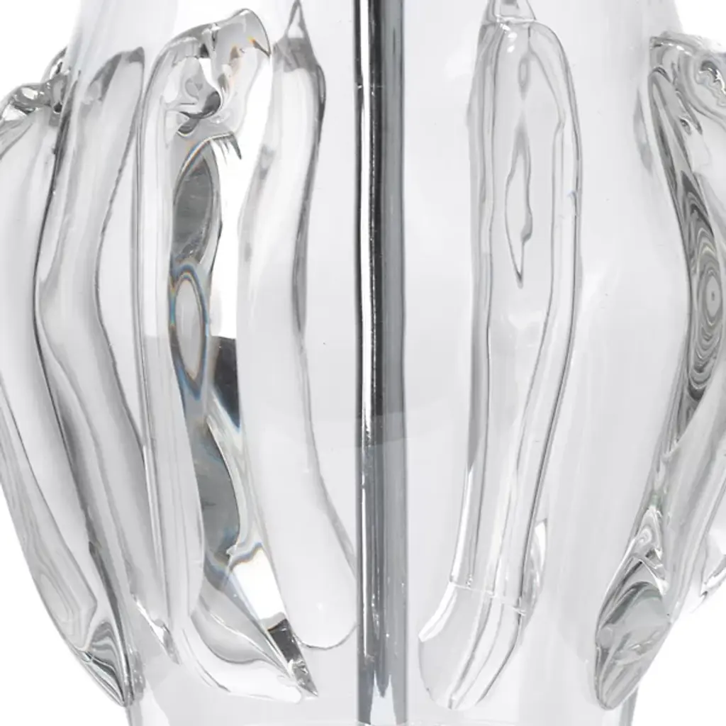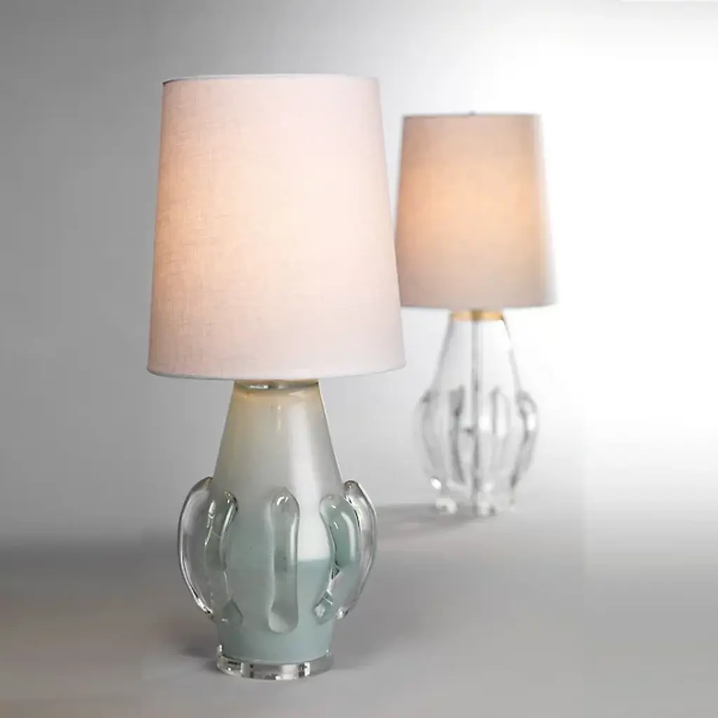 A stylish modern piece sure to elevate the décor of your home. The Talon Table Lamp from Jamie Young starts with a round, acrylic base that mounts an art glass body that slightly angles inward as it leads to a cone-shaped white linen shade. A series of thick, matching glass ribbons connect to the sides of the body for additional visual appeal. The single lamp within the shade emits a bright and even glow that spreads throughout the room.