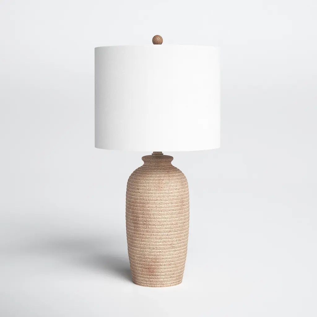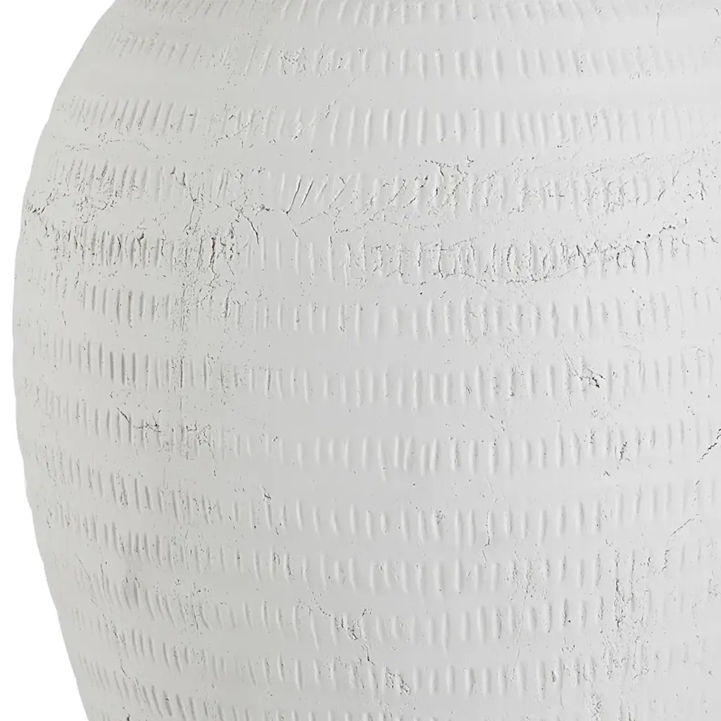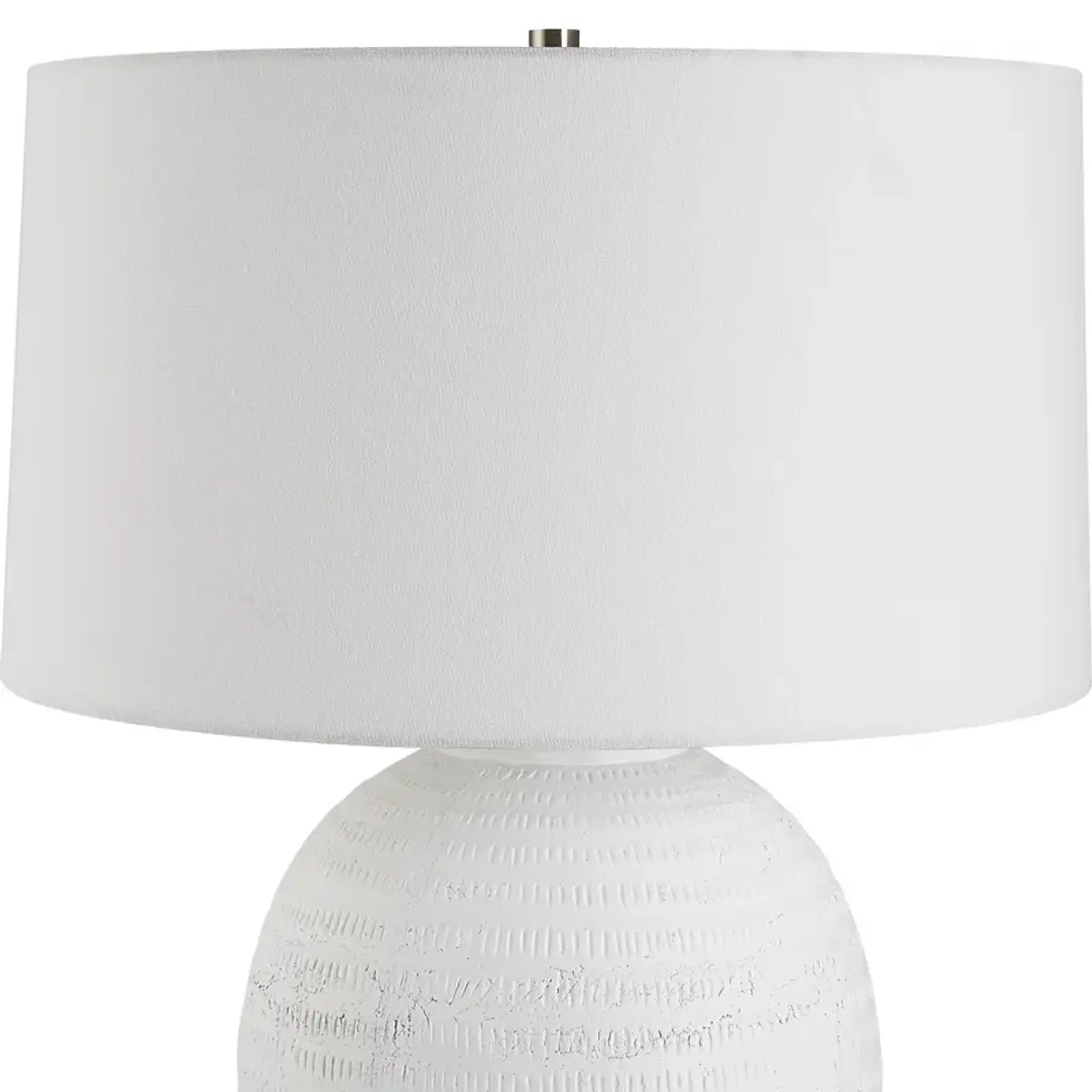 This ceramic table lamp features a timeless urn shape finished in a chalk-white glaze with updated hand-carved texture and subtle distressing, accented with brushed nickel details. The slightly tapered large drum shade is made in a casual white linen fabric.