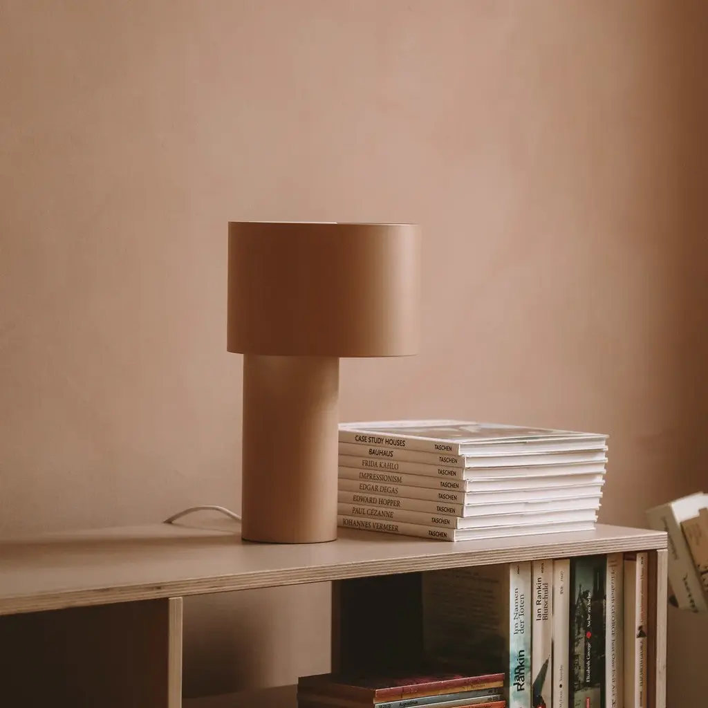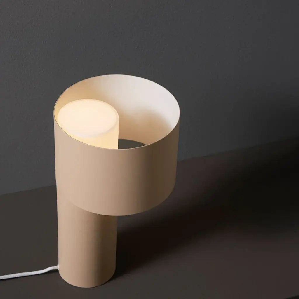Tangent table lamp arose from an experimental study with tubes and proportion and how these can be joined together. A clean graphical design where two steel tubes meet at their tangential point of contact. The small tube provides space for the electrics while the large tube functions as the lamp shade. On top of the inner metal tube is a shade made of opal glass that covers the bulb creating a soft light when turned on and a visual effect of one cylindrical tube when turned off.