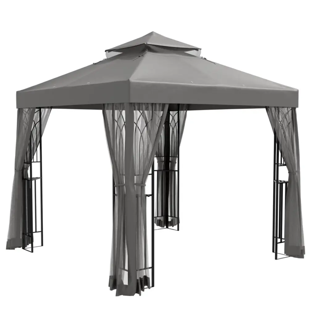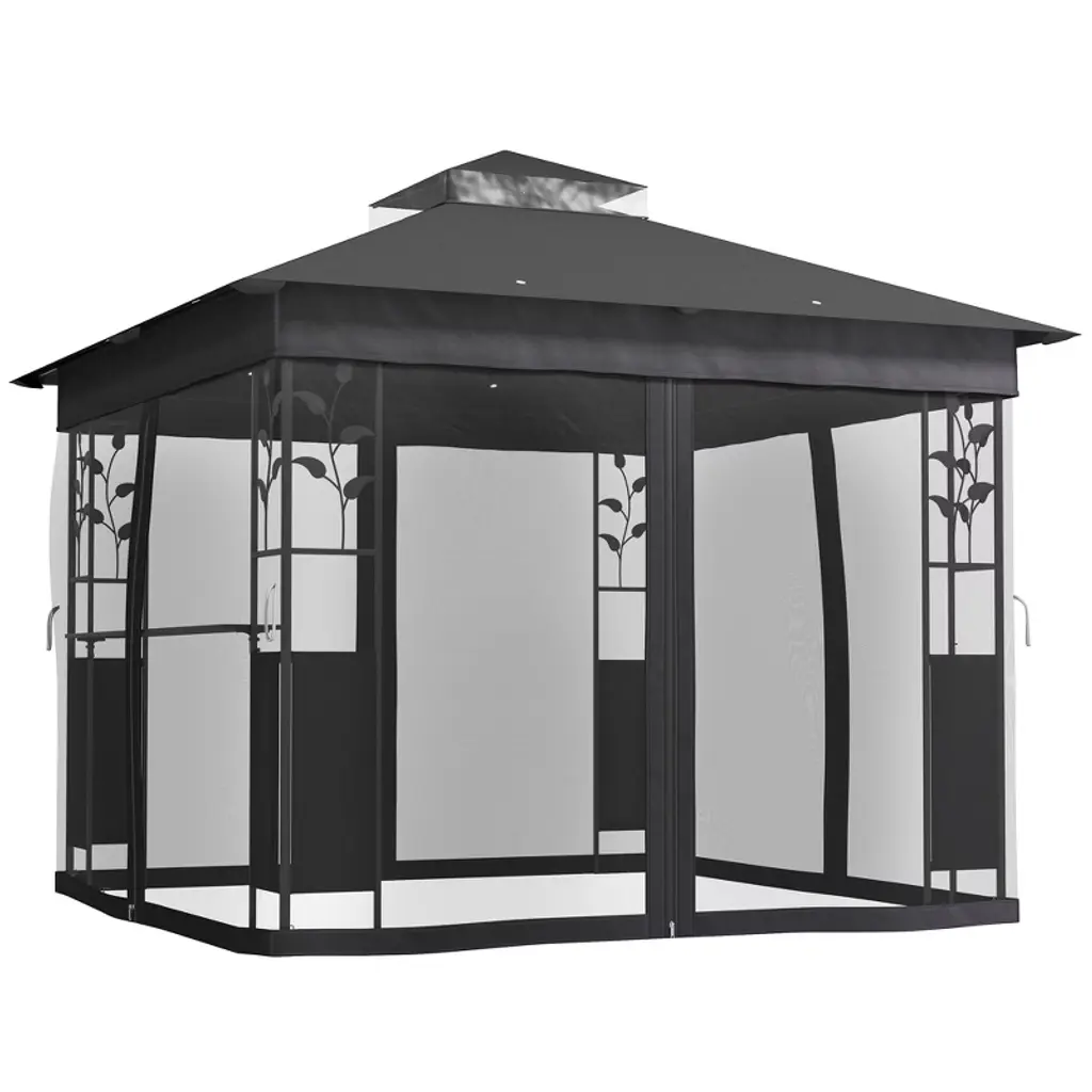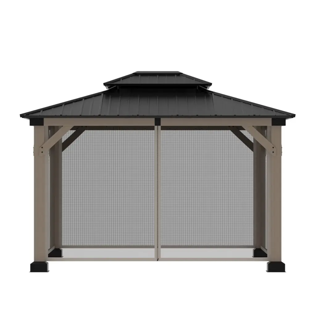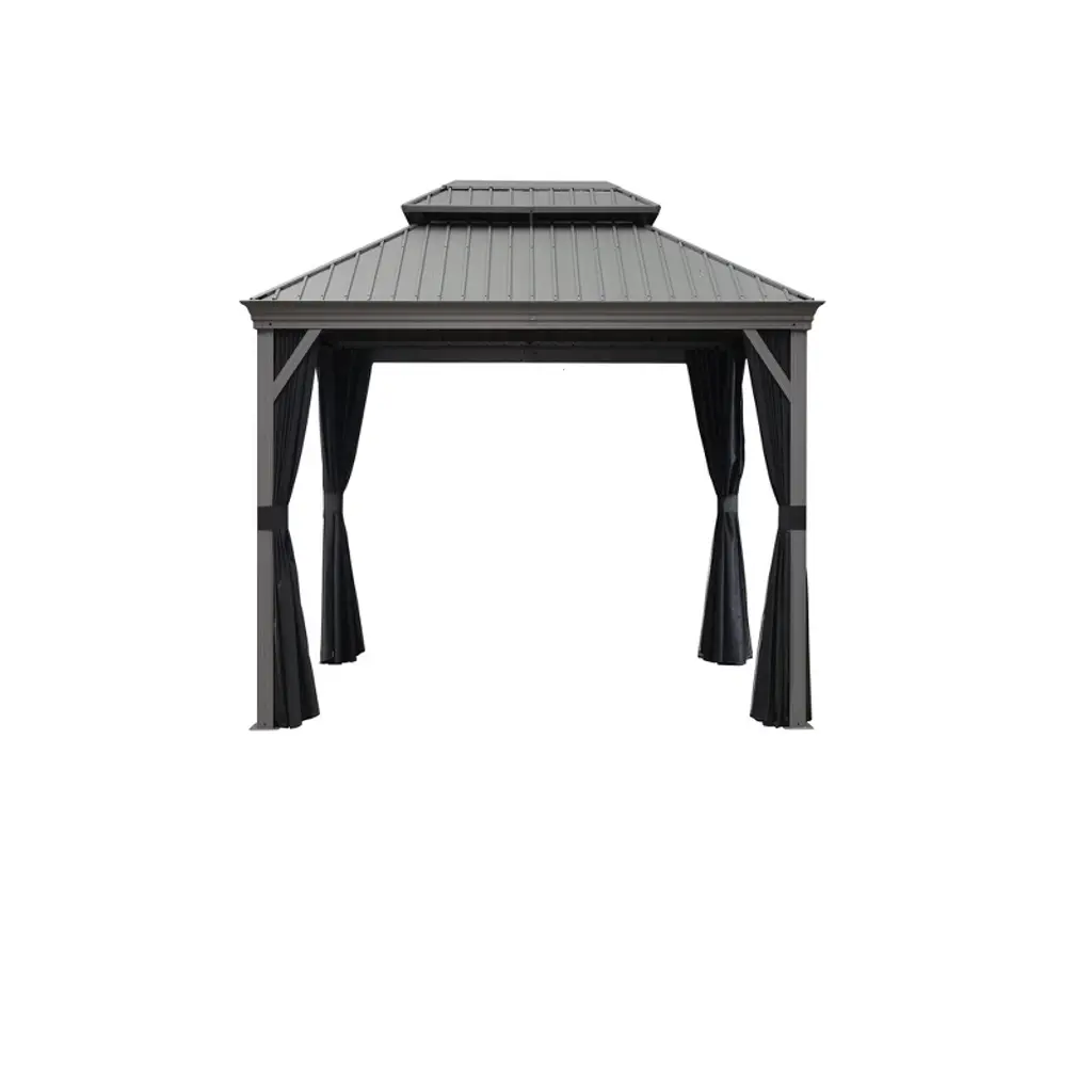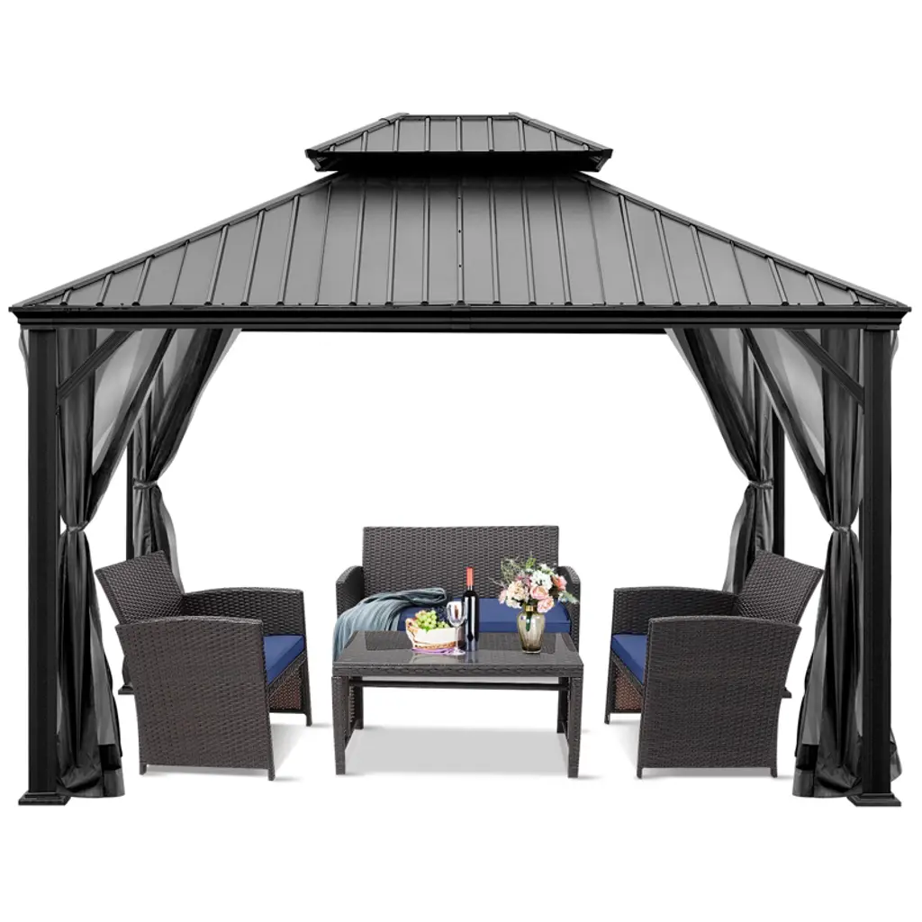 Do you want to create an comfortable oasis in your backyard? Our outdoor hardtop gazebo can help you to achieve the dream! This hardtop gazebo is large enough to cover 6-8 people at the same time, protecting you from annoying wind and sunlight. You can hold a barbecue party to share your happiness with family and friends. Made of heavy-duty steel frame, the double vented galvanized steel roof keeps good air flow and increase wind-resistance of the canopy. There is a built-in hanging hook on the roof. You can hang a small lamp or fan according to your needs. And 4 detachable mesh walls can be closed by zippered to keep privacy while keepingnice ventilation. Therefore, this durable hardtop sun shelter can work for you for years to come.FeaturesSpacious shading area can cover 6 to 8 people in daily useDouble vented roof keeps air flow to withstand windy daysHeavy-duty galvanized steel roof can bear snow up to 3600lbsOne built-in hanging hook designed for hanging a lamp or a fanDetachable zippered mesh for keep privacy and ventilationPacked into 2 boxes to protect parts and components from shipping damagingAn ideal patio pergola for backyard, deck, poolside, etcSpecifications Color: Black and Gray/ Black and Brown Material: Steel, Polyester Fabric Overall Dimensions: 12’ x 10’ x 10’ Net Weight:321lbs Wind-resistant Level: 33 miles Snow Load Capacity: 3600lbs Package Includes: 1 X Hardtop Gazebo 1 X User’s Manual