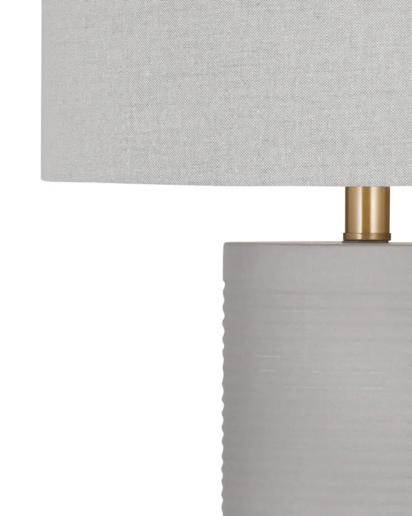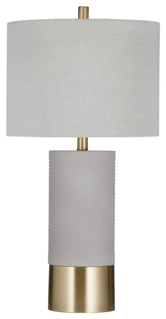 The Tano Table Lamp is crafted of cement with a drum shade. Finished in gray with antique brass accents.Features:This gray table lamp features a modern style.The drum shaped lamp shade features a white finish.Features a 3 way switch.Bulb type a required, not includedEasy assembly - just attach harp, finial and shade.For over a century, Bassett Mirror has been synonymous with style and quality, transforming homes with its sophisticated and timeless designs. With a wide-ranging collection of furniture, lighting, mirrors, and art, Bassett Mirror seamlessly blends modern style with classic appeal. From rustic modern to luxe glam, each piece is thoughtfully crafted to inspire and elevate any space. Committed to exceptional value and customer care, Bassett Mirror makes it easy for homeowners to create beautiful, personalized interiors with confidence.