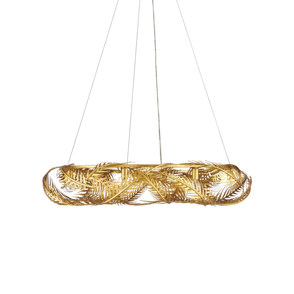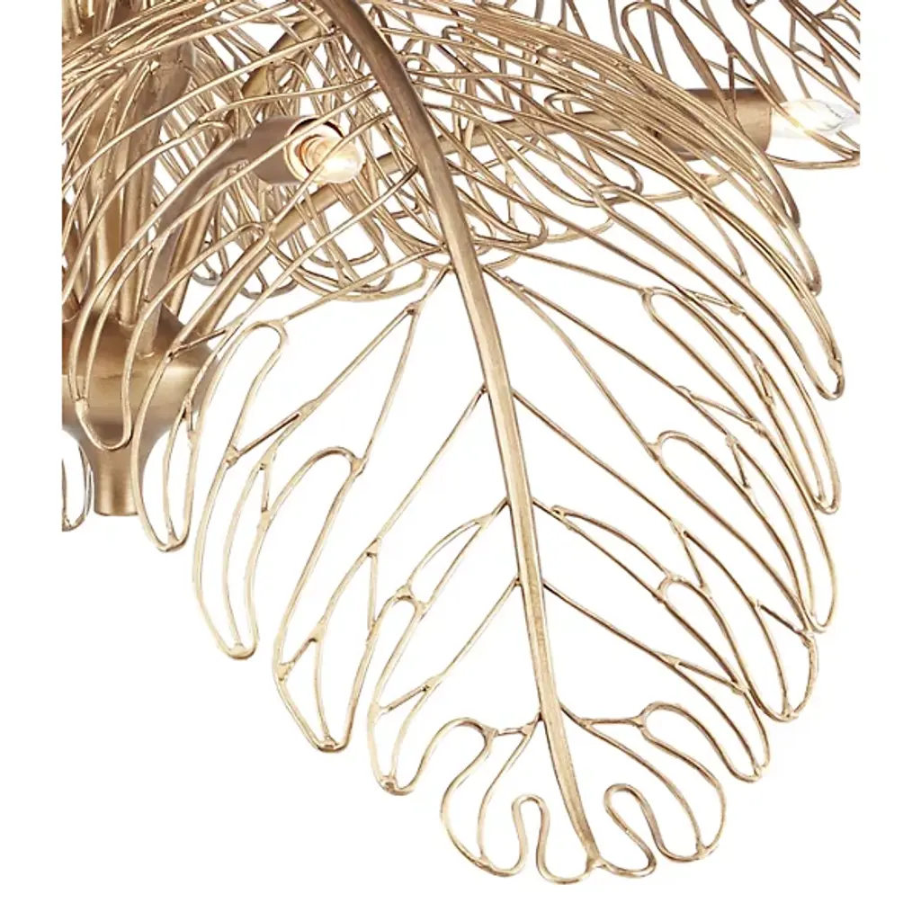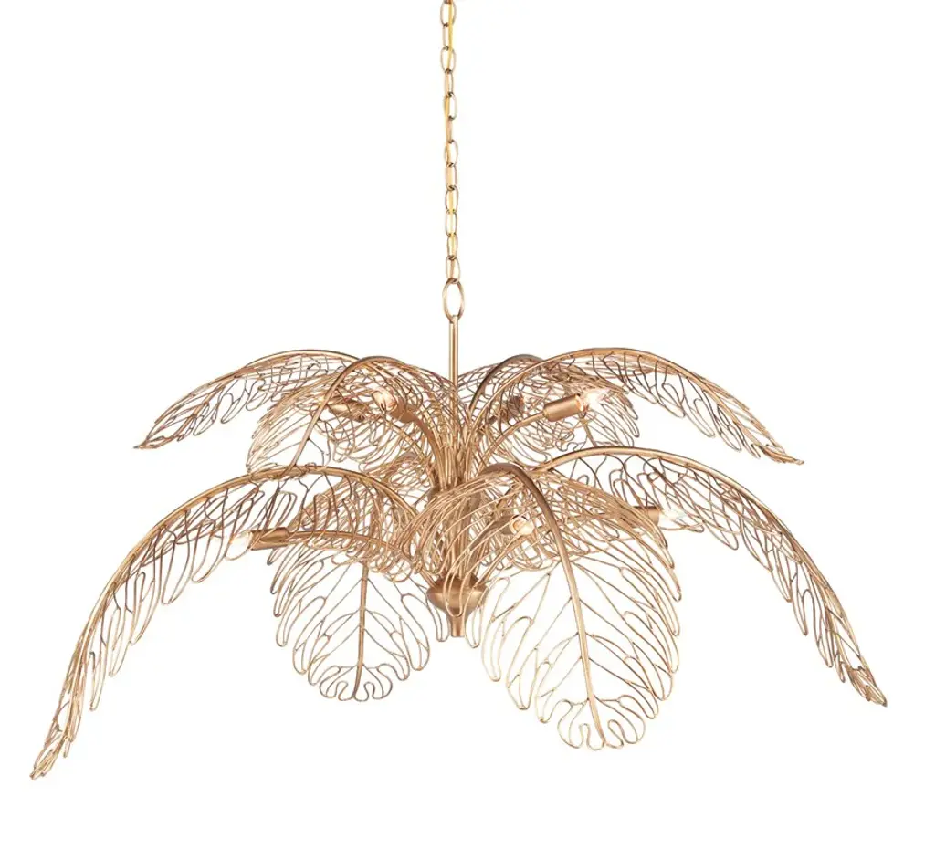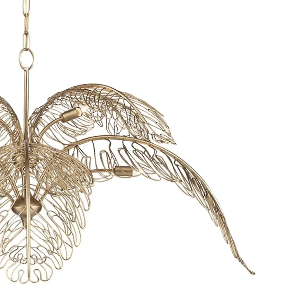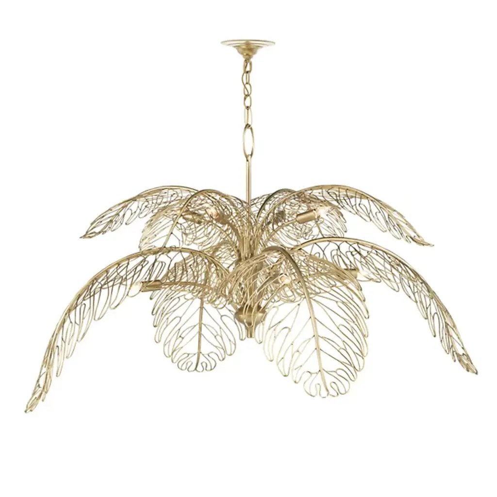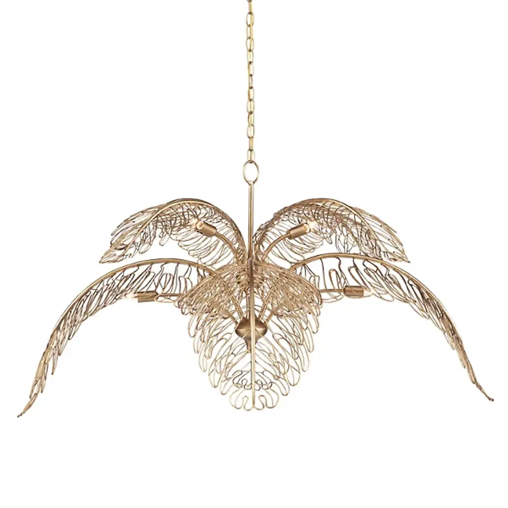 Engage the imagination with the fabulous fronds of the Taormina Chandelier from Currey & Company. A stylish, airy design descending from a shallow finial along a fine chain, it dispatches a slim stem to a bulb-shaped finial below, blooming an array of small candelabra lamps from a variety of curving arms beneath leaf-shaped accents. The leaves are constructed from looping strands of wire, leaving enough open space for light to travel through while casting lace-like shadows around the bright wash of the lamping.