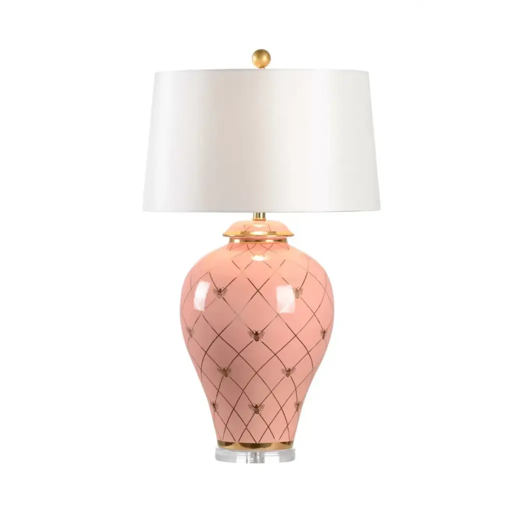 Romantic and ornate references merge in this refined table lamp brimming with glamorous flair. A raised motif of minutely detailed flowers extends throughout the bulging porcelain body, painted in a soft and feminine shade of light pink only interrupted by a golden band that adds an accent of opulence to the piece. A fancy, richly pleated lampshade in white fabric seals the classic allure defining the design.