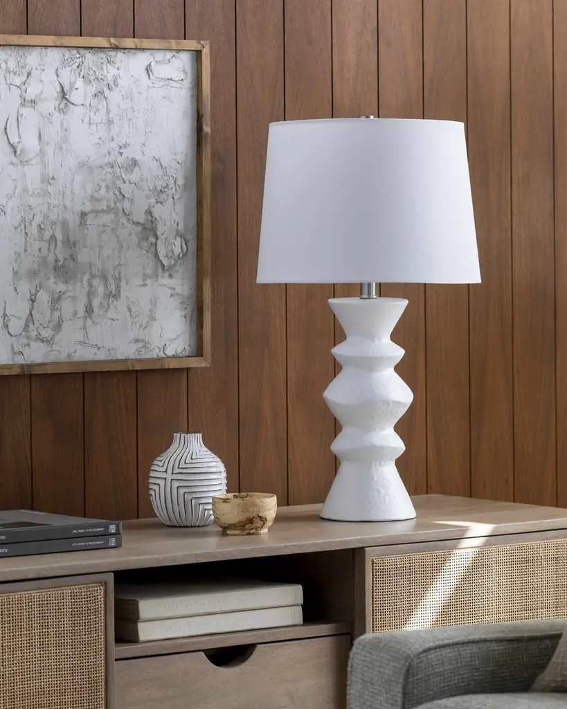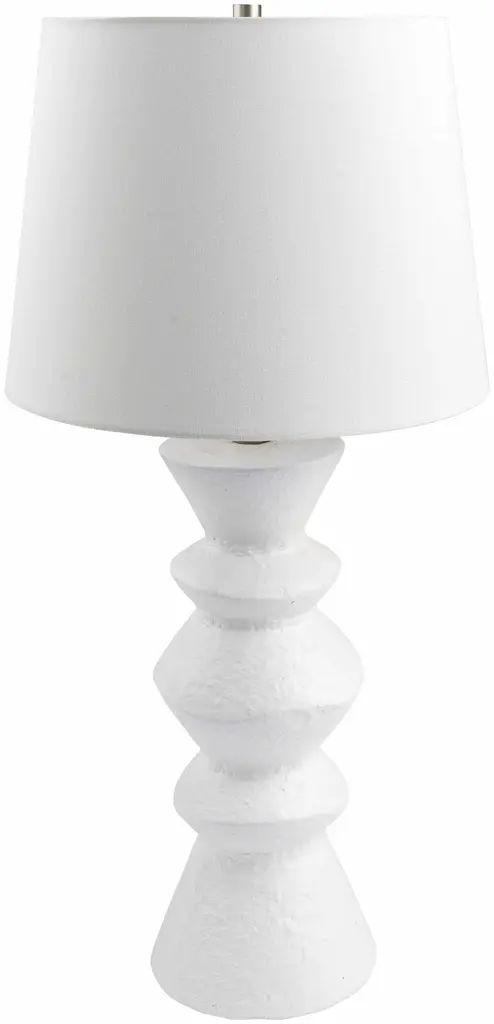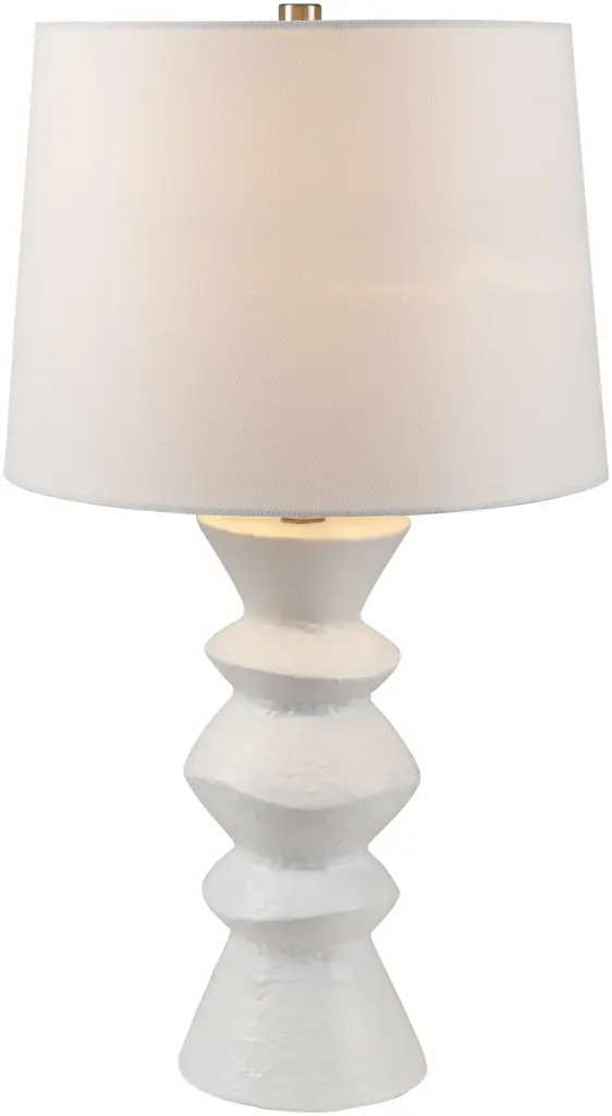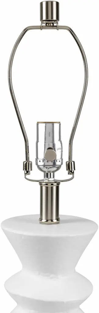 Collection: Tataurovo Colors: White, Medium Gray Material: Body: Ceramic,Shade (Outside): Linen,Shade (Inside): Polyester,Finial: Iron Made In: China Shade Material: LinenPolyester Shade Color: BeigeBeige Cord Length: 6' Switch Type: On/Off Number of Bulbs: 1 Socket Type: E-26 Bulb Wattage: 60W