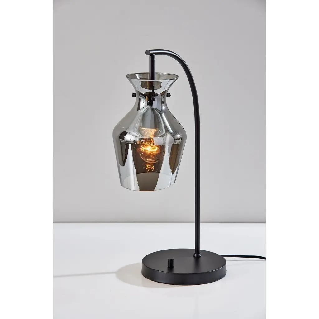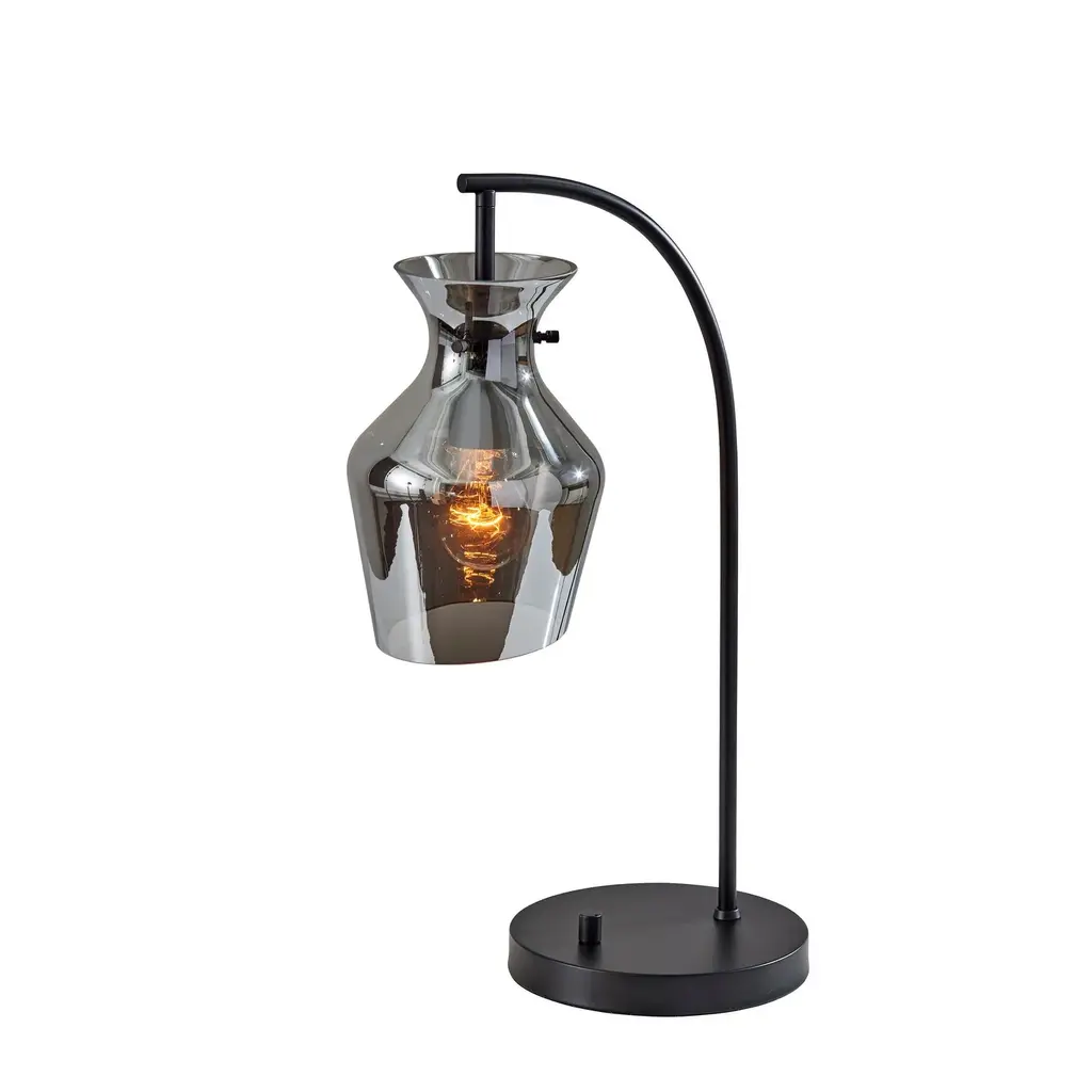 Illuminate your living space with the Tate Table Lamp—a beacon of contemporary sophistication and understated elegance. Featuring a sleek Black finish and a Mirrored smoked glass shade, this lamp exudes modern charm while infusing your room with warm, inviting light. Standing at 21 inches tall with a depth of 13 inches, its compact yet commanding presence makes it an ideal addition to bedside tables, desks, or sideboards. Complete with an on/off rotary switch conveniently located on the base, the Tate Table Lamp offers both style and functionality in perfect harmony. -Contemporary Design: Sleek Black finish paired with a Mirrored smoked glass shade creates a visually striking table lamp that enhances any interior decor. -Versatile Placement: With its compact size and stylish design, the Tate Table Lamp is perfect for bedside tables, desks, or sideboards, adding a touch of sophistication to any space. -Convenient On/Off Switch: The on/off rotary switch located on the base allows for effortless operation, ensuring easy access to illumination whenever needed. -Premium Craftsmanship: Meticulously crafted with attention to detail, this table lamp is built to last, promising enduring beauty and functionality. -Warm Ambient Lighting: Emitting a warm, inviting glow, the Tate Table Lamp creates a cozy ambiance that enhances relaxation and comfort, making it perfect for bedrooms, living rooms, or home offices.