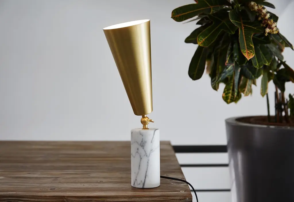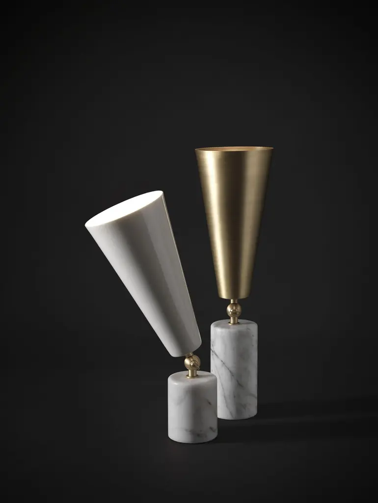 Tato Italia 'Vox' Table Lamp in White Carrara Marble and Satin Brass. Lorenza Bozzoli was born in Milan, where she studied at the Accademia di Belle Arti di Brera. In 1985 she began working as a fashion designer before becoming passionately involved in industrial design for Antiquità, Viceversa, Alessi, Dilmos, Dedon and Moooi. She has participated in important exhibitions in Italy and abroad.Executed with a marble base and metal shade. Designed by Lorenza Bozzoli in 2016, this refined and geometric table lamp is crafted using only the highest quality materials by Tato Italia in Italy.Price is per item. Available in unlimited quantities in 15.7" or 18.1" heights, with choice of shade color in glossy white, glossy black, satin brass, or polished brass. Choice of marble base in carrara, marquinia, or portoro marble. Prices vary; kindly contact us for custom finish combinations. This listing is for the 18" height 'Vox' table lamp in white carrara marble and satin brass. In stock lead time 12-14 weeks. Out of stock lead time an additional 10-12 weeks or longer. Inventory availability subject to change without notice. Please contact us for current lead times prior to placing time sensitive orders.Accommodates 1x standard medium base E26 bulb, max 6W LED (bulb not included). Not UL listed, but recommended UL listing available from authorized 3rd party vendor upon request for an additional fee.Made to order. All sales final.