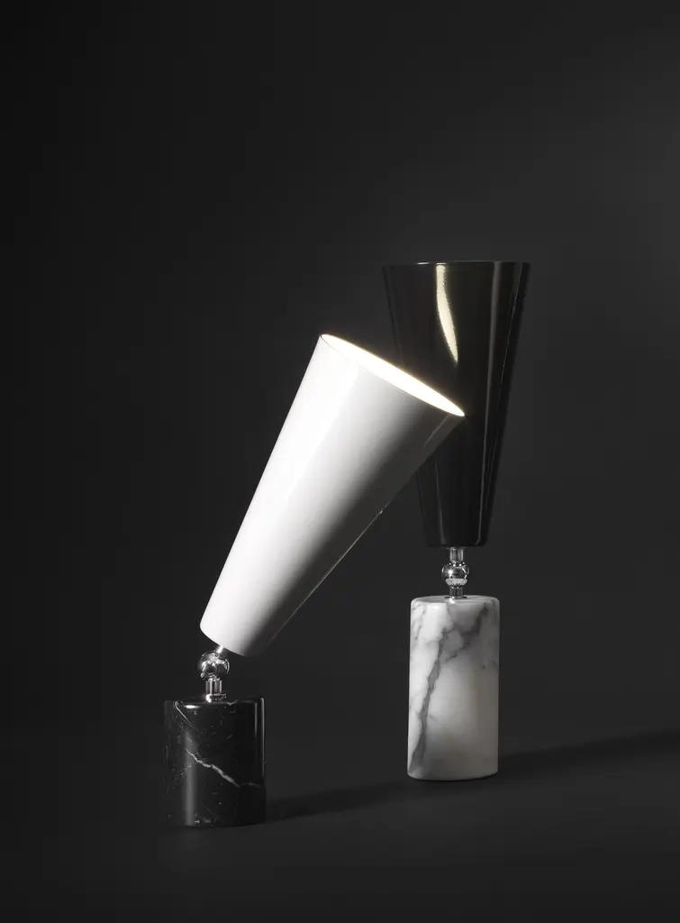 Tato Italia 'Vox' Table Lamp in White Carrara Marble, Chrome, and Glossy Black. Lorenza Bozzoli was born in Milan, where she studied at the Accademia di Belle Arti di Brera. In 1985 she began working as a fashion designer before becoming passionately involved in industrial design for Antiquità, Viceversa, Alessi, Dilmos, Dedon and Moooi. She has participated in important exhibitions in Italy and abroad.Executed with a marble base and metal shade. Designed by Lorenza Bozzoli in 2016, this refined and geometric table lamp is crafted using only the highest quality materials by Tato Italia in Italy.Price is per item. Available in unlimited quantities in 15.7" or 18.1" heights, with choice of shade color in glossy white, glossy black, satin brass, or polished brass. Choice of marble base in carrara, marquinia, or portoro marble. Prices vary; kindly contact us for custom finish combinations. This listing is for the 18" height 'Vox' table lamp in white Carrara marble, chrome, and painted glossy black shade. In stock lead time 12-14 weeks. Out of stock lead time an additional 10-12 weeks or longer. Inventory availability subject to change without notice. Please contact us for current lead times prior to placing time sensitive orders.Accommodates 1x standard medium base E26 bulb, max 6W LED (bulb not included). Not UL listed, but recommended UL listing available from authorized 3rd party vendor upon request for an additional fee.Made to order. All sales final.