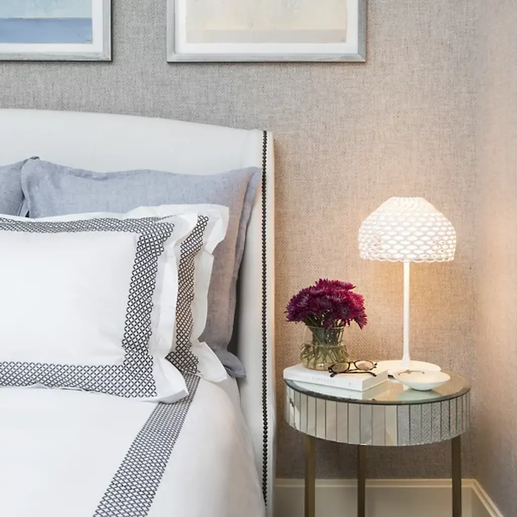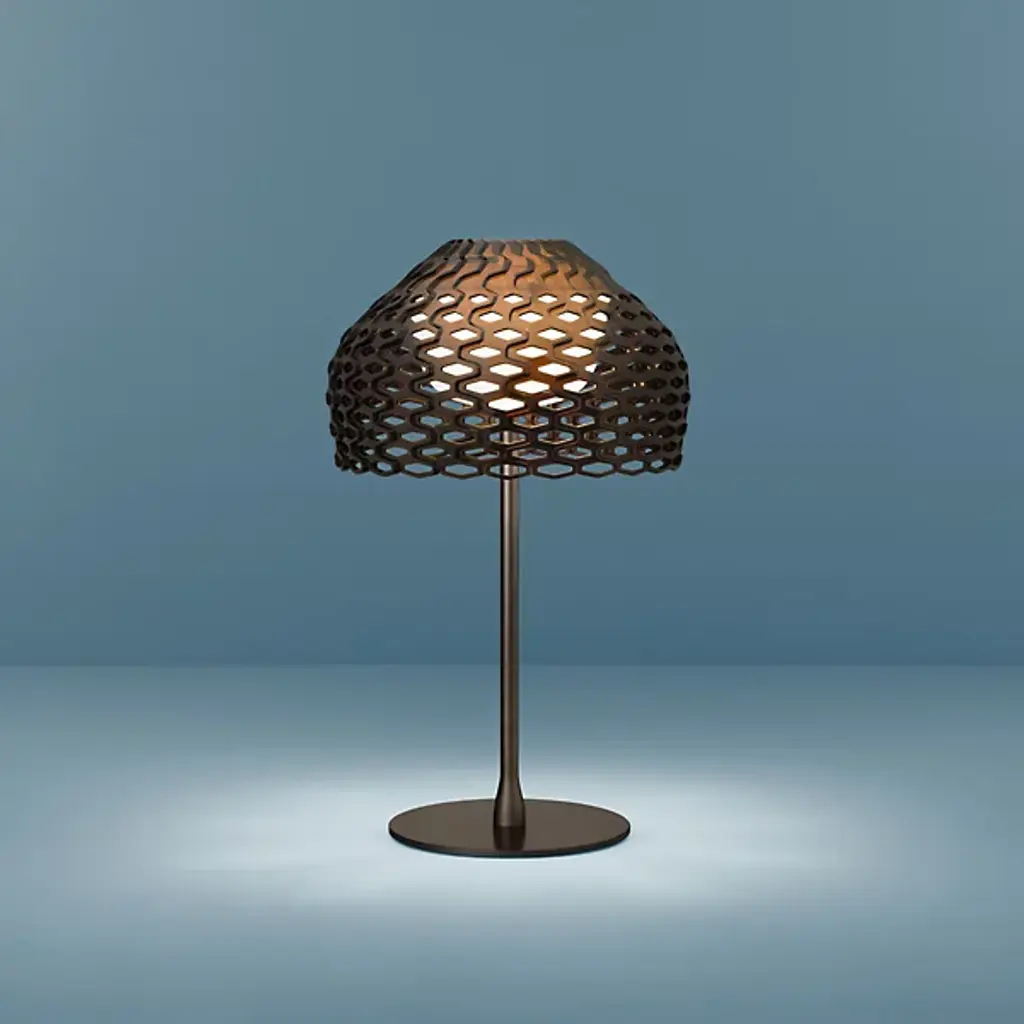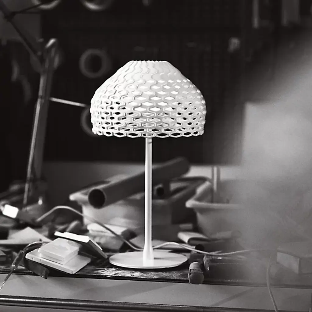 Inspired by the strength and composition of armor, it is quite fitting that the FLOS Tatout T Table Lamp is named after the armadillo (in French), a mammal known for its own protective armor shell. Made from woven bands of polycarbonate, the shade takes on a strong pattern that is both durable and visually stunning. The outer shade conceals an opal polycarbonate diffuser, creating a glowing and attractive light that is revealed through each opening in the pattern.