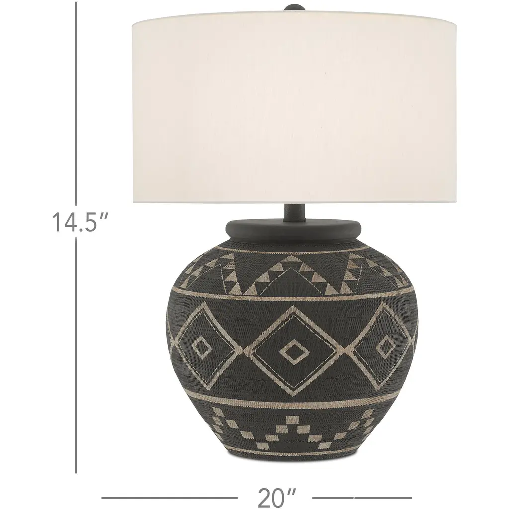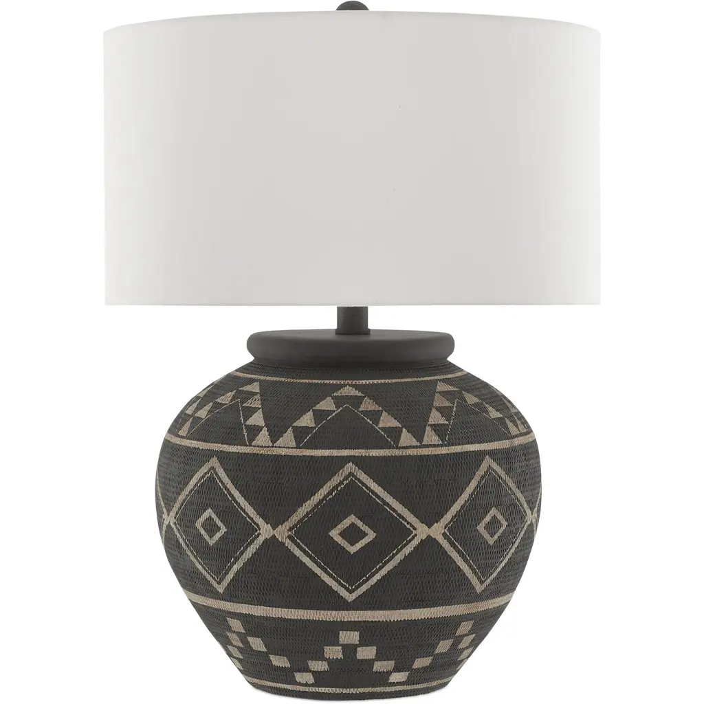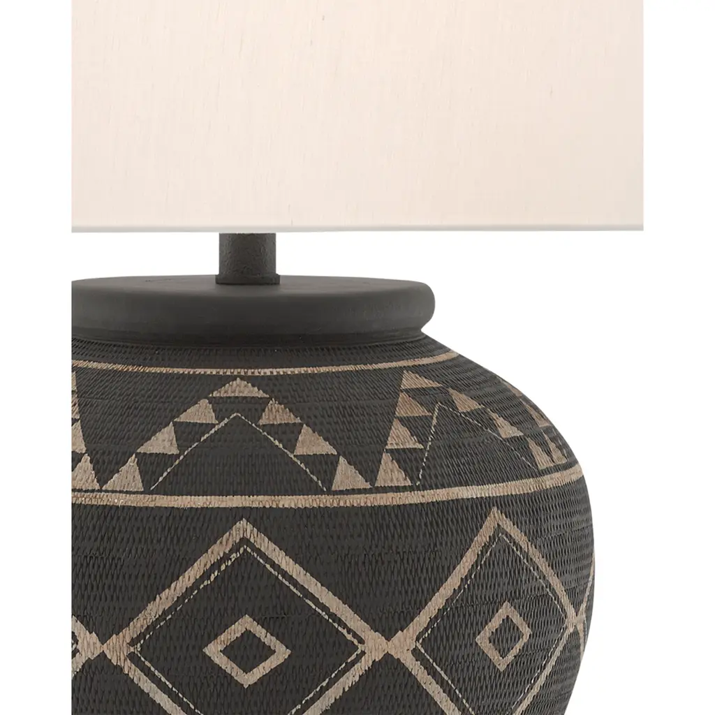 Though the eye could be influenced to believe the Tattoo Table Lamp has a surface covered in basket-weave, the pattern is scratched from the brewed latte finish on the surface of the terracotta body. The wrought iron hardware in a Molé black finish fits perfectly with the tones on the dark gray lamp, which has a terracotta finial in a matching finish to fasten the off-white linen drum shade to the piece.