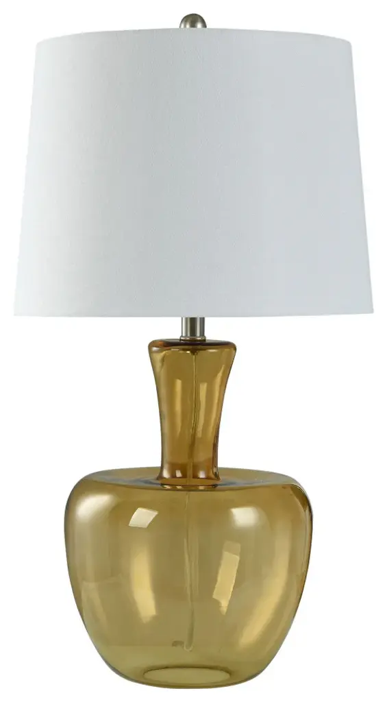 This Taupe Table Lamp from StyleCraft features a gourd-shaped glass base formed from colored glass to lend it a bold vintage appeal. It''s topped with a tapered white hardback shade that enhances its presence and gives it a timeless character in bedrooms, living rooms, and more.Features - This classic design uses simple colors and materials to bring a modern and trendy look to your space.The colored glass is semi translucent and allows for light to catch the amber finish in differing tones.The cord feeds through the center of the base but with it being clear, it blends well with the overall design style.Due to the production process, each lamp will have a different finish and unique overall design - especially any glazed, painted, and oil rubbed designs.Due to lighting and monitor differences, actual colors and finishes may vary slightly from what appears online.