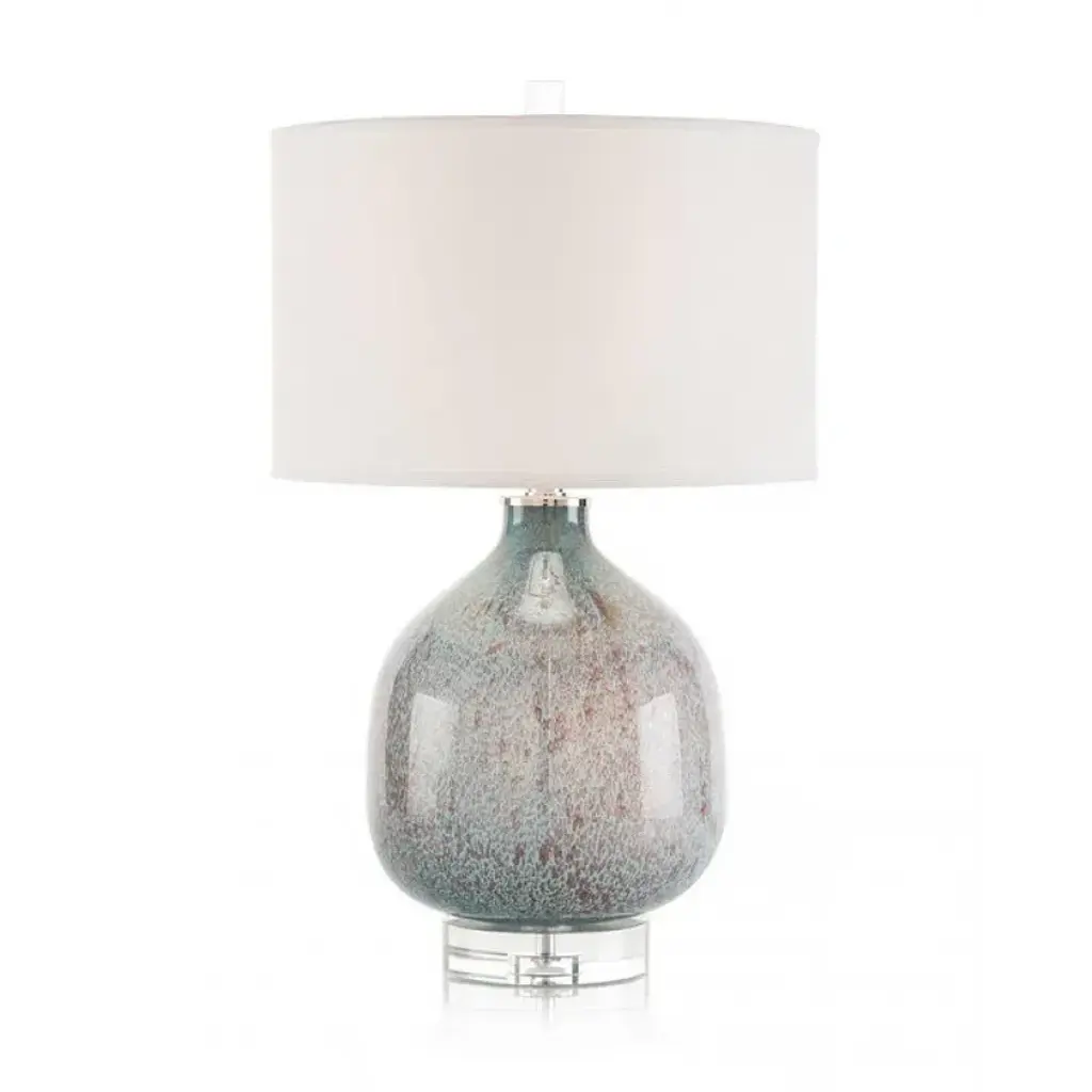 The Teal Blown Glass Barron Table Lamp will lend a fabulous splash of color to your home decor. The solid hand-blown glass lamp base mixes aquamarine hues and clear glass to create a lively effect. Its elegant shape and fascinating texture are amplified by a restrained turquoise lamp shade.