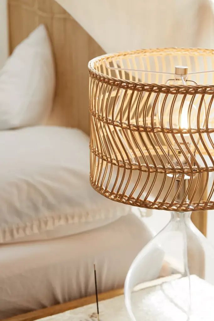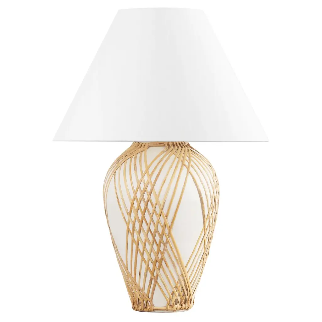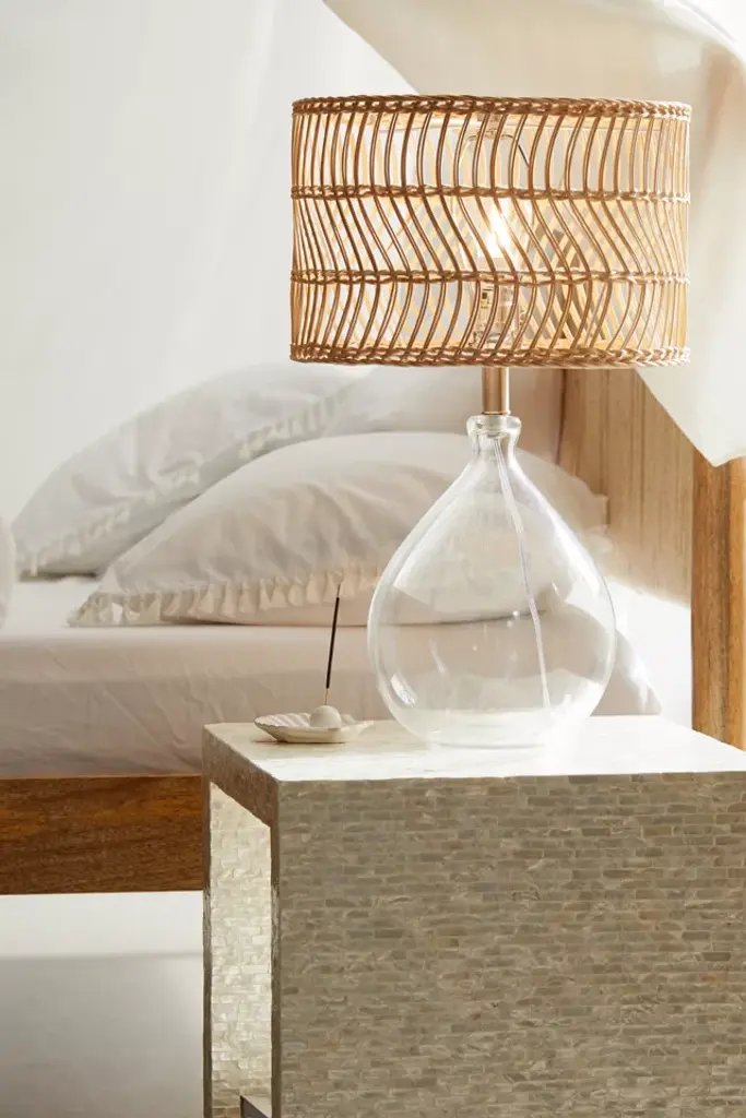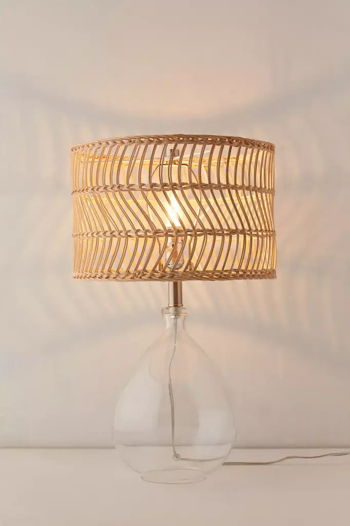 Infuse a classic silhouette with boho texture when you light up your space with this rattan-shade table lamp. Featuring a teardrop-shaped glass base, topped by a wavy strand rattan shade. Plugs in to power on with rotary socket switch.