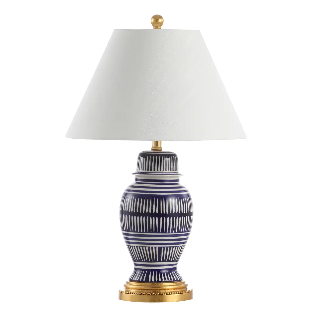 Your favorite blue and white coastal lamp gets a modern update, with its graphic white pattern on a navy background. Gold fittings and a white linen shade are a nod to the traditional ginger jar design. Add a pair to your resort condo, cottage, beach house, or nautical themed bedroom. Includes an energy-saving LED bulb.Features:Dimensions:About us:You see a lamp.We see a decorative work of art.A perfectly curved shade casts a dramatic shadow on a floor. A silk cord you never want to hide. Compatible with LED lightbulbs: as easy on the environment as they are on the eyes. The JONATHAN Y Lighting collection considers every detail from impeccably sourced materials to designer styling. And our prices are so attractive, we've transformed a functional necessity into a fashion accessory.JONATHAN Y Lighting - a fashion revolution in home decor.