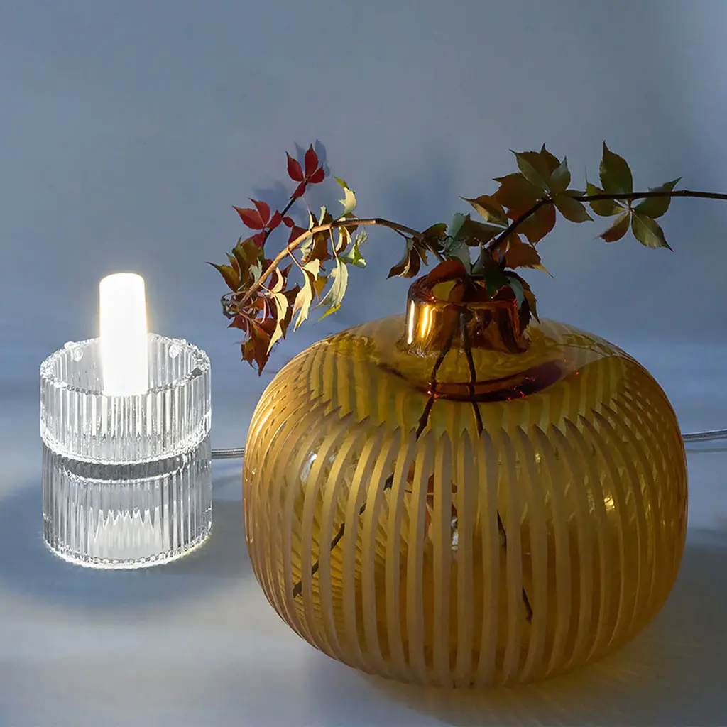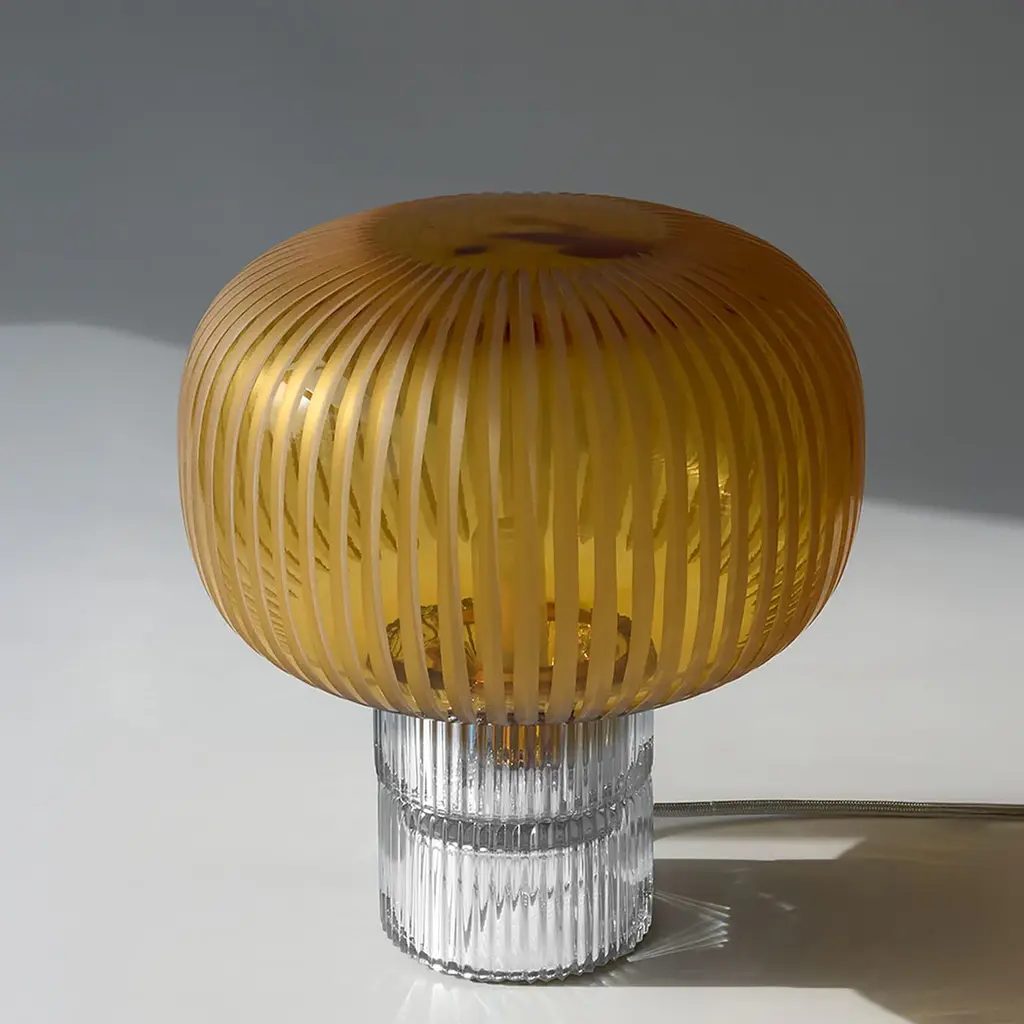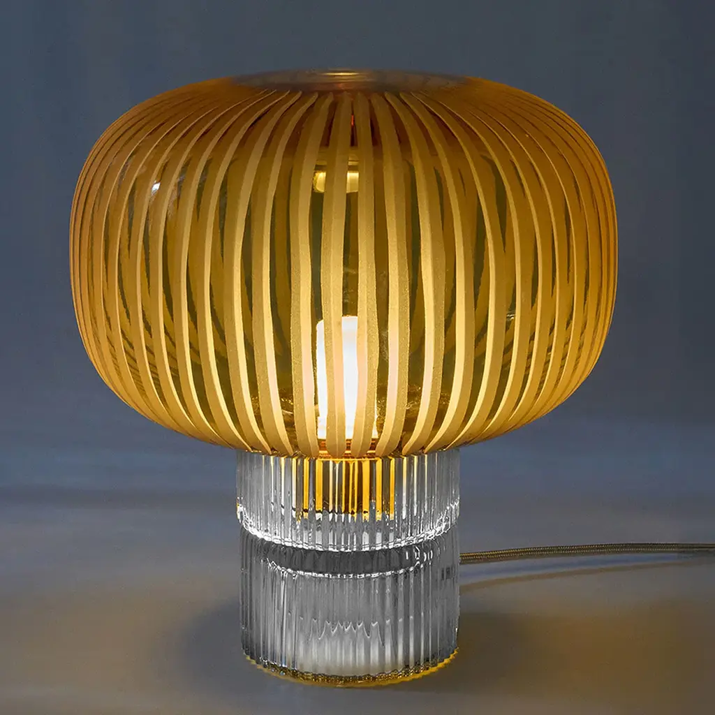 Tello, inspired by the Roman Capitello, reinterprets classical elegance with a contemporary touch. Hand-blown and intricately engraved from lead crystal, it features a clear crystal base and an amber top, casting mesmerizing light effects and reflections. Its interchangeable top allows for customized combinations and doubles as an elegant flower vase. A fabric-covered electrical cord enhances its refined design, making this table lamp a statement of timeless sophistication.