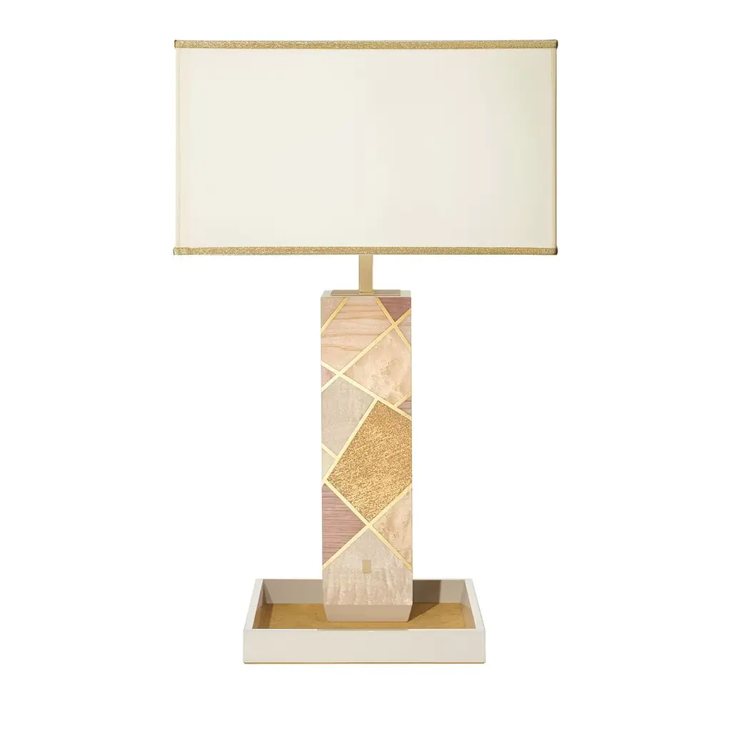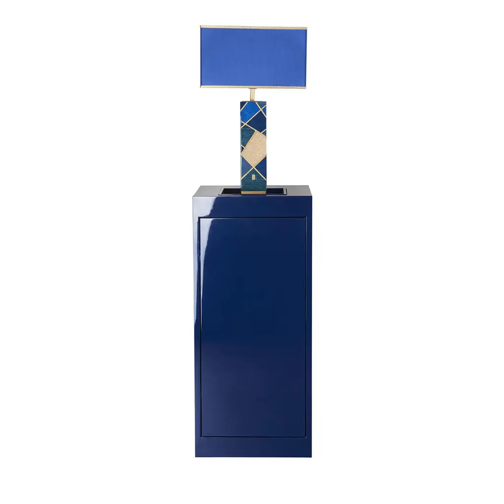 This lamp features a unique wooden base, showcasing a special high-gloss mirrored finish. The design incorporates a tasteful fabric diffuser in a coordinating shade, adorned with gold trim that enhances its sophisticated aesthetic. A convenient "Soft Touch" metal switch allows for easy lighting adjustments, while the dimmable lighting system provides customizable illumination to suit any mood or occasion. This item includes a practical storage function within its base, making it not only a source of light but also a stylish organizer. Available in various color options, this table lamp is a versatile choice for enhancing any interior decor.