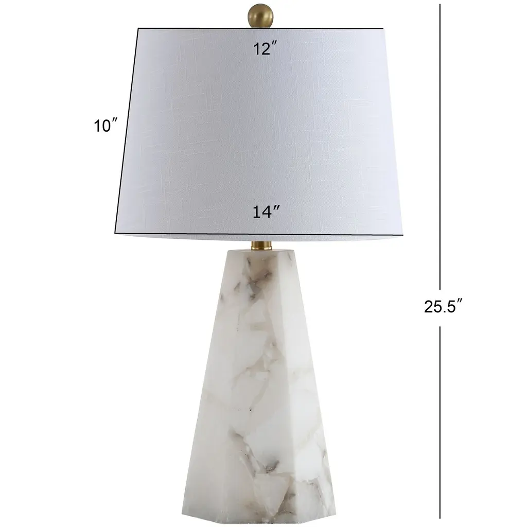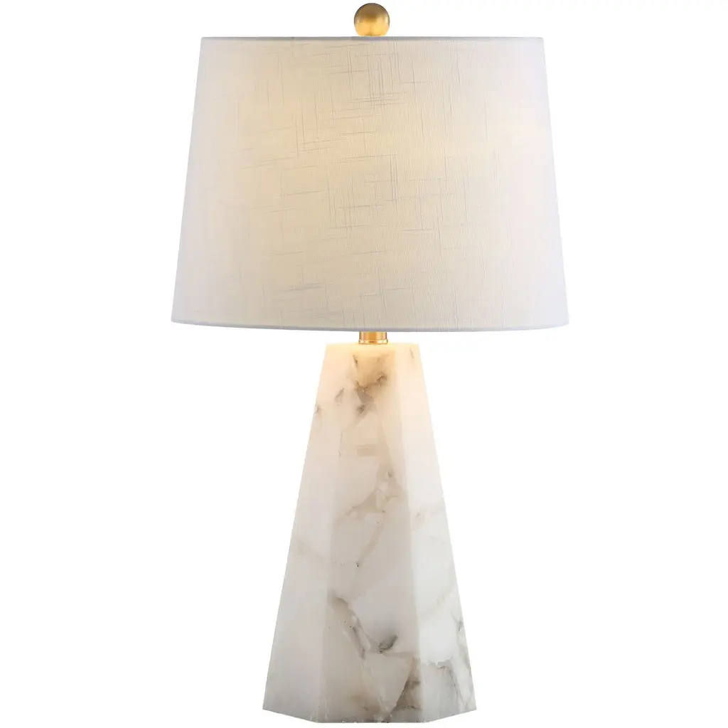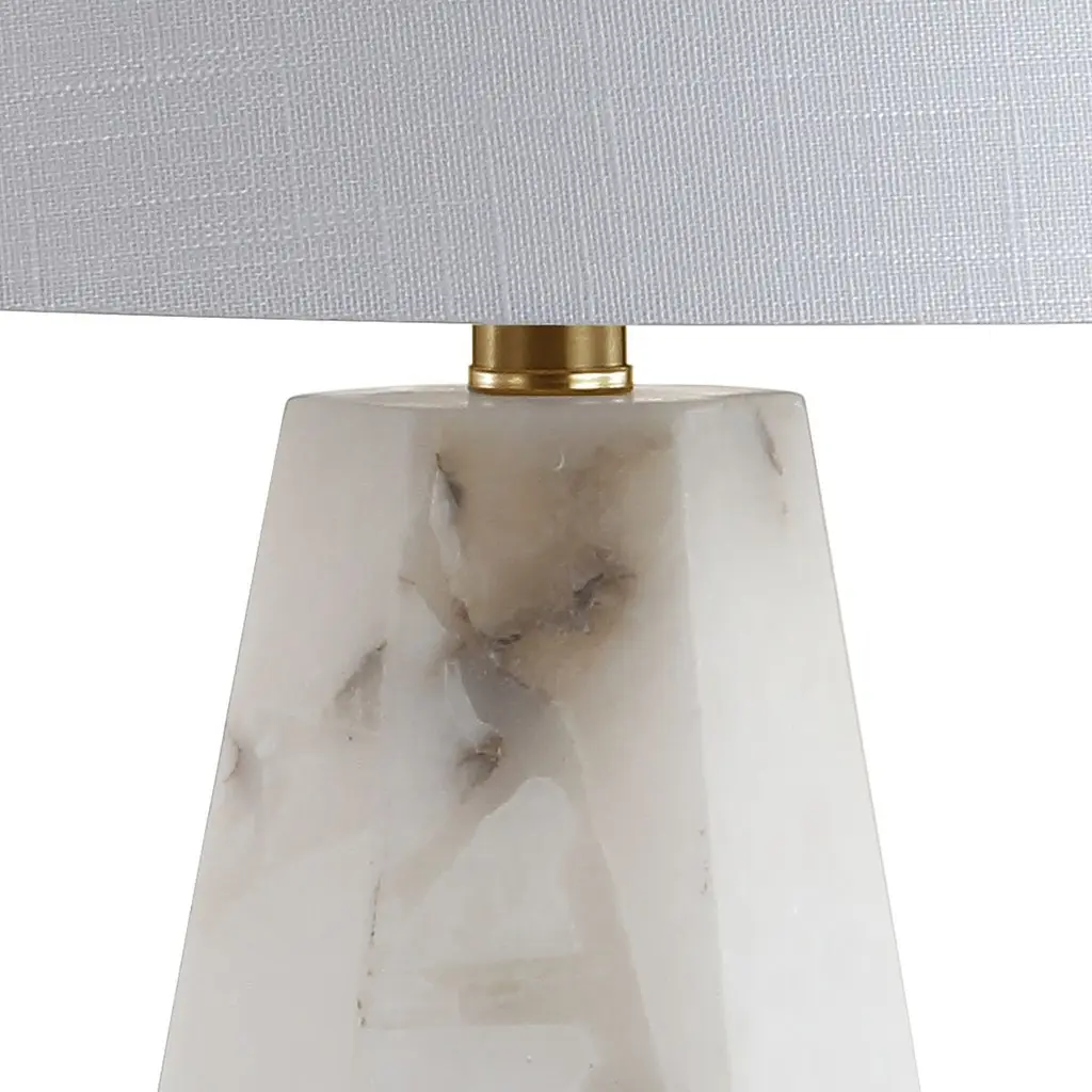Timelessly luxurious alabaster carved into a hexagonal cone forms the body of this table lamp. The brass base and finial add quiet glamour, while the linen shade and the silk-wrapped cord emphasize the lamp's elegance.