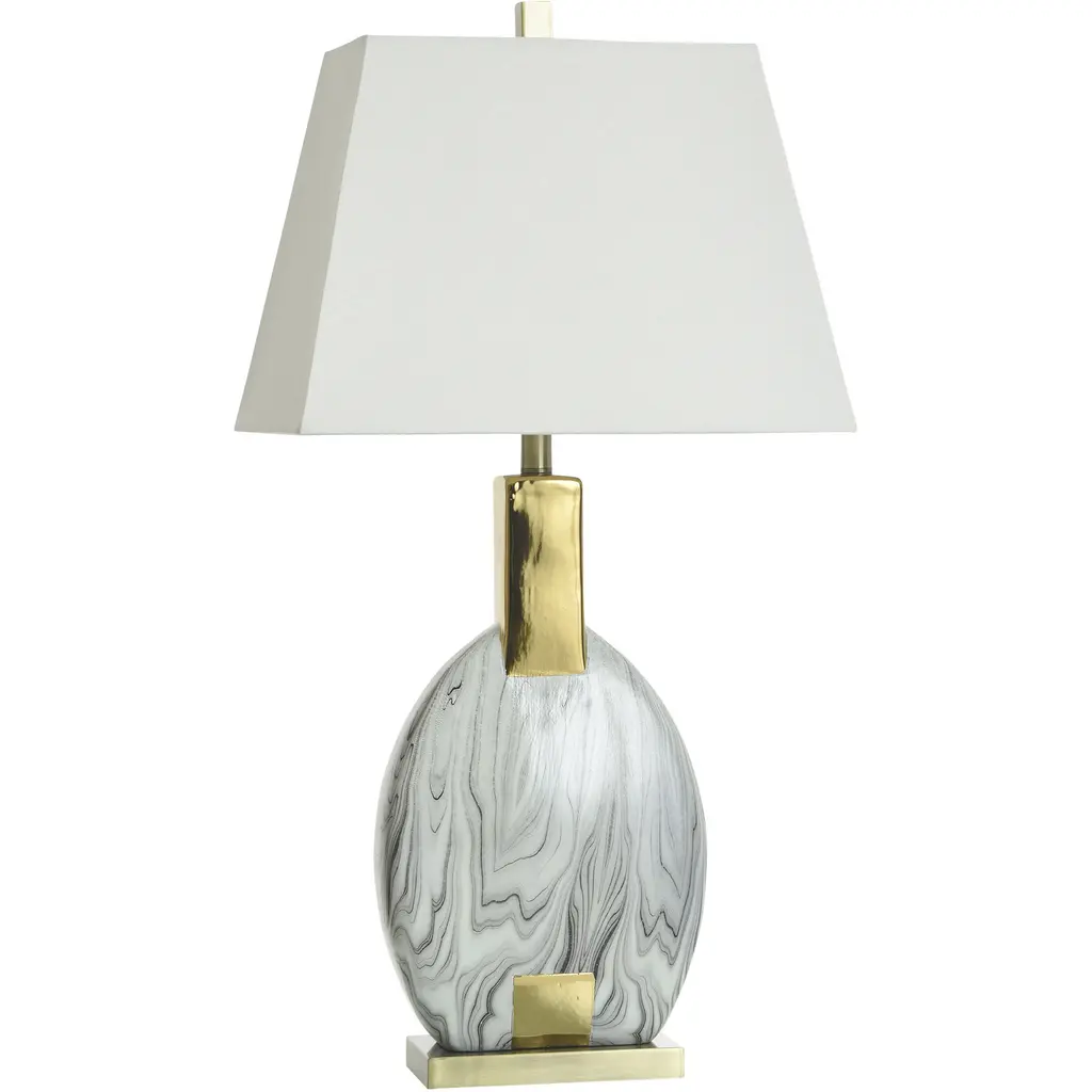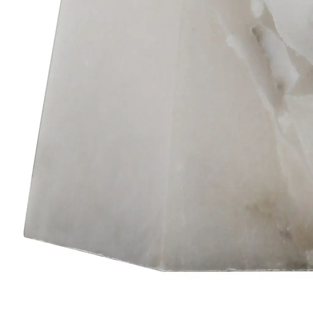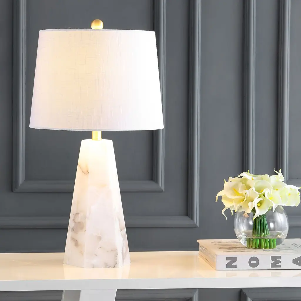 Timelessly luxurious alabaster carved into a hexagonal cone forms the body of this table lamp. The brass base and finial add quiet glamour, while the linen shade and the silk-wrapped cord emphasize the lamp's elegance.