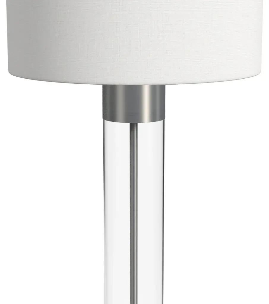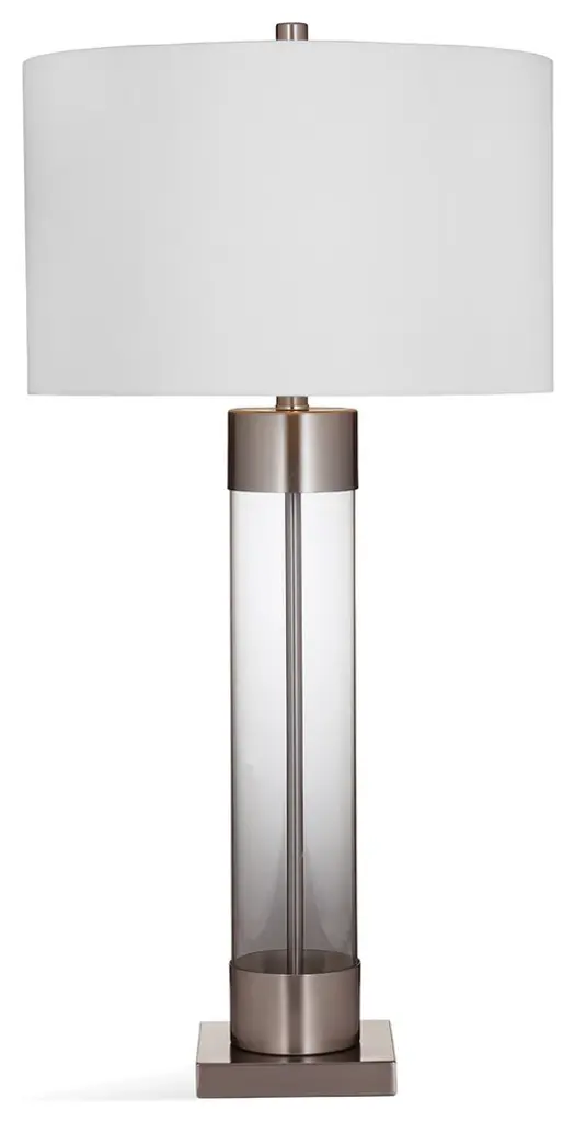 The Tennison Table Lamp is crafted of clear glass and brushed nickel with a white drum shade.Features:The tall clear lamp body and brushed nickel base provide contemporary stylingFeatures a white, fabric, drum-shaped lamp shadeFeatures a two way light switchLamp cord measures 60" allowing for easy placementBulb type a required, not includedEasy assembly - just attach harp, finial and shadeFor over a century, Bassett Mirror has been synonymous with style and quality, transforming homes with its sophisticated and timeless designs. With a wide-ranging collection of furniture, lighting, mirrors, and art, Bassett Mirror seamlessly blends modern style with classic appeal. From rustic modern to luxe glam, each piece is thoughtfully crafted to inspire and elevate any space. Committed to exceptional value and customer care, Bassett Mirror makes it easy for homeowners to create beautiful, personalized interiors with confidence.
