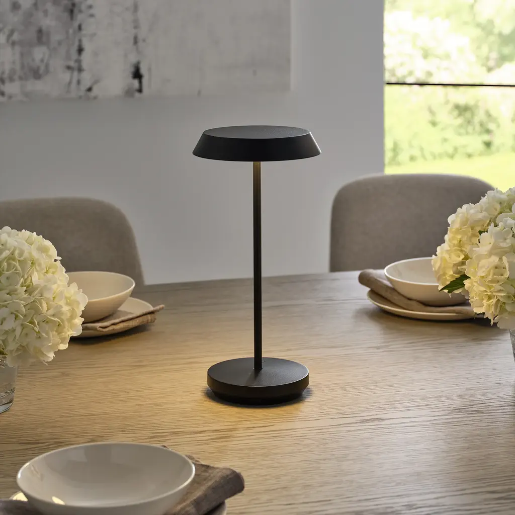 The Tepa Portable LED Table Lamp from Visual Comfort Modern offers soft, energy efficient illumination for tasks and ambiance. With a chic and minimalist design, this lamp can easily move from room to room with you. Its designer finish, complemented by a tapering disc shade and slim post, creates a clean-lined silhouette that blends seamlessly in any contemporary living space. Say goodbye to cords and hello to convenience with its rechargeable feature. Brighten up your space with style and efficiency. Highlights