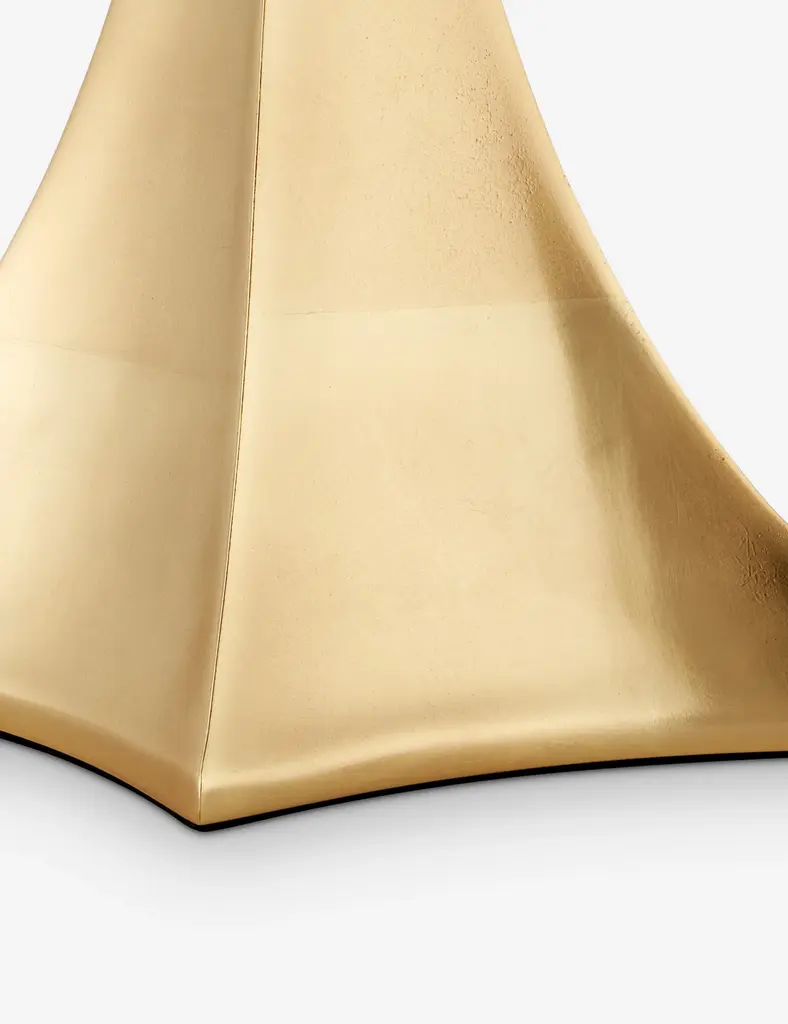 The Tetra table lamp adds sculptural polish with its gold-toned finish and curved base. The softened geometric lines and crisp drum shade strike a modern profile with plenty of warmth. Style this lamp on a console or buffet to catch the light and elevate your space.