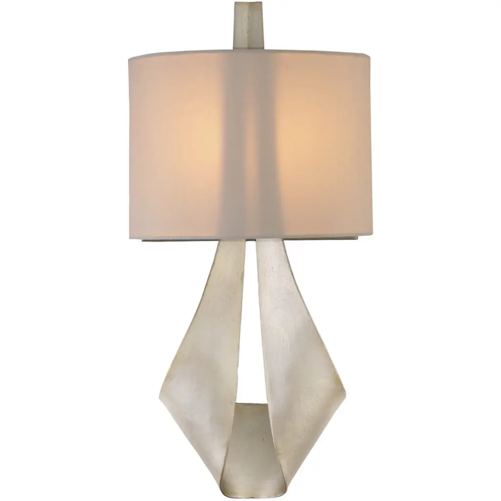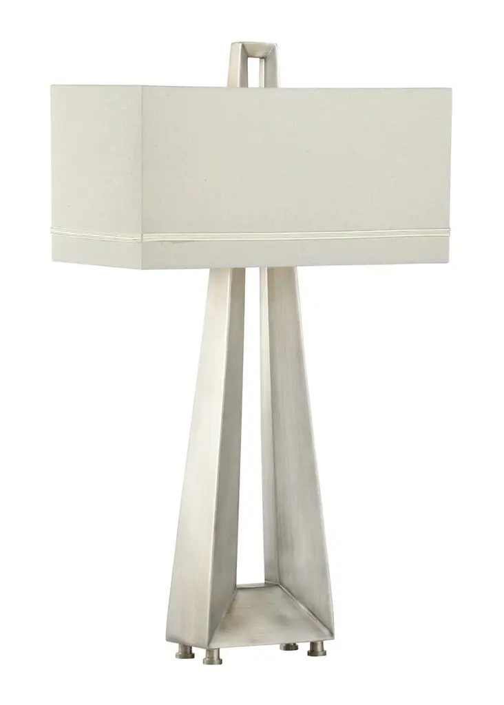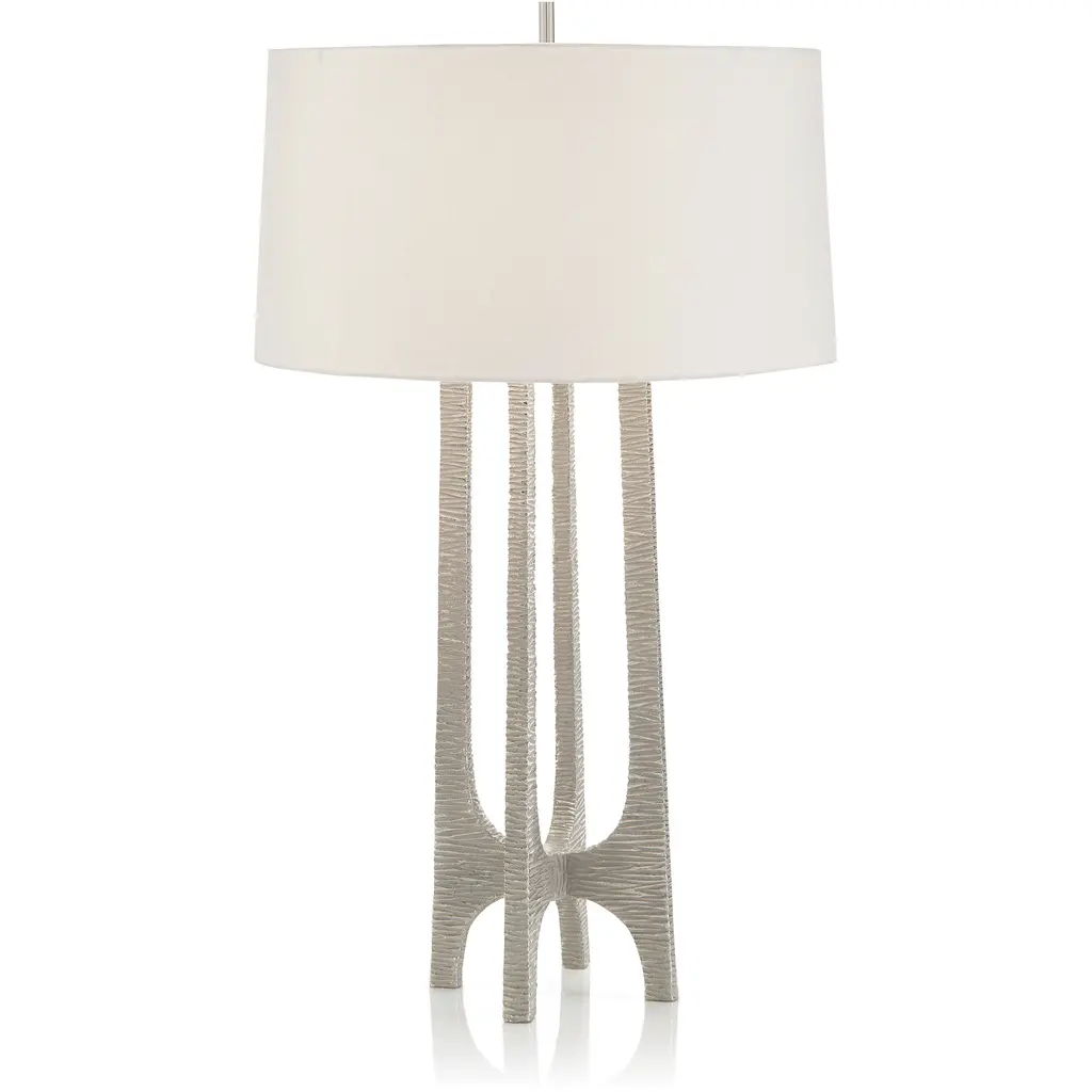 31.5"H A striated and textured cast metal arc table lamp finished in nickel with a warm wash. Shade: 17" X 18" X 9.5", Off White outside and White inside, Man-Made Linen outside and Cotton inside, Round. 3 Way, 150 Watt Max, Type A Bulb, 8.5" Nickel H