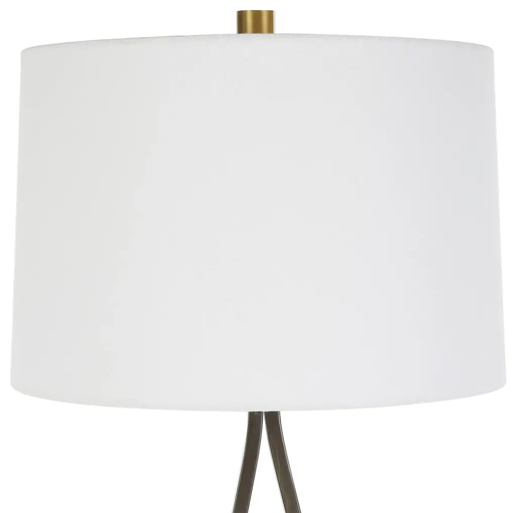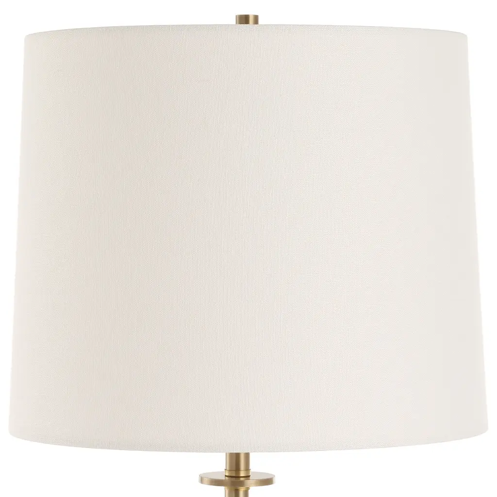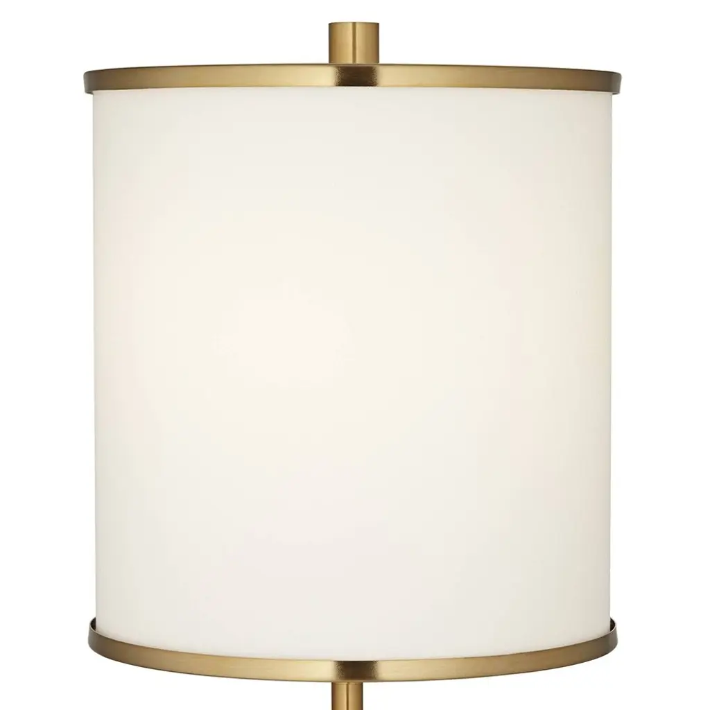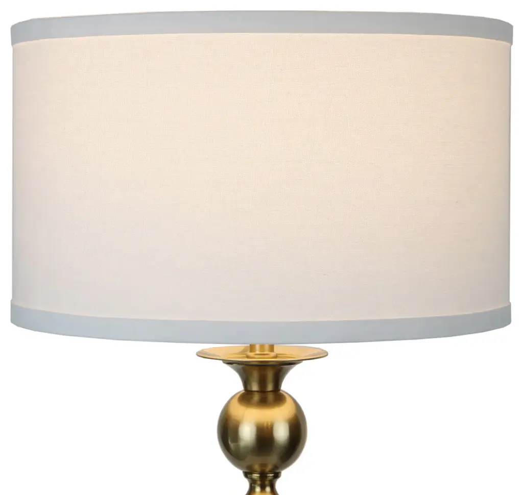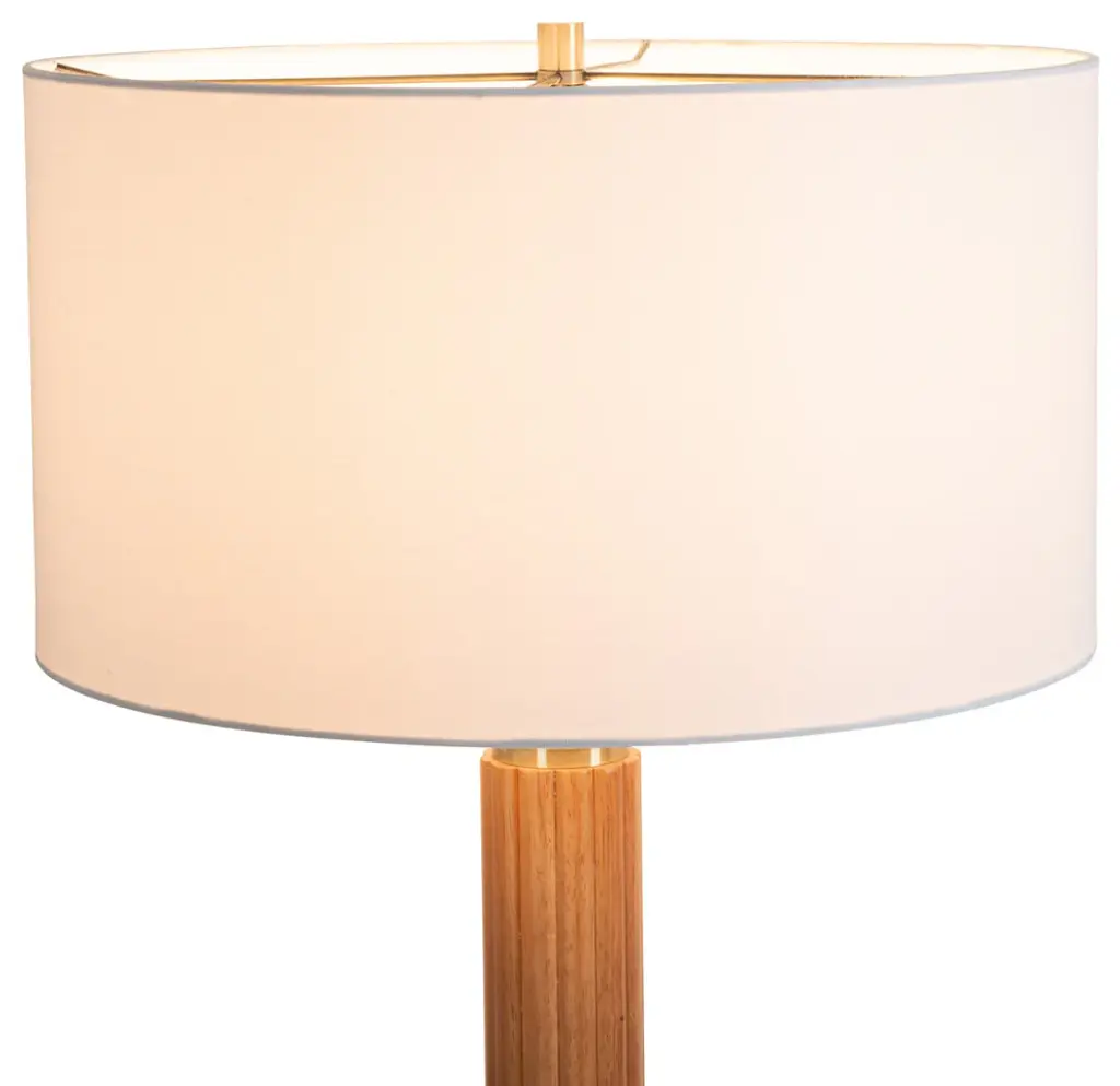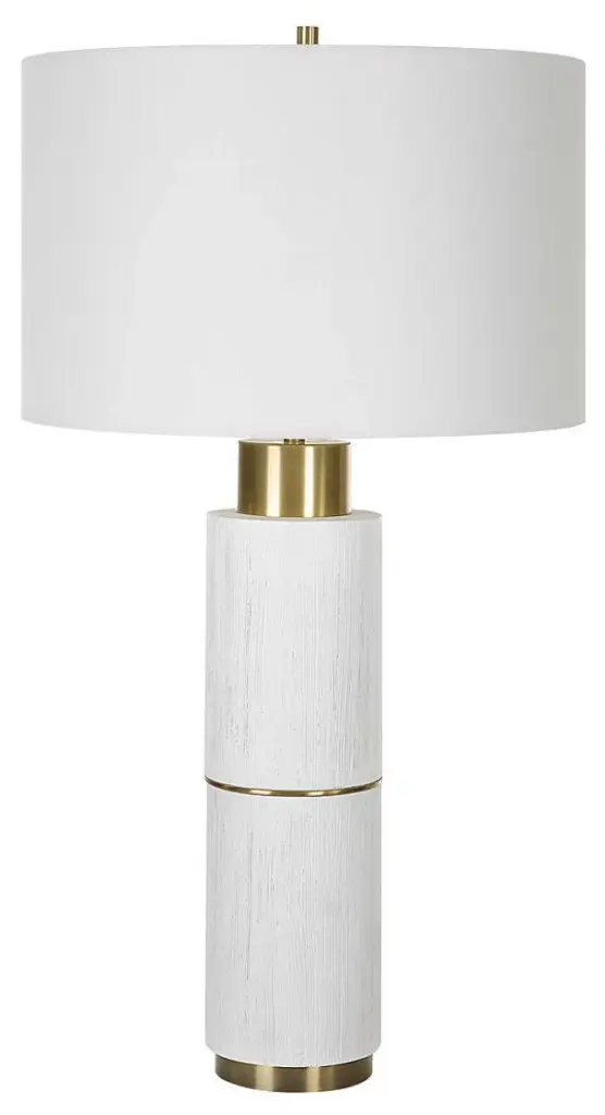 This retro table lamp showcases a whitewashed wood look with a noticeable textured finish, accented by brushed brass plated iron details. Paired with a hardback drum shade in a white linen fabric.30H,���Shade 10H X 16 Dia. (in). Weighs 11 lbs.Hand Finished Resin and MetalUL listed. Uses one max 150W Type A Bulb (not included). 3 Way switch at socket.Heirloom Quality - Expertly hand crafted and hand finished. Due to the hand crafted nature of this piece, each piece may have subtle differences.