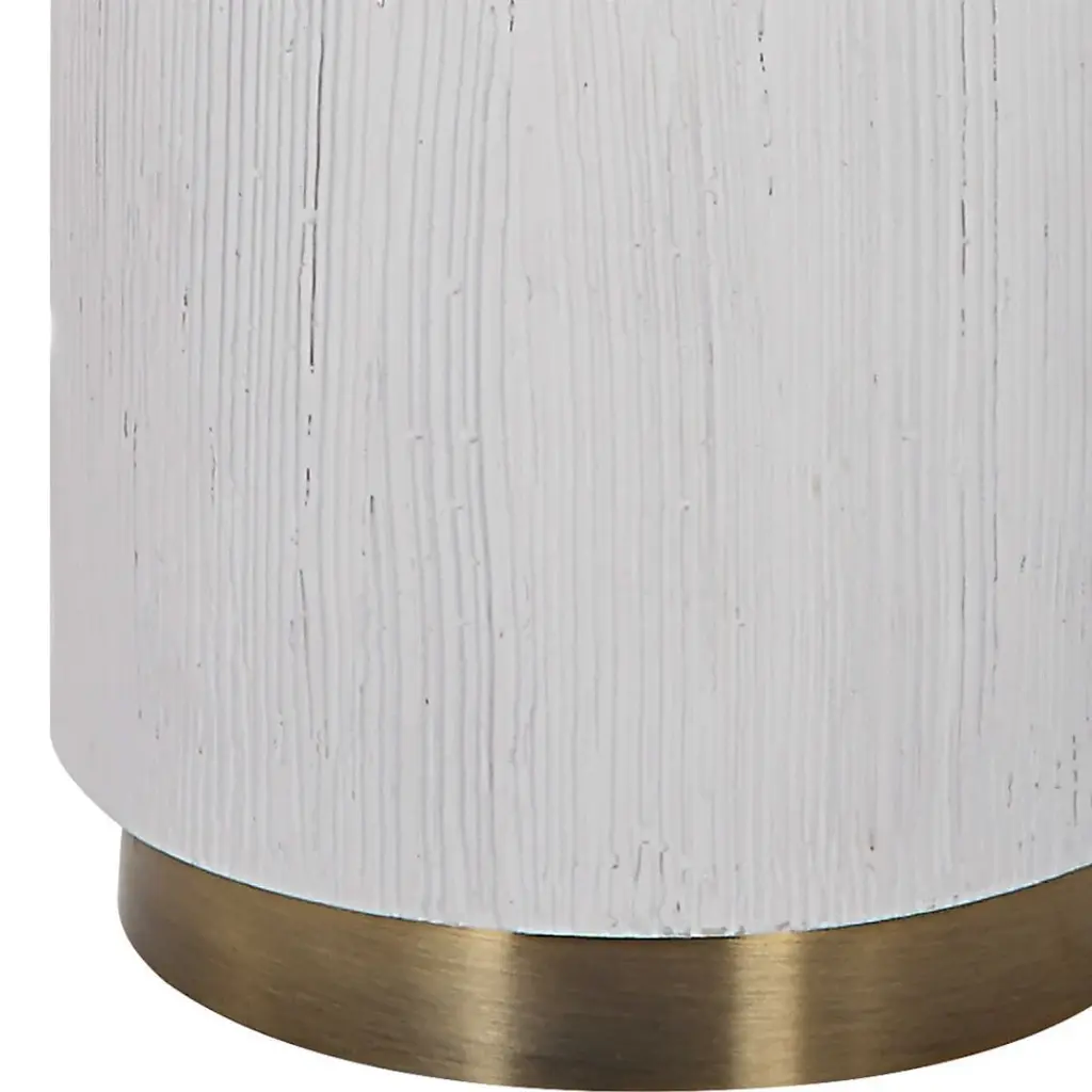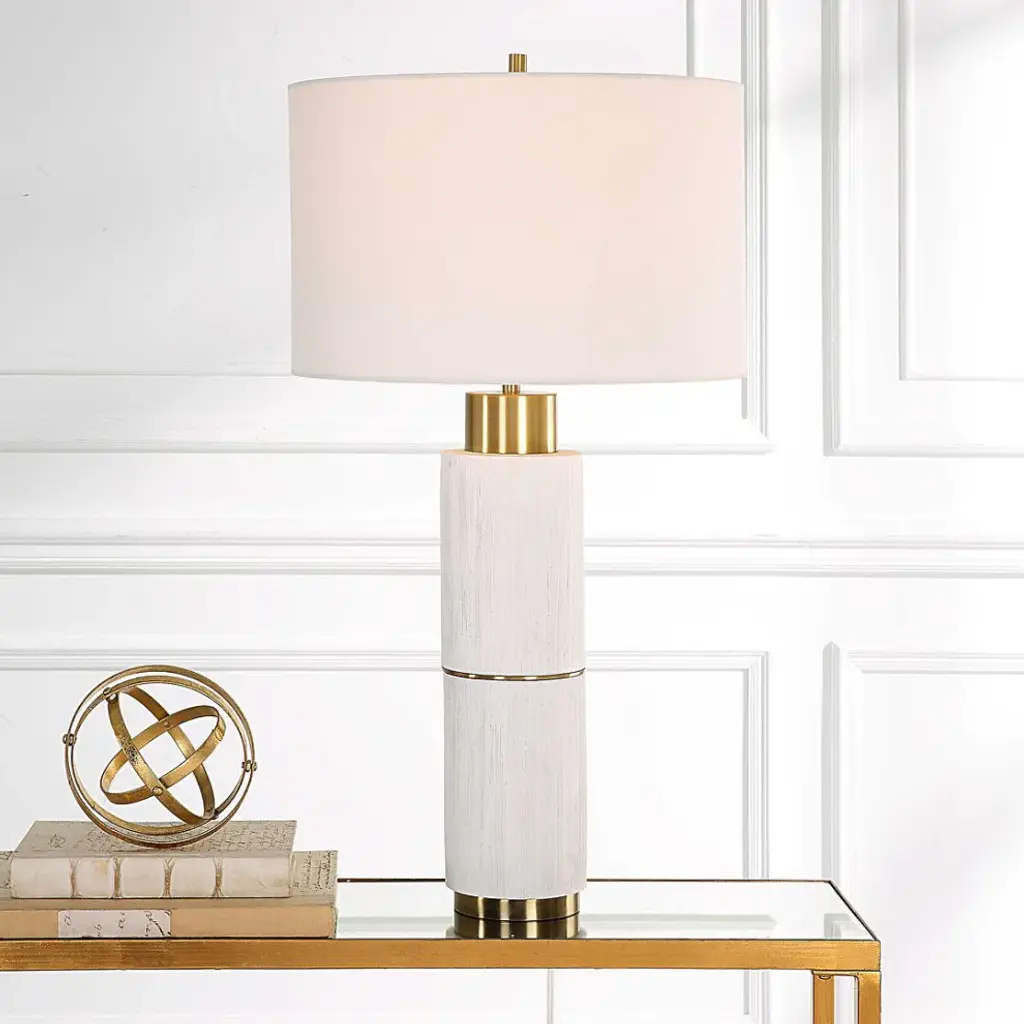 Textured White Faux Wood Column Table Lamp Cylinder Brass Gold Midcentury Modern