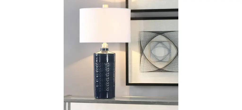Intricately embossed ceramic finished in a royal blue glaze, accented with brushed nickel plated details. The round hardback drum shade is a white linen fabric with natural slubbing.