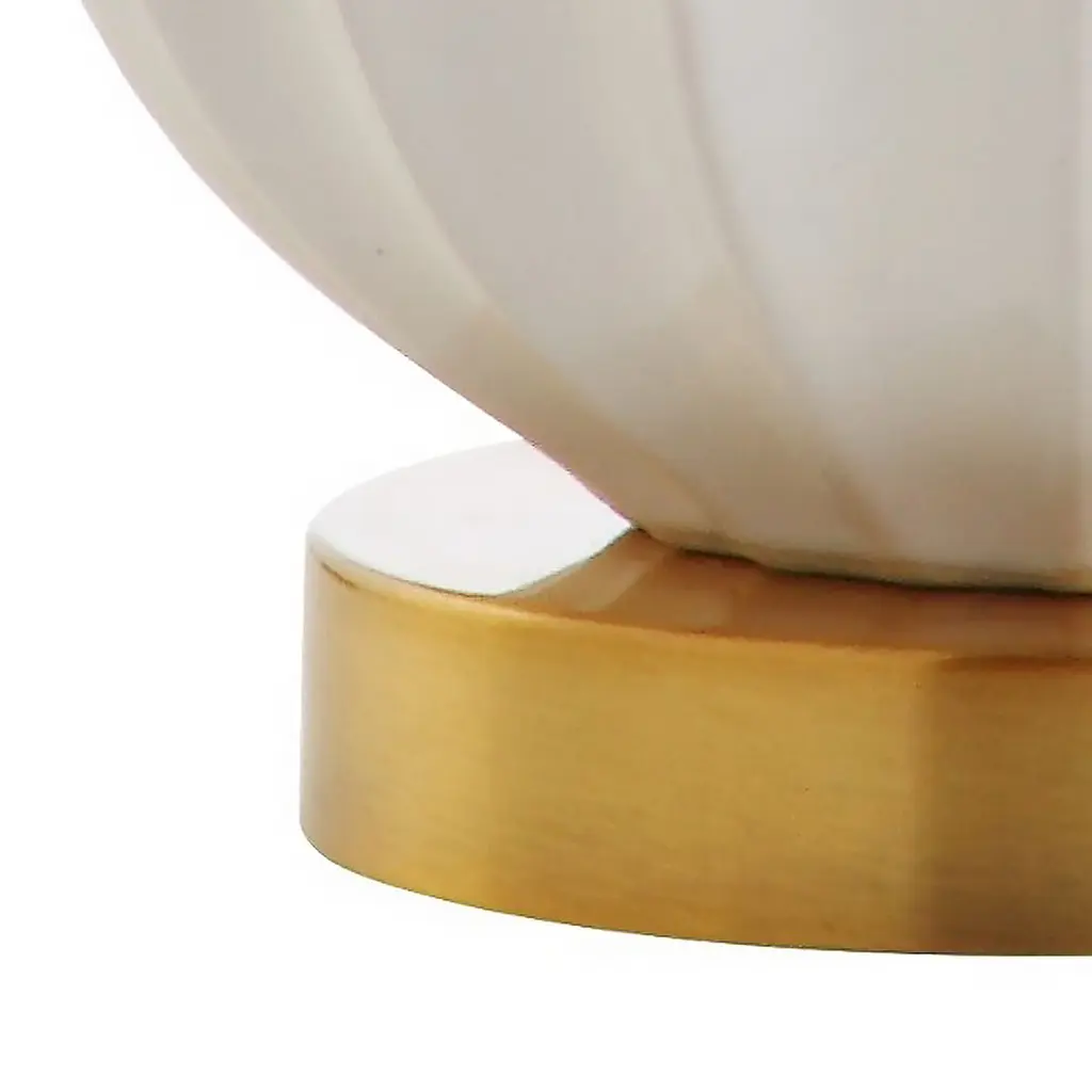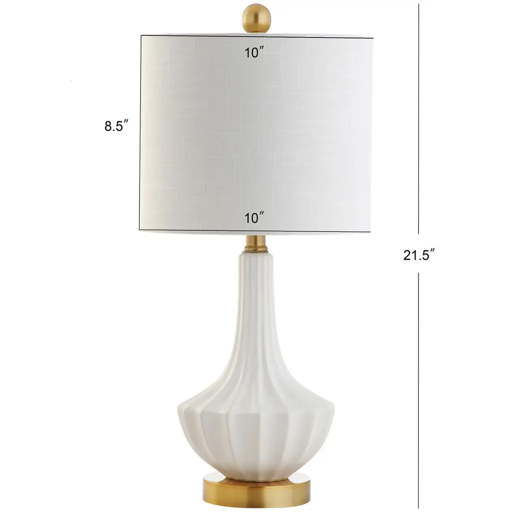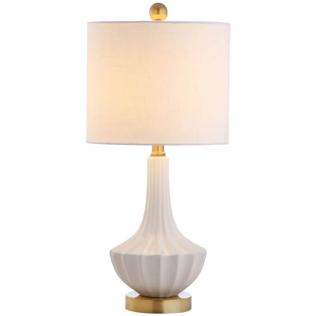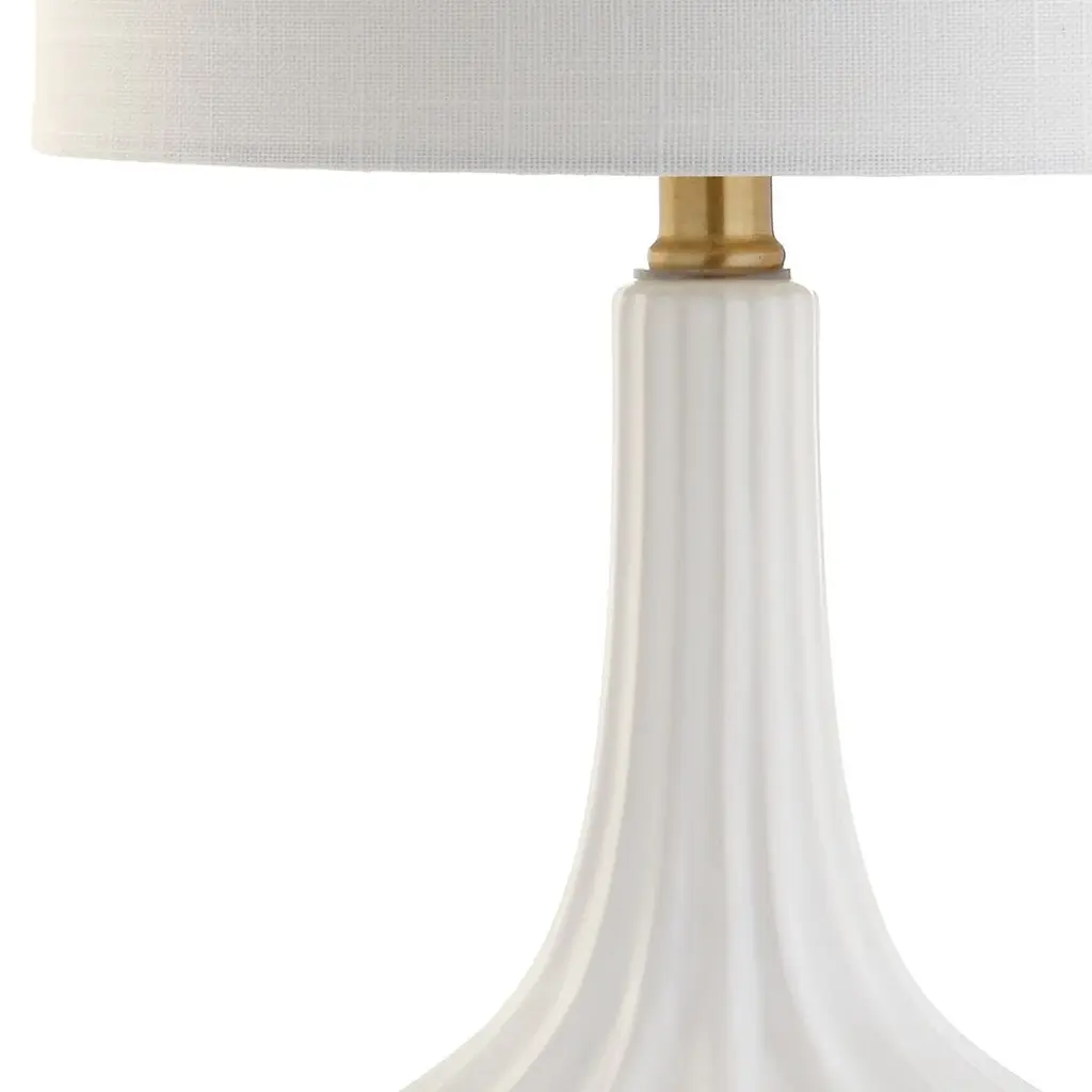 The white glaze accentuates the fluting and curves of this table lamp's shapely ceramic body. The linen shade and the brass base and finial ensure timeless elegance.