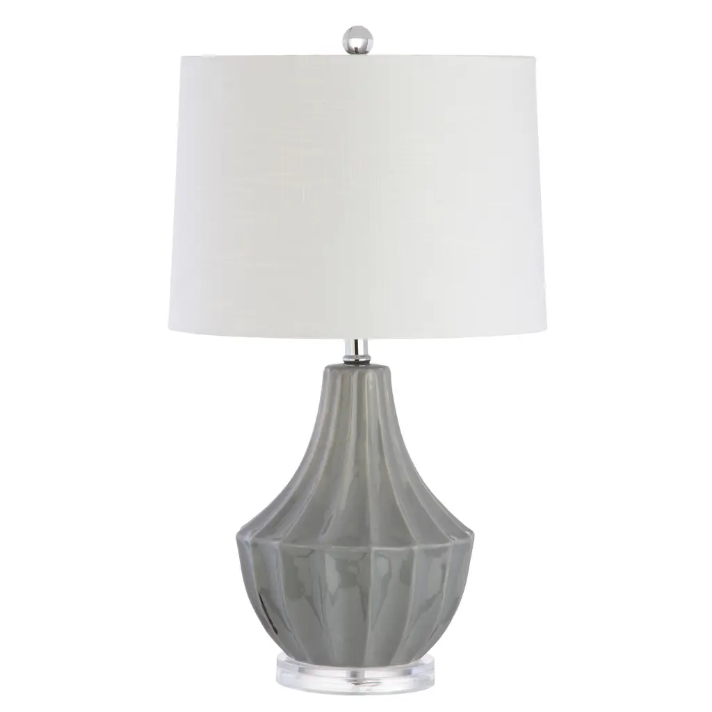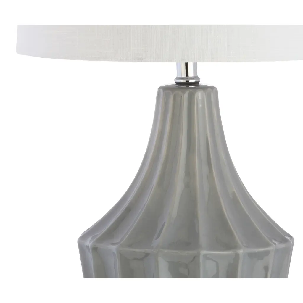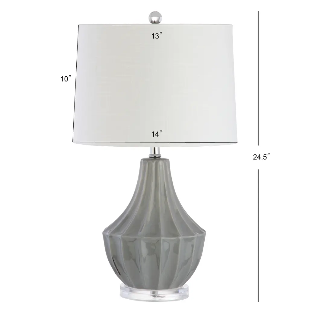Create an inviting and stylish entertaining space with this fun ceramic gourd table lamp. A combination of a quirky pear shape and classic Roman fluting make it the perfect accent for a variety of decor styles. Topped with a drum lampshade and crystal finial to complete the look, the style extends all the way to the plug with a silk-wrapped cord. Features:Dimensions:About us:You see a lamp.We see a decorative work of art.A perfectly curved shade casts a dramatic shadow on a floor. A silk cord you never want to hide. LED lightbulbs: as easy on the environment as they are on the eyes. The JONATHAN Y Lighting collection considers every detail from impeccably sourced materials to designer styling. And our prices are so attractive, we've transformed a functional necessity into a fashion accessory.JONATHAN Y Lighting - a fashion revolution in home decor.