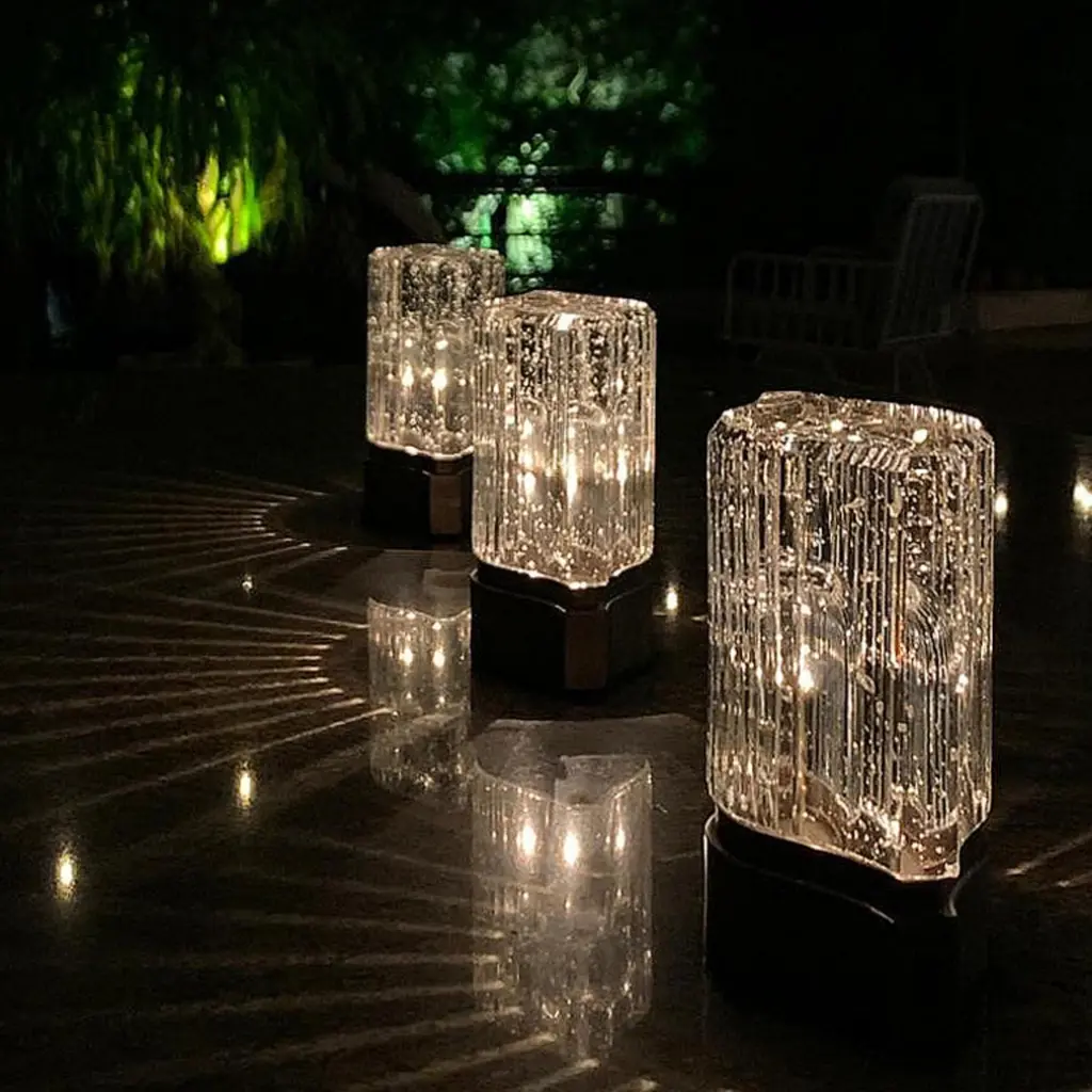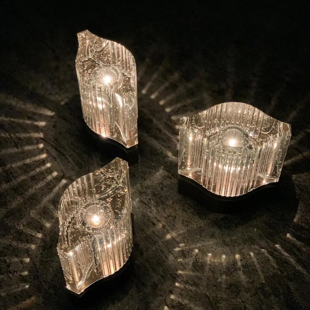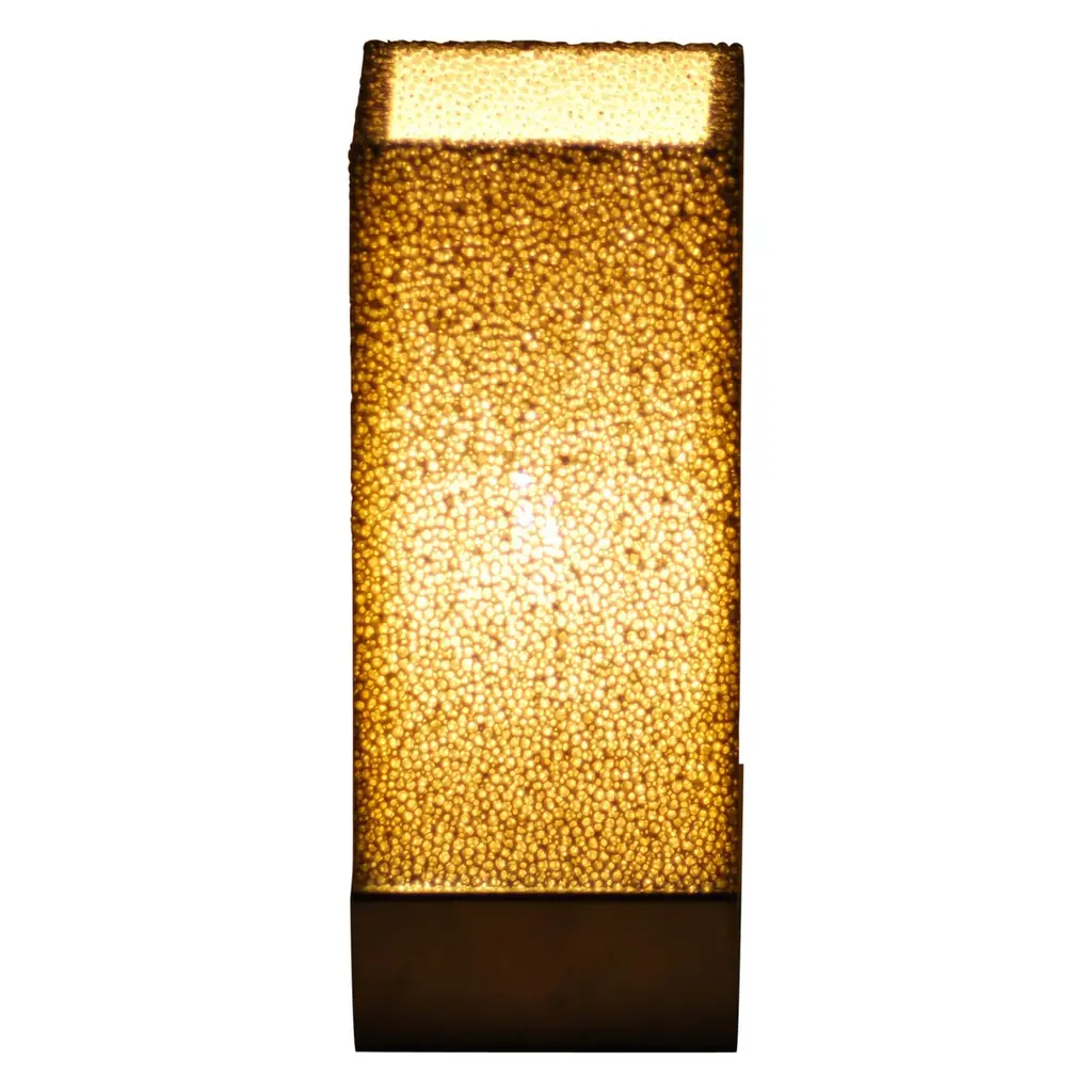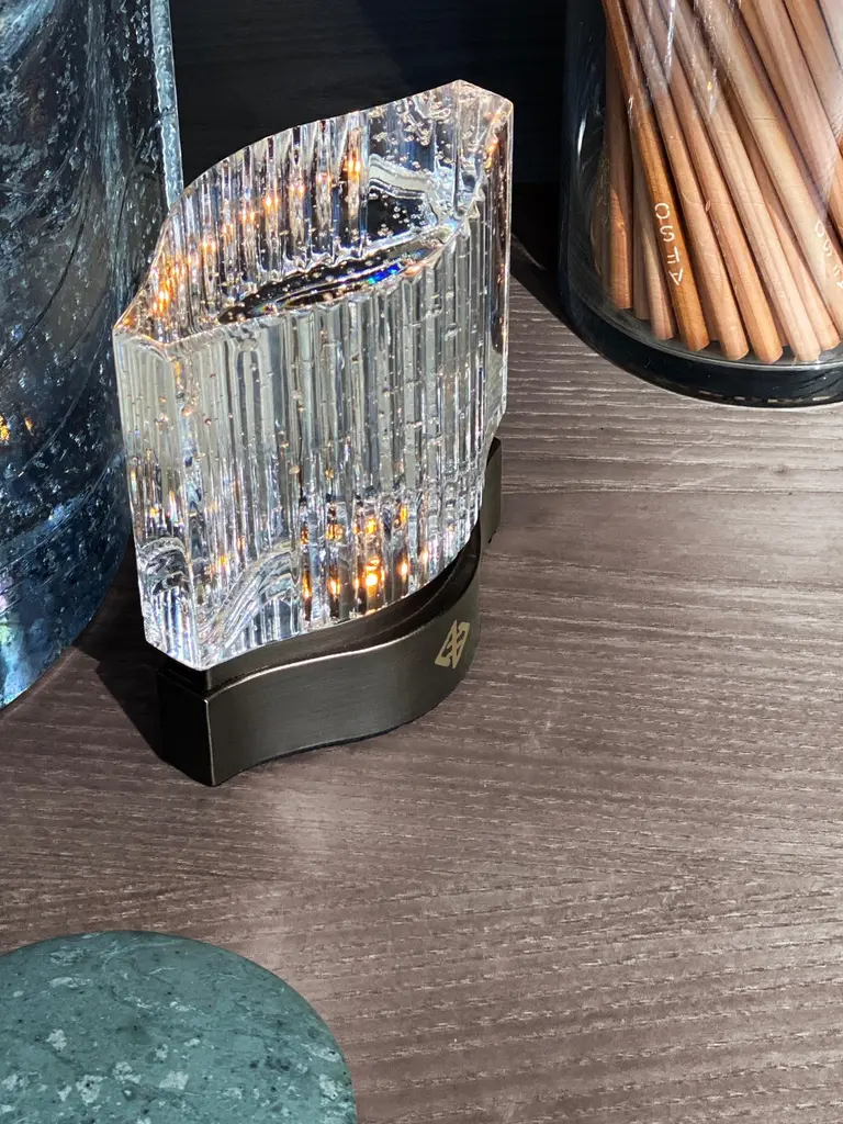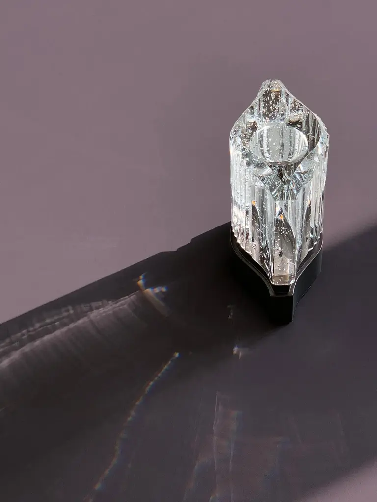 inspired by the classic glass brick, a symbol of modernist architecture in the 1960s, this crystal brick lamp is sculptural in spirit. its magic also lies in the glistening uplit effect created by an array of bubbles within the brick, alongside a radial light beams caste onto the adjacent surfaces.